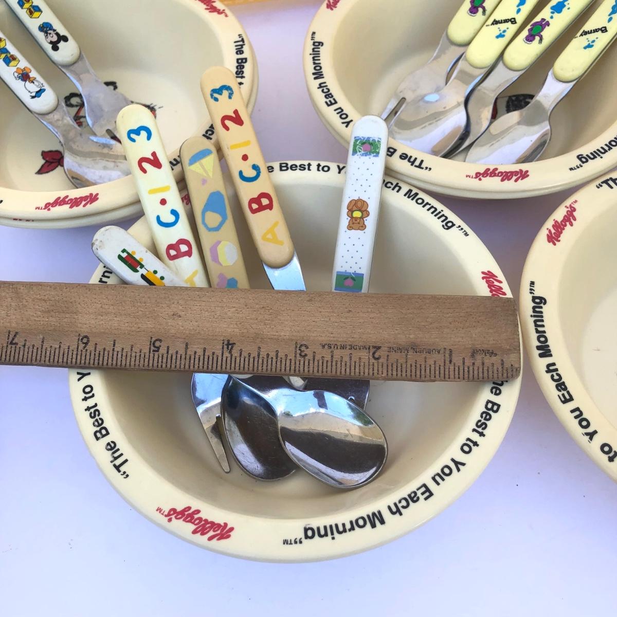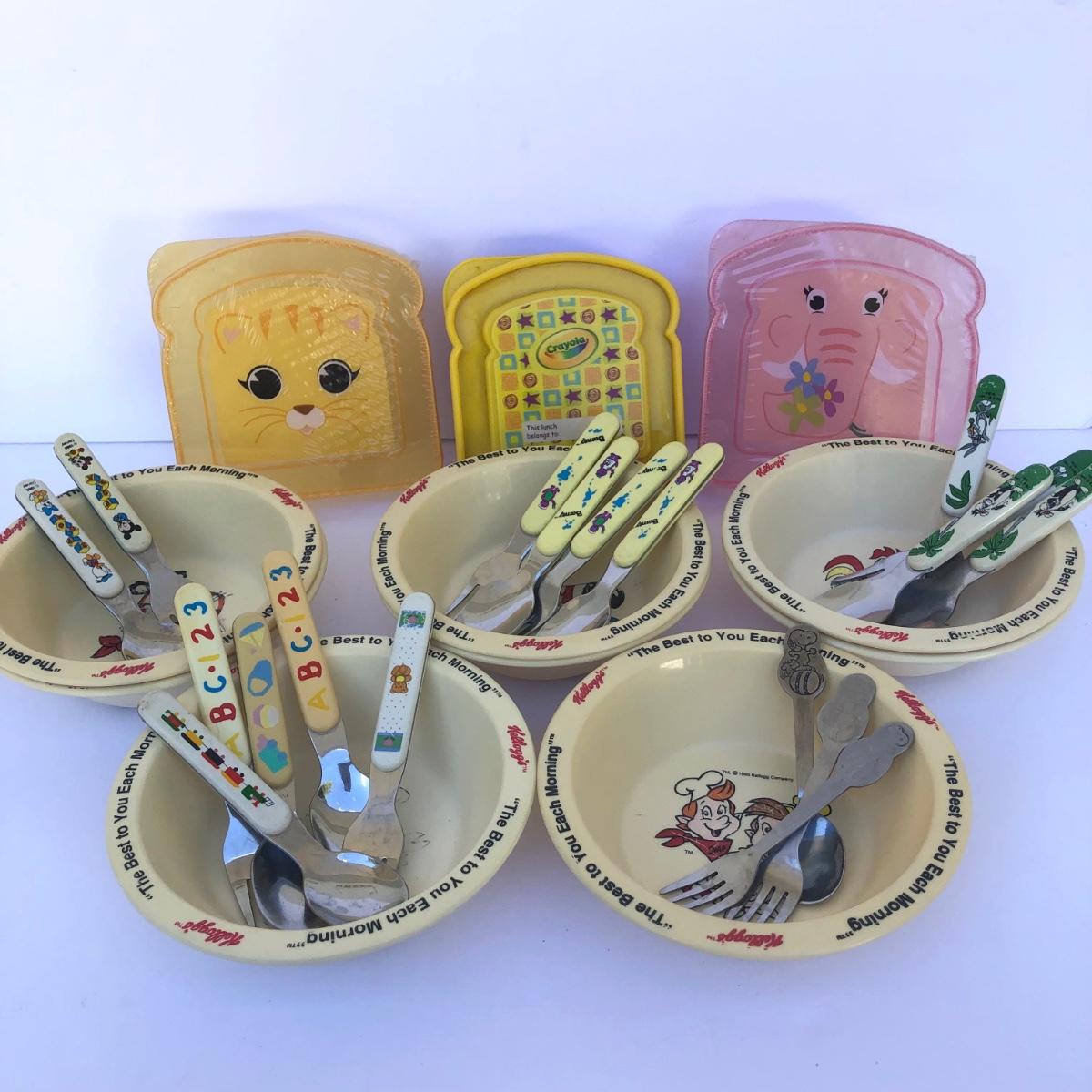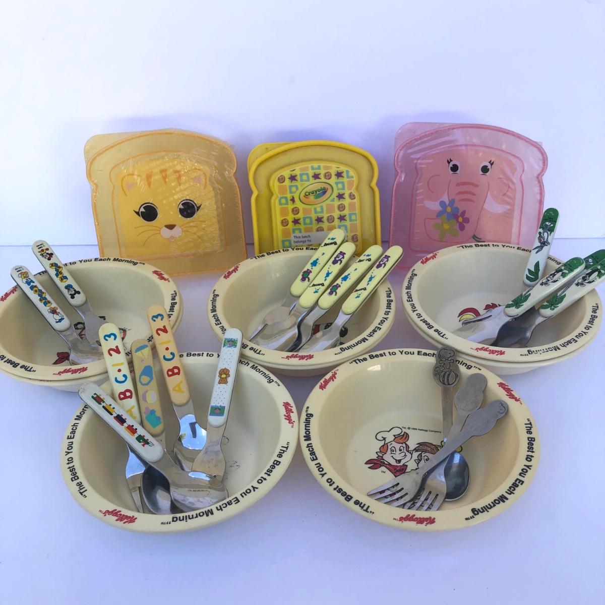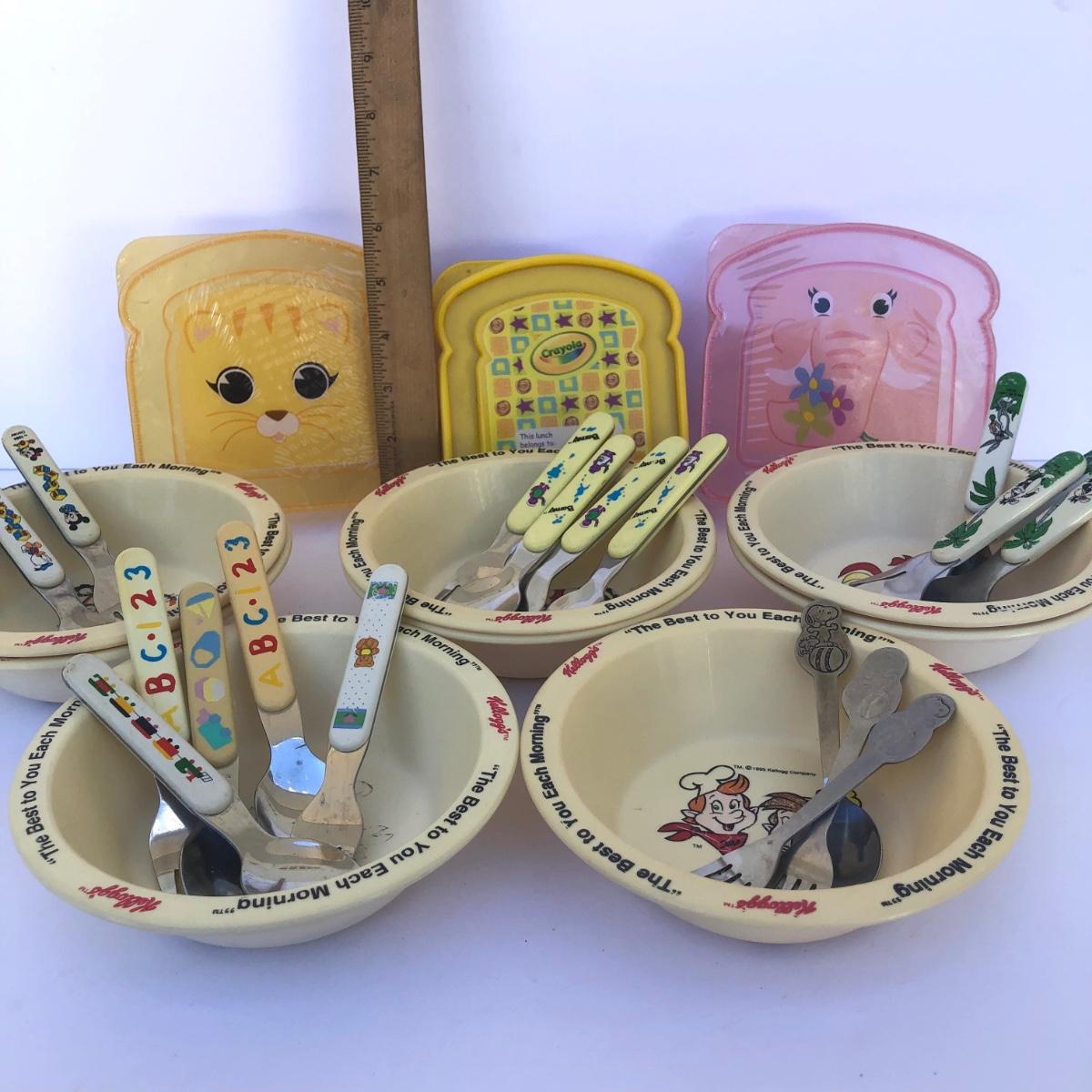 LOT 40G: Vintage Collectible Kellogg's Plastic Cereal Bowls, Kid's Sandwich Containers & Vintage Children's Utensils - Danara 1958 Snoopy, 1984 Disney, 1992 Barney & 1991 Looney Tunes