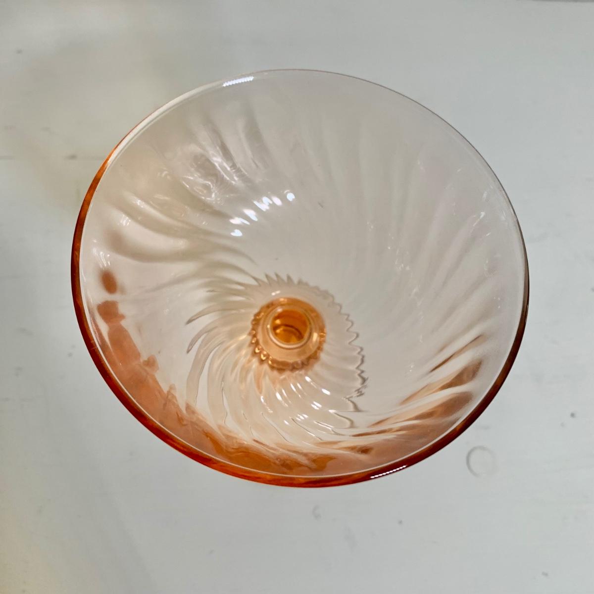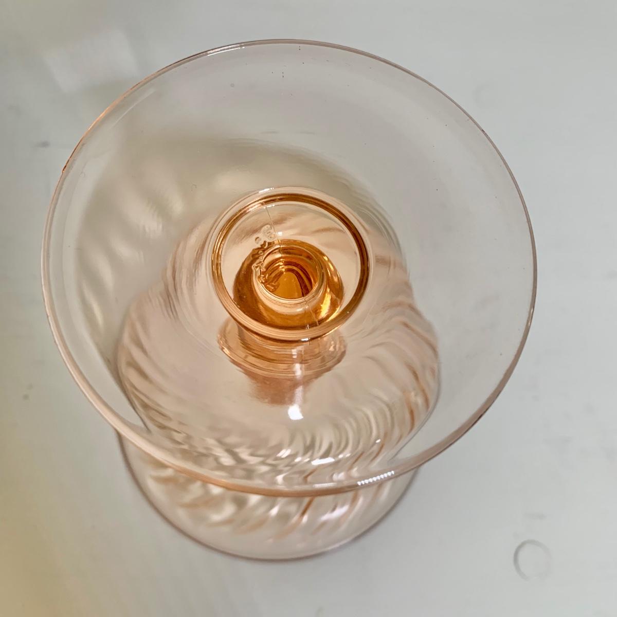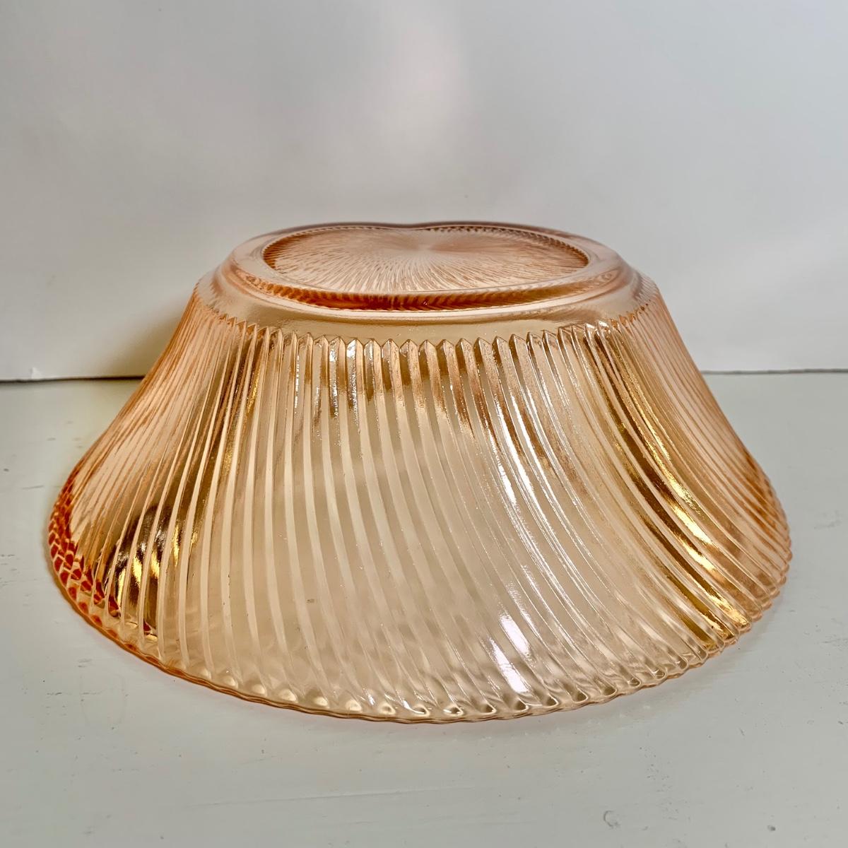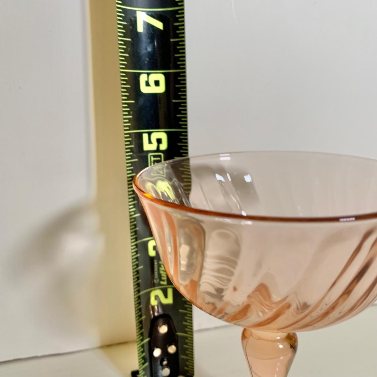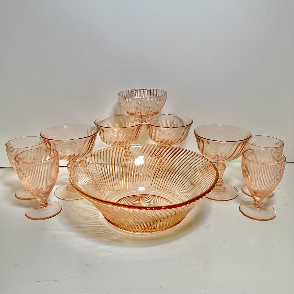 LOT 100 L: Pink Depression Glass Collection: Arcoroc Luminarc Rosaline Swirl Champagne & Queen Mary Sherbet Glasses, Federal Glass Diana Swirl Serving Bowl, & Jeannette Homespun Juice Glasses
