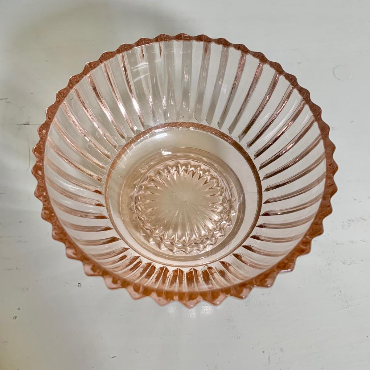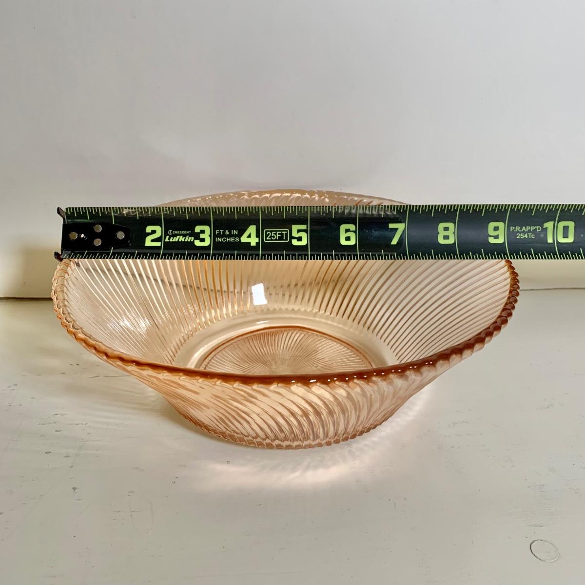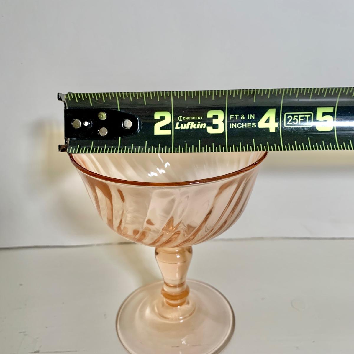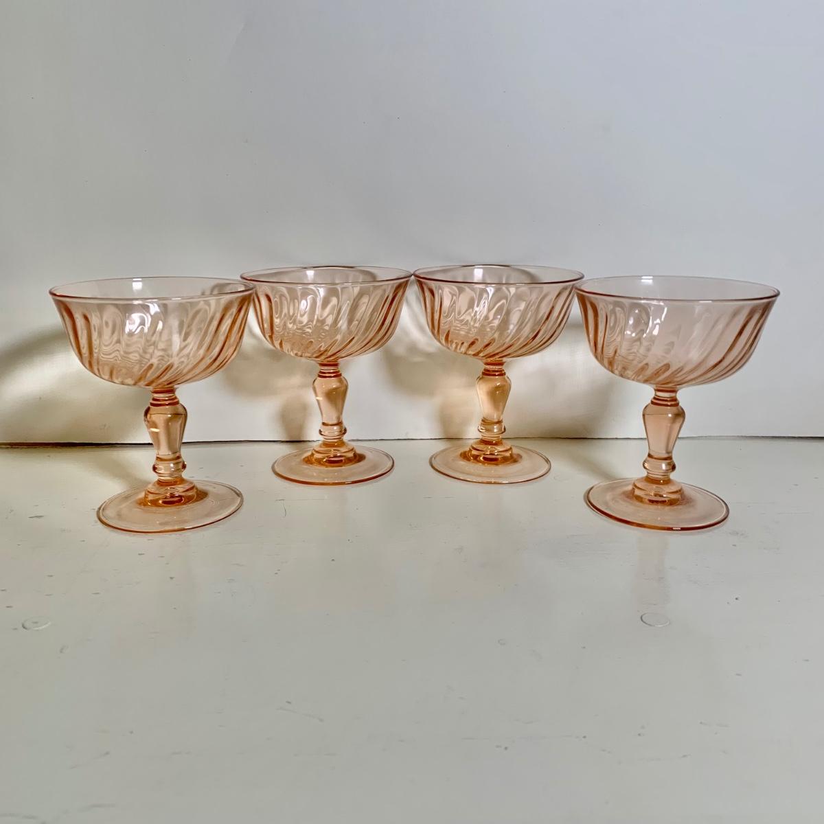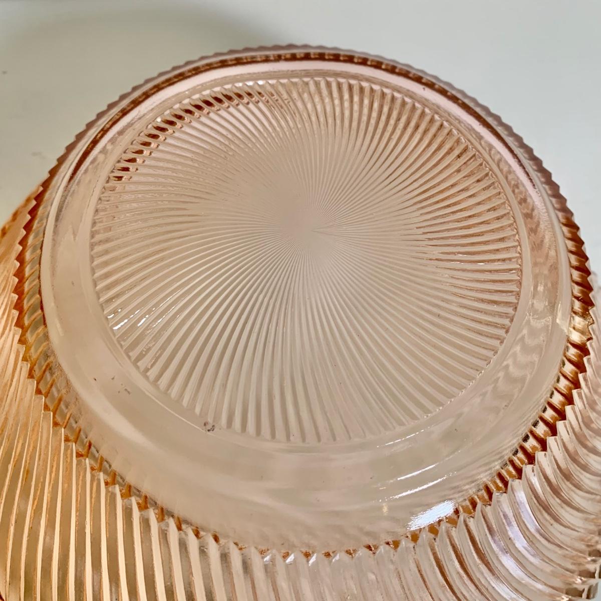 LOT 100 L: Pink Depression Glass Collection: Arcoroc Luminarc Rosaline Swirl Champagne & Queen Mary Sherbet Glasses, Federal Glass Diana Swirl Serving Bowl, & Jeannette Homespun Juice Glasses