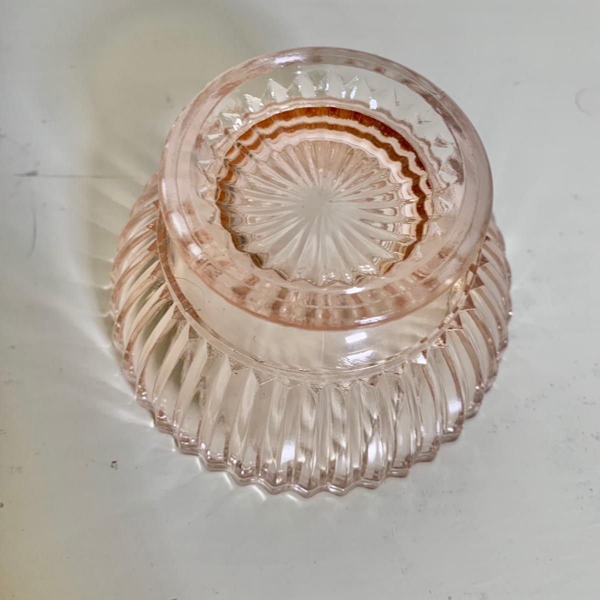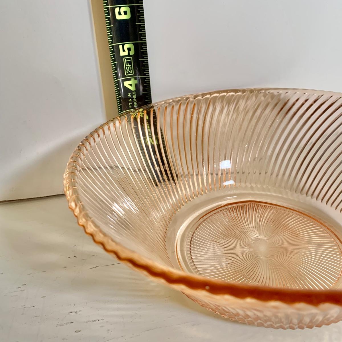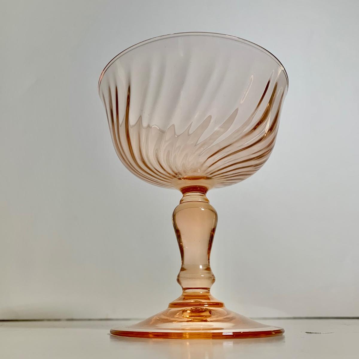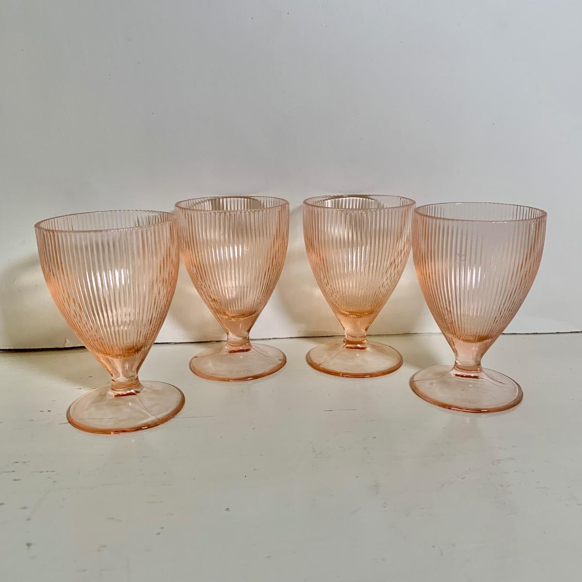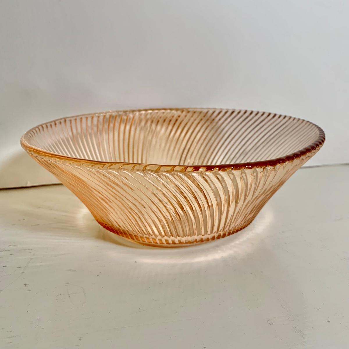 LOT 100 L: Pink Depression Glass Collection: Arcoroc Luminarc Rosaline Swirl Champagne & Queen Mary Sherbet Glasses, Federal Glass Diana Swirl Serving Bowl, & Jeannette Homespun Juice Glasses