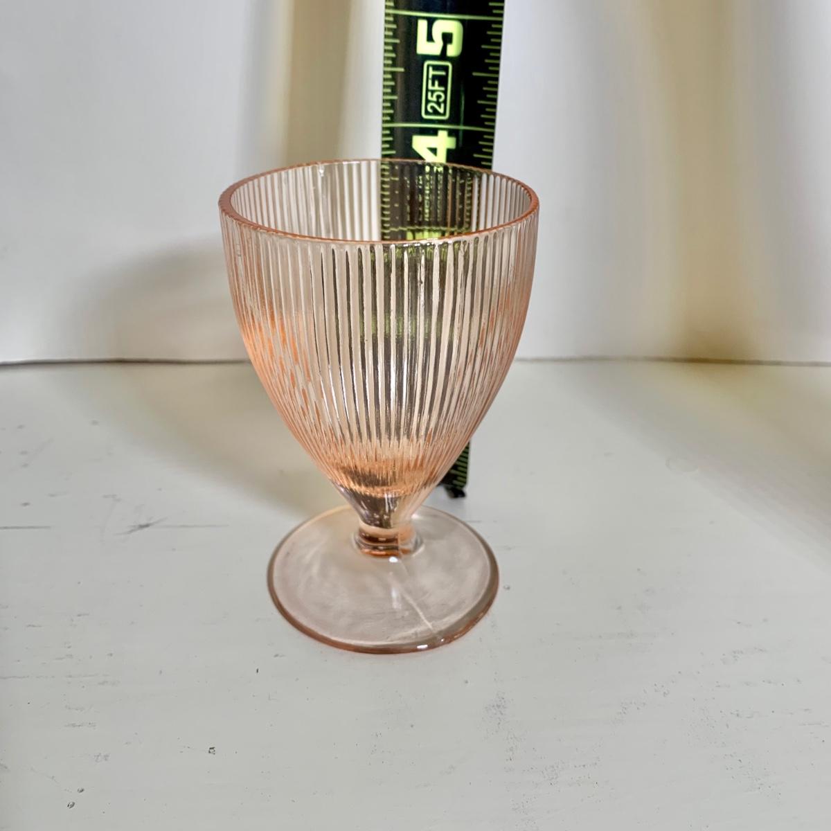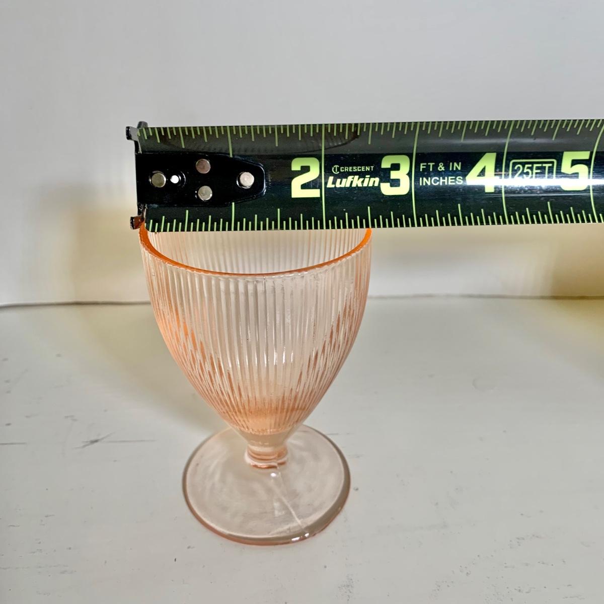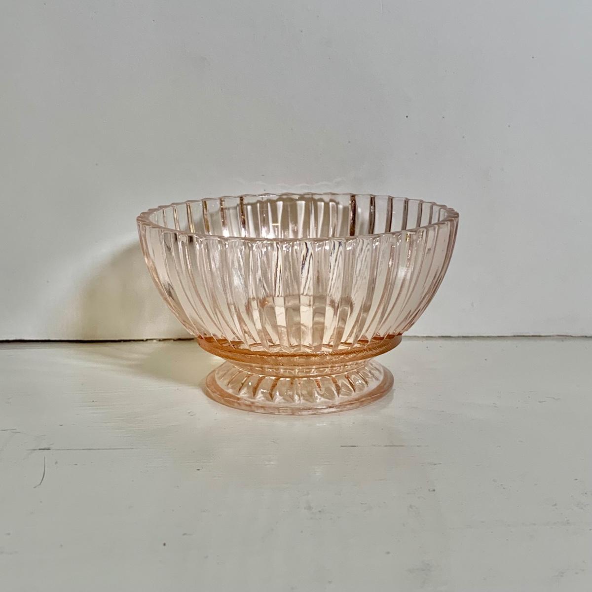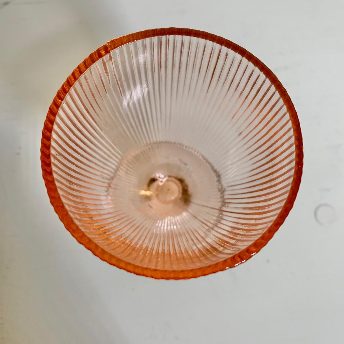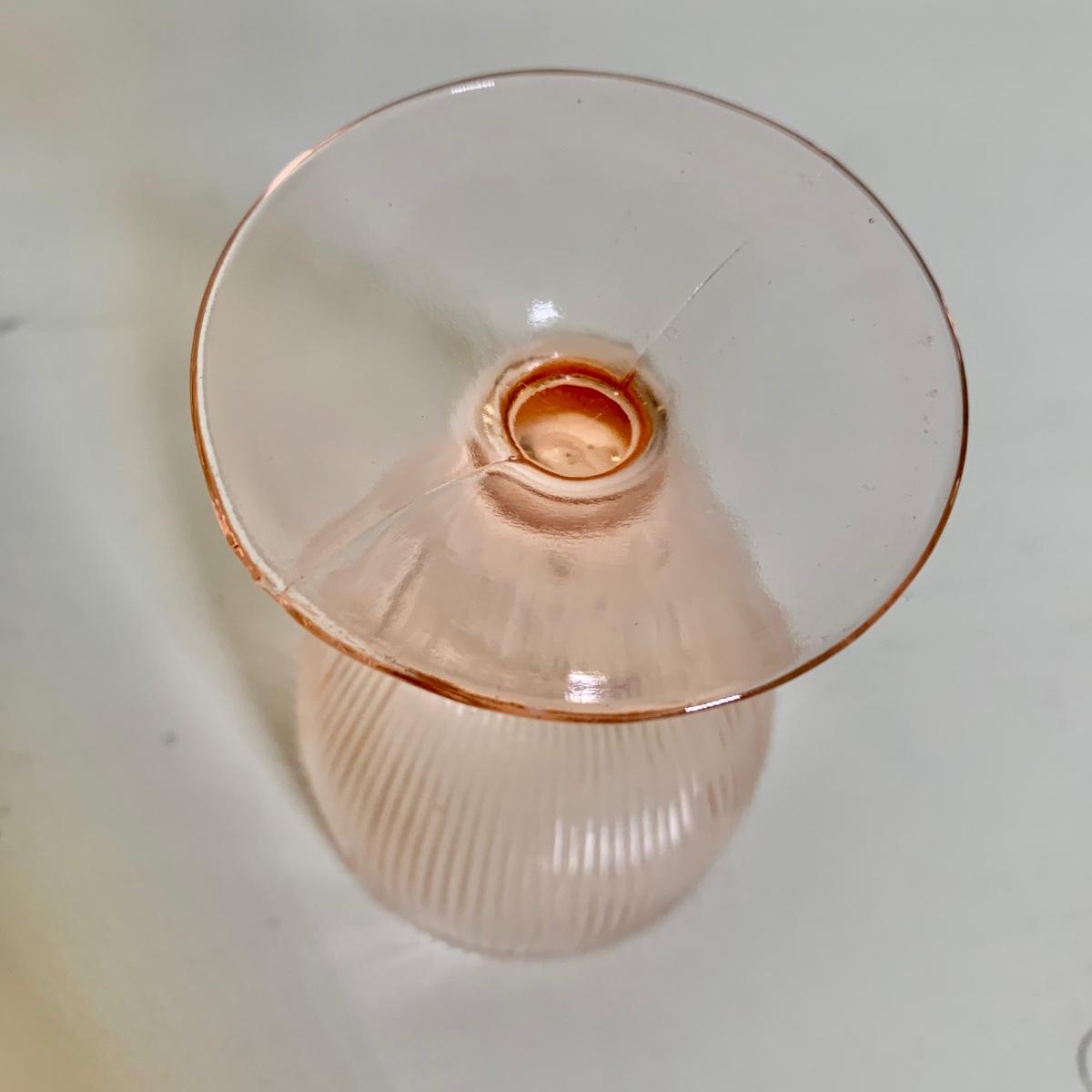 LOT 100 L: Pink Depression Glass Collection: Arcoroc Luminarc Rosaline Swirl Champagne & Queen Mary Sherbet Glasses, Federal Glass Diana Swirl Serving Bowl, & Jeannette Homespun Juice Glasses