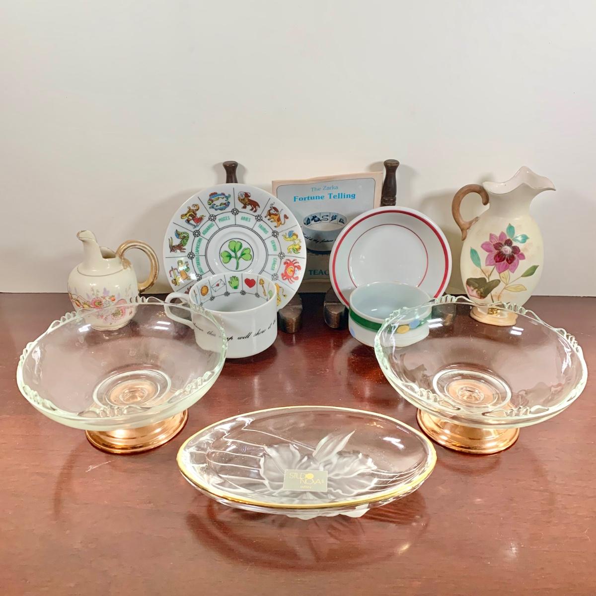 LOT 108 L: The Zarka Fortune Telling Teacup, Ceramic Bud Vases, Studio Nova Japan Frosted Iris Trinket Dish, & More