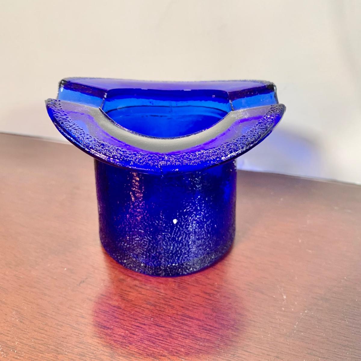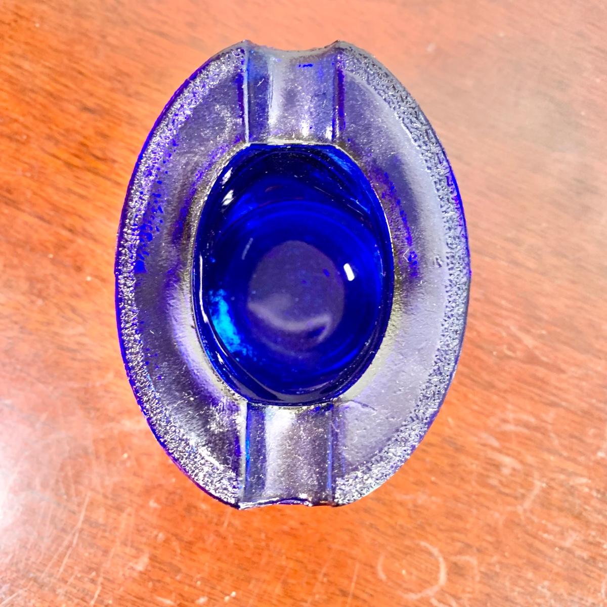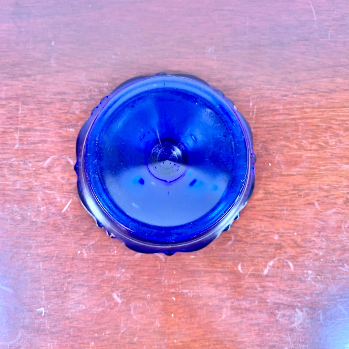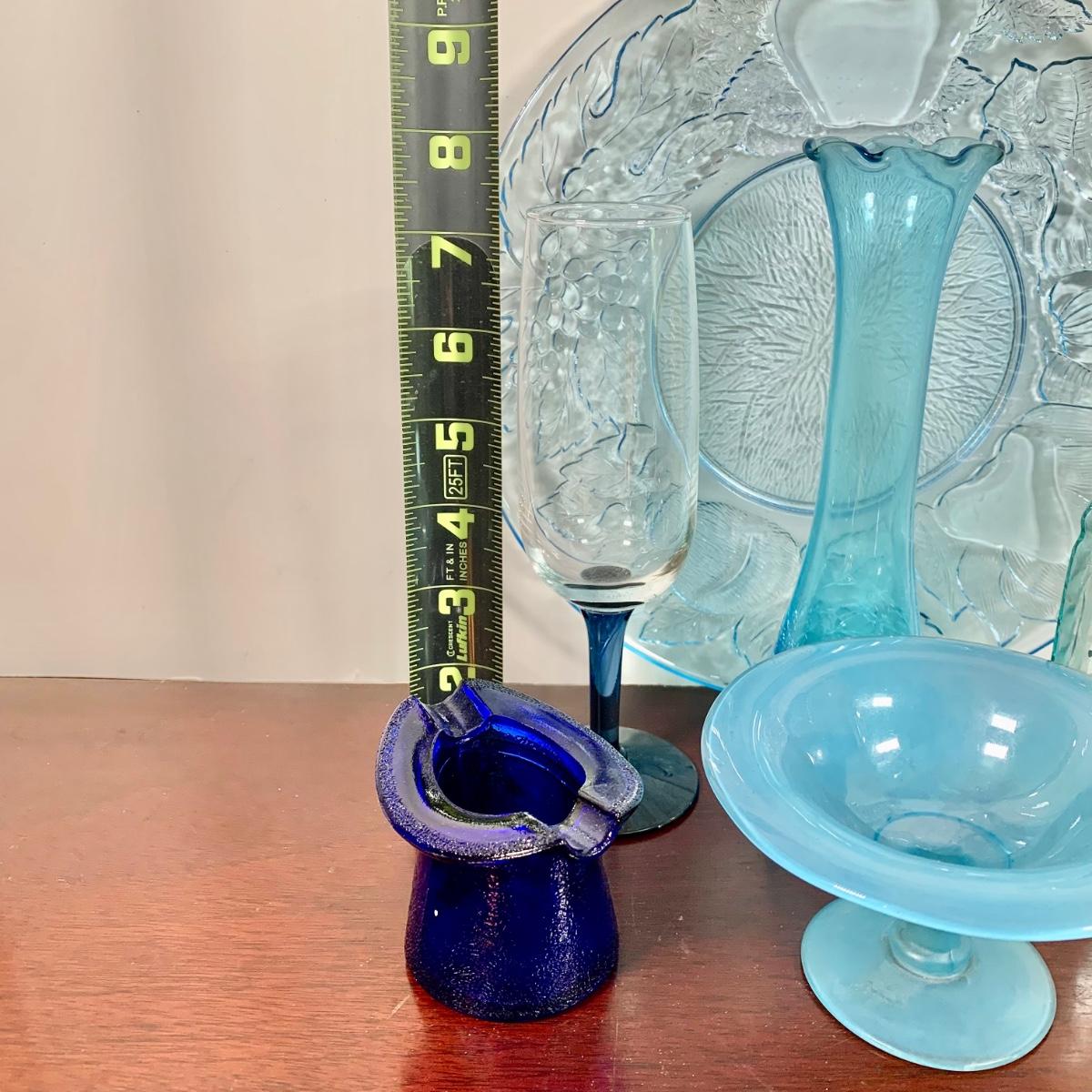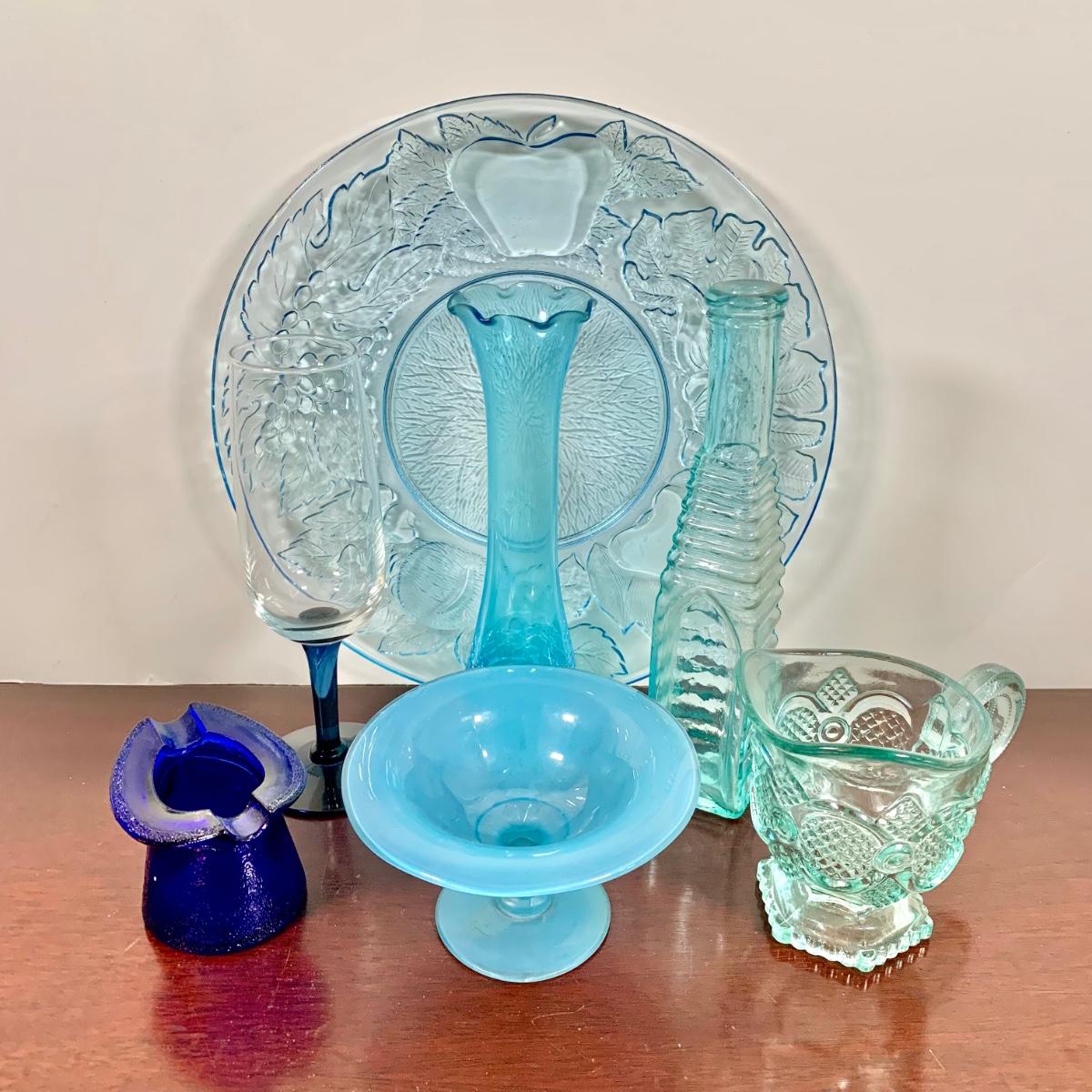 LOT 115 D: Blue Glass Collection: 1950's Lowell Hand Cream Top Hat Ashtray, Della Robbia Fruit Plate, 1890's Cathedral Pepper Sauce Bottle, & More