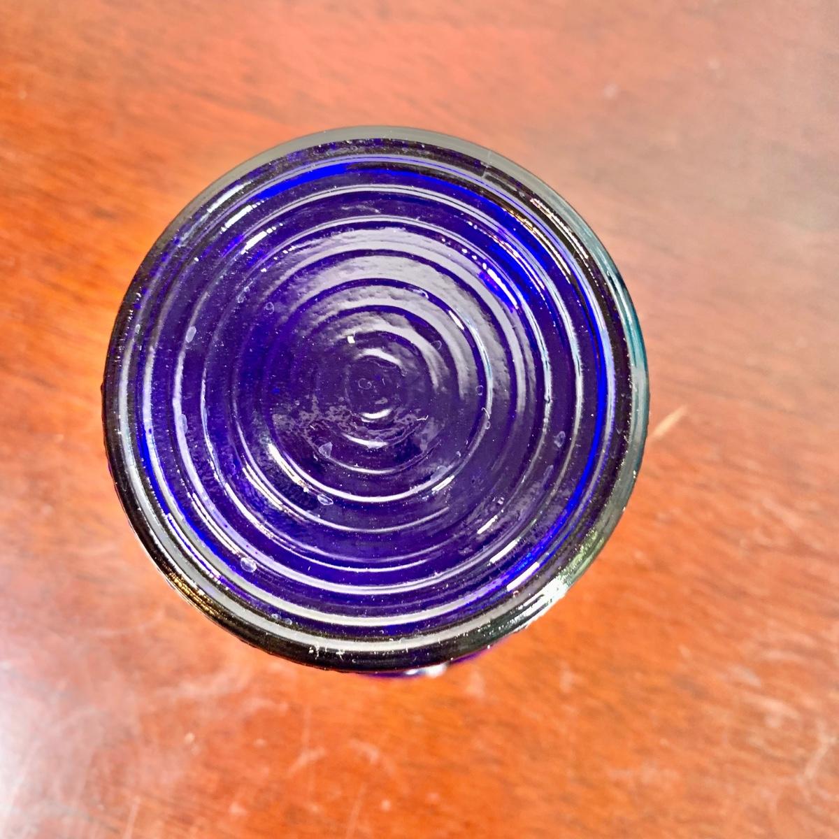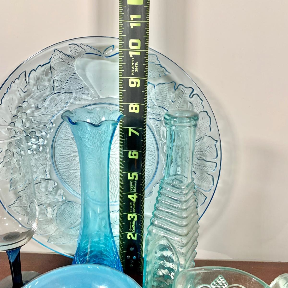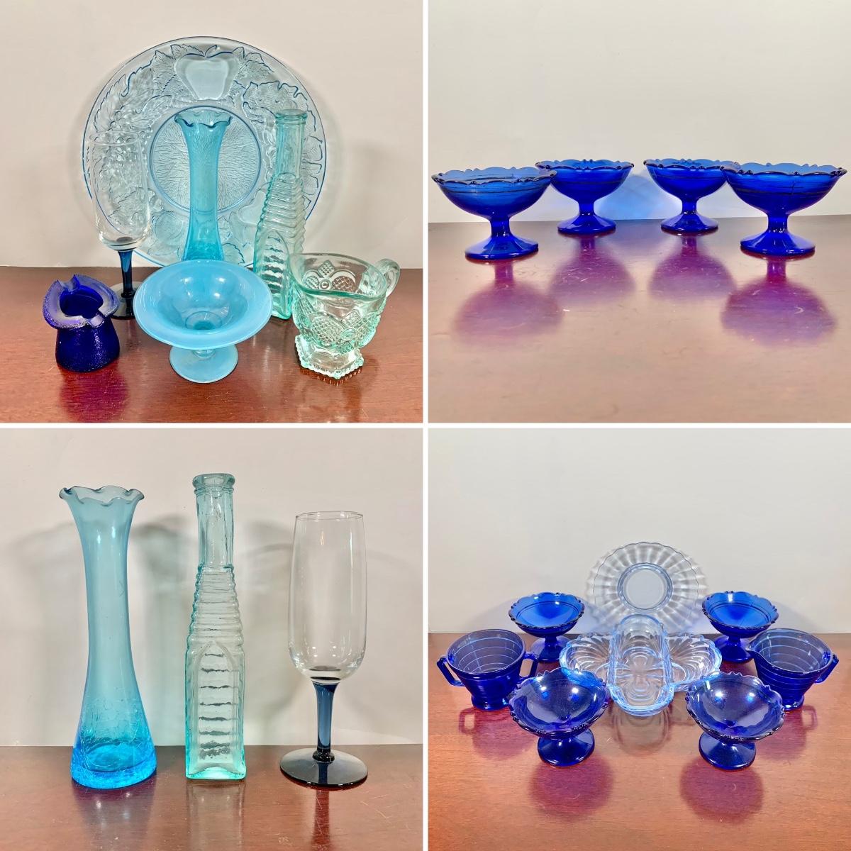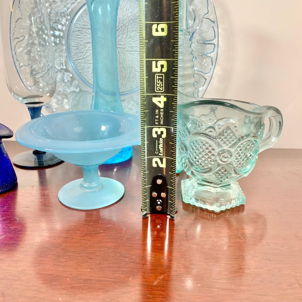 LOT 115 D: Blue Glass Collection: 1950's Lowell Hand Cream Top Hat Ashtray, Della Robbia Fruit Plate, 1890's Cathedral Pepper Sauce Bottle, & More