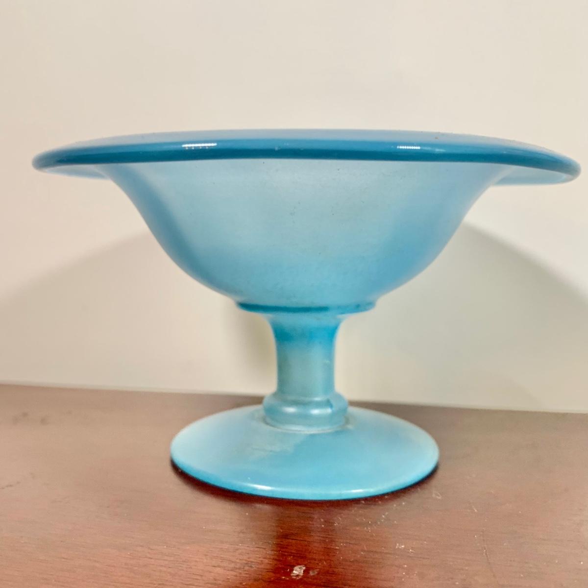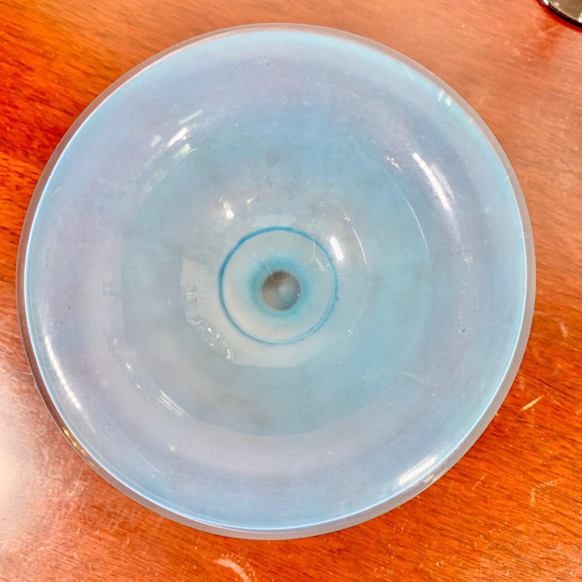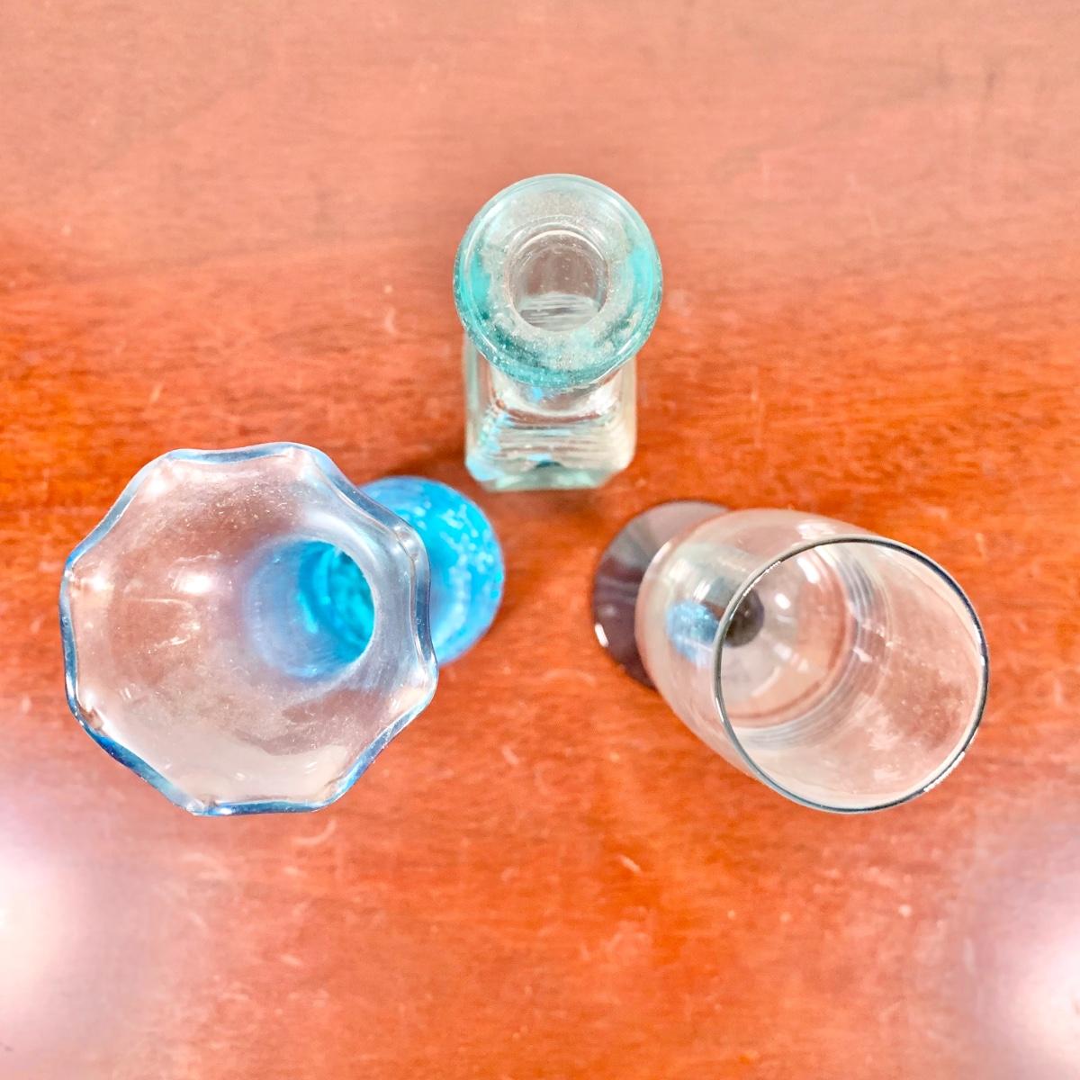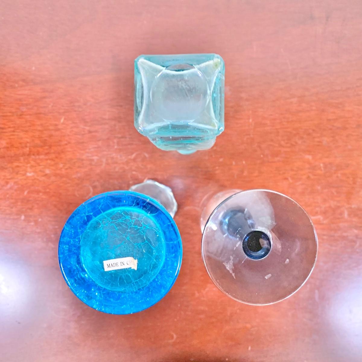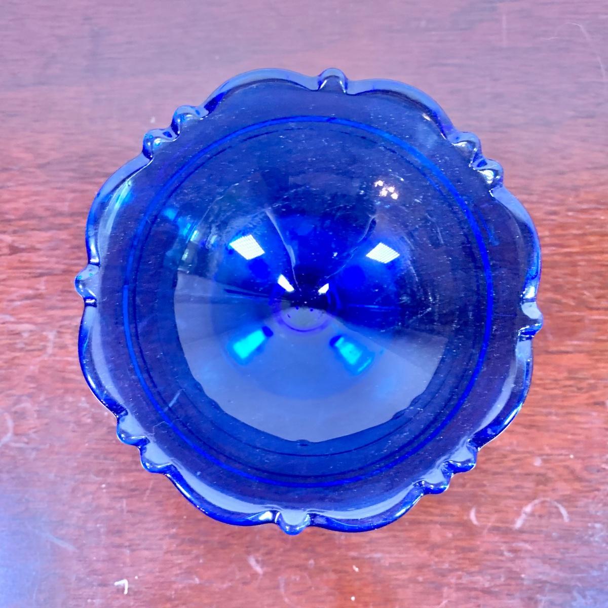 LOT 115 D: Blue Glass Collection: 1950's Lowell Hand Cream Top Hat Ashtray, Della Robbia Fruit Plate, 1890's Cathedral Pepper Sauce Bottle, & More