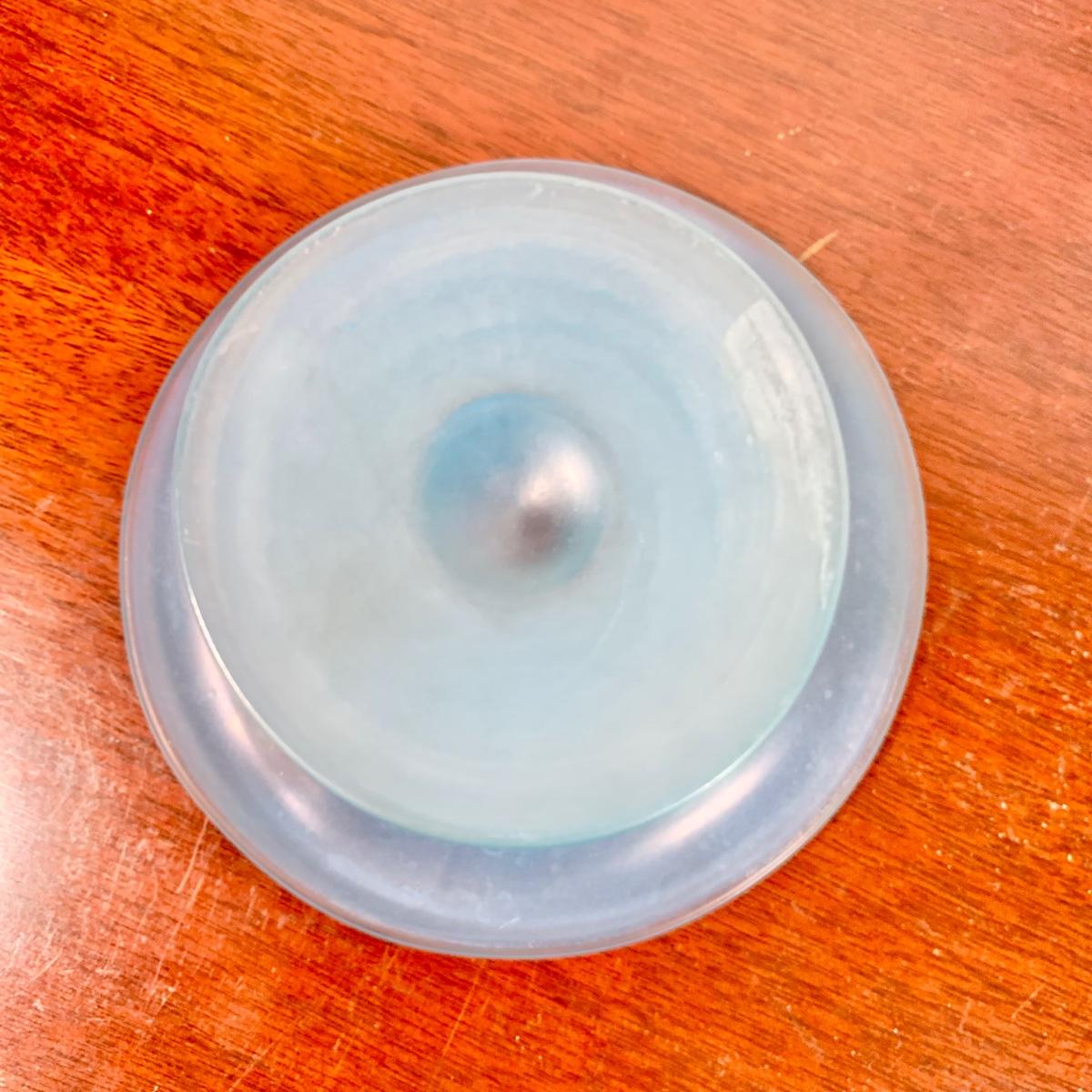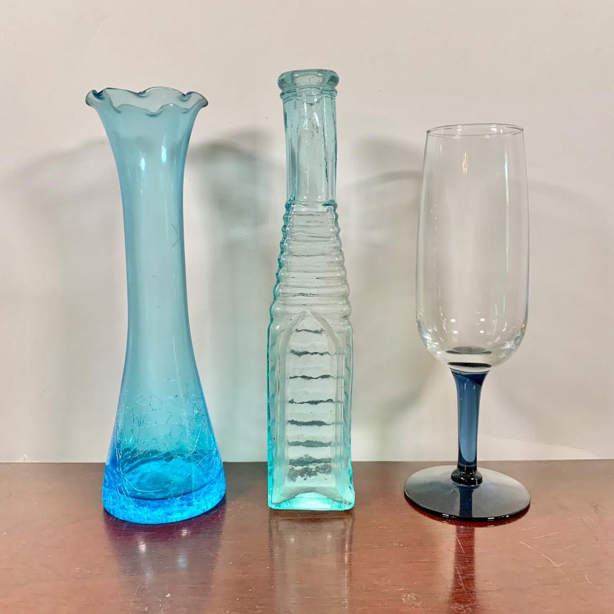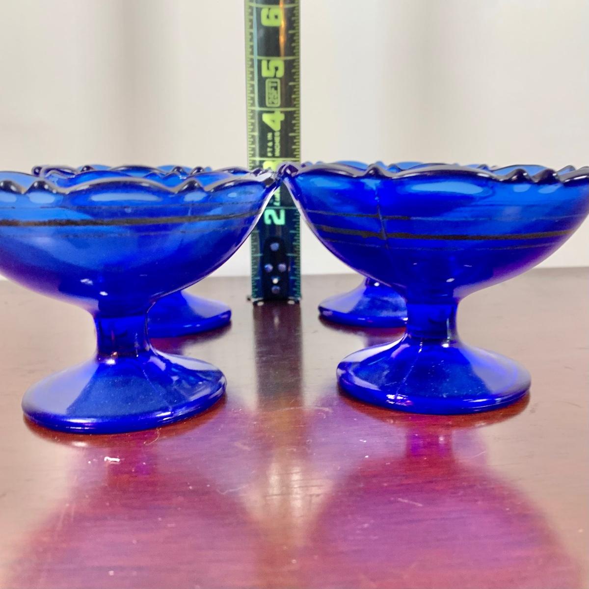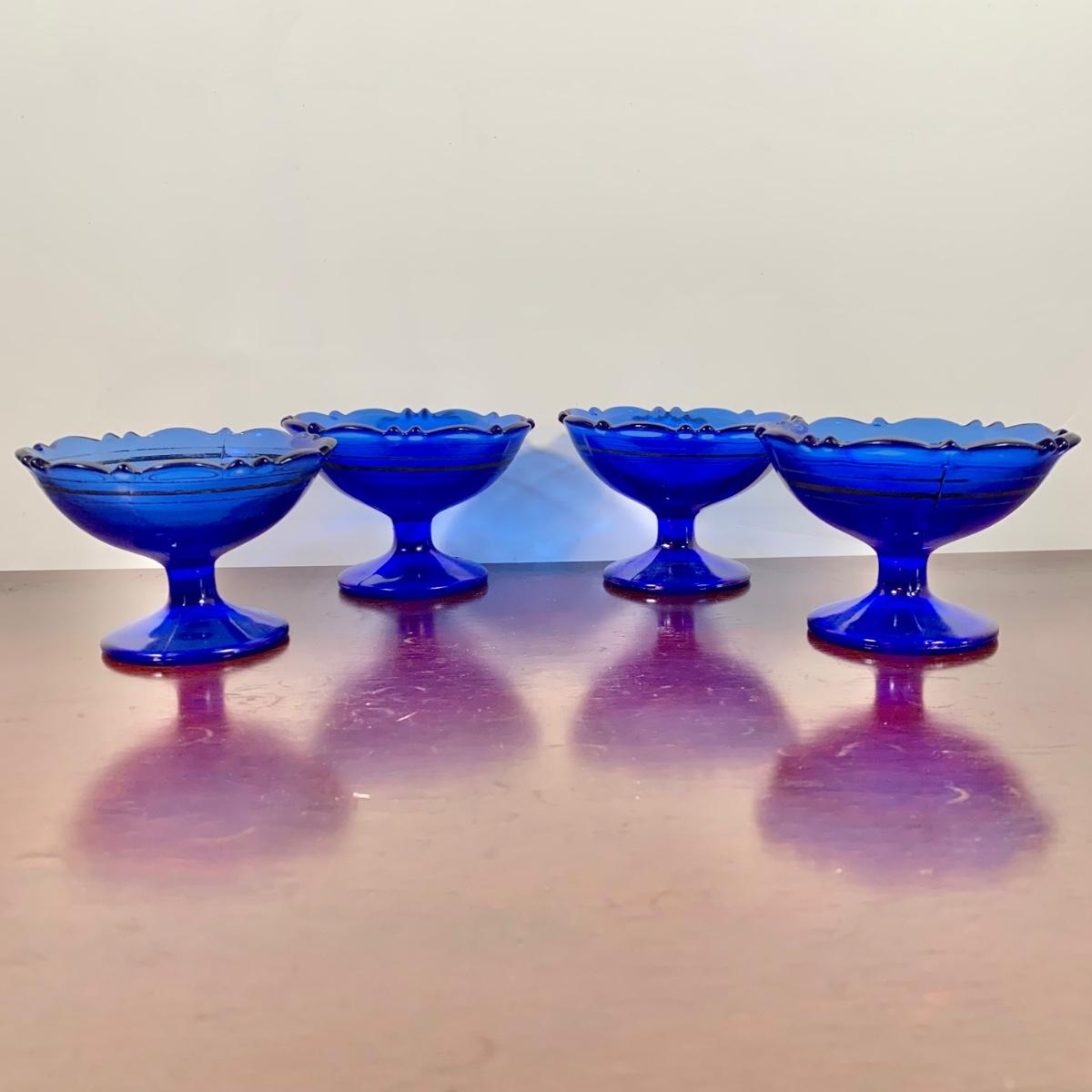 LOT 115 D: Blue Glass Collection: 1950's Lowell Hand Cream Top Hat Ashtray, Della Robbia Fruit Plate, 1890's Cathedral Pepper Sauce Bottle, & More