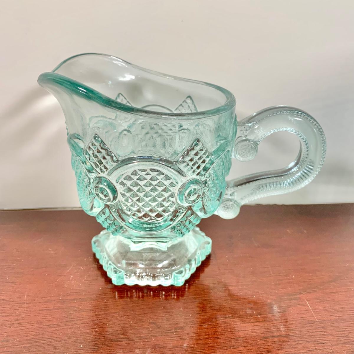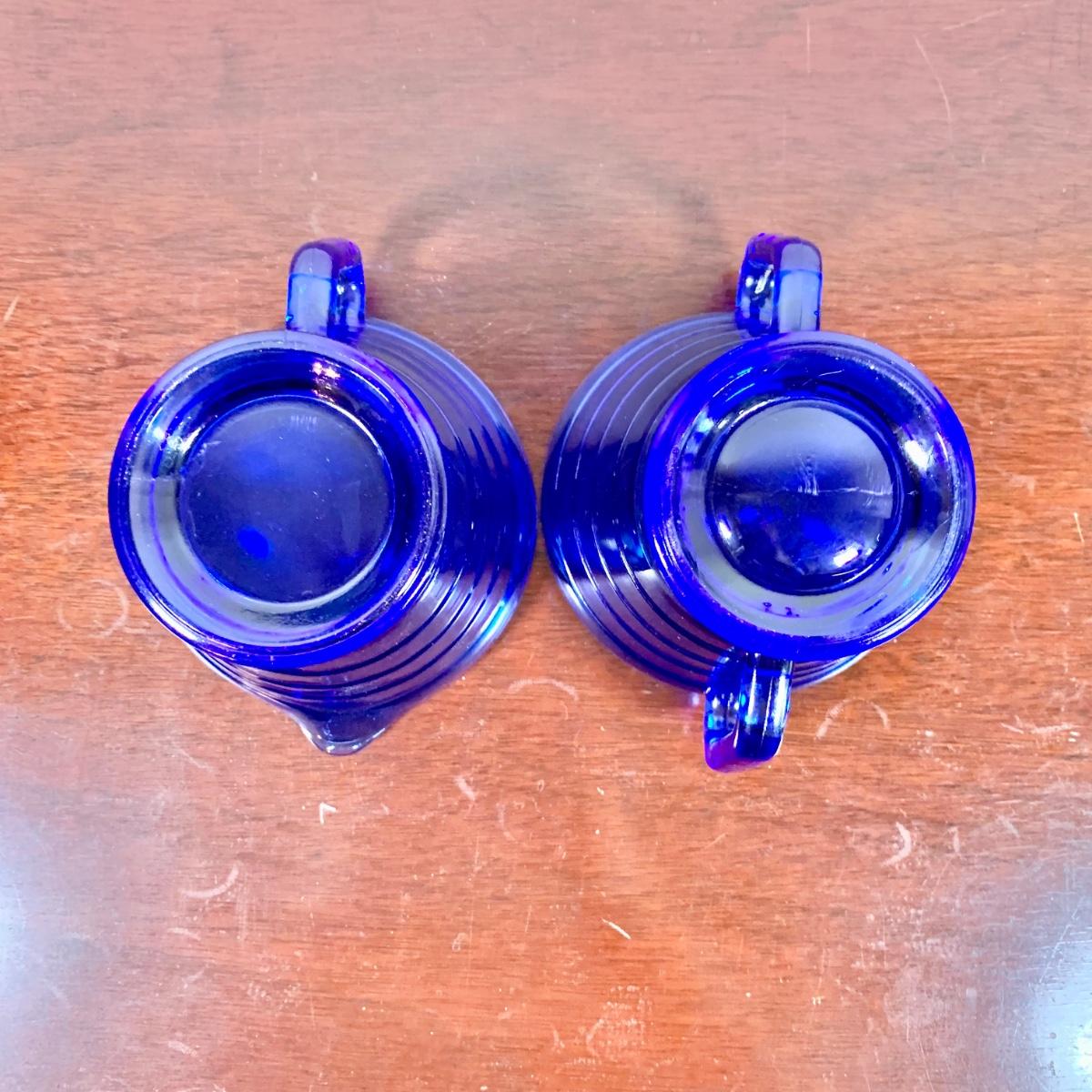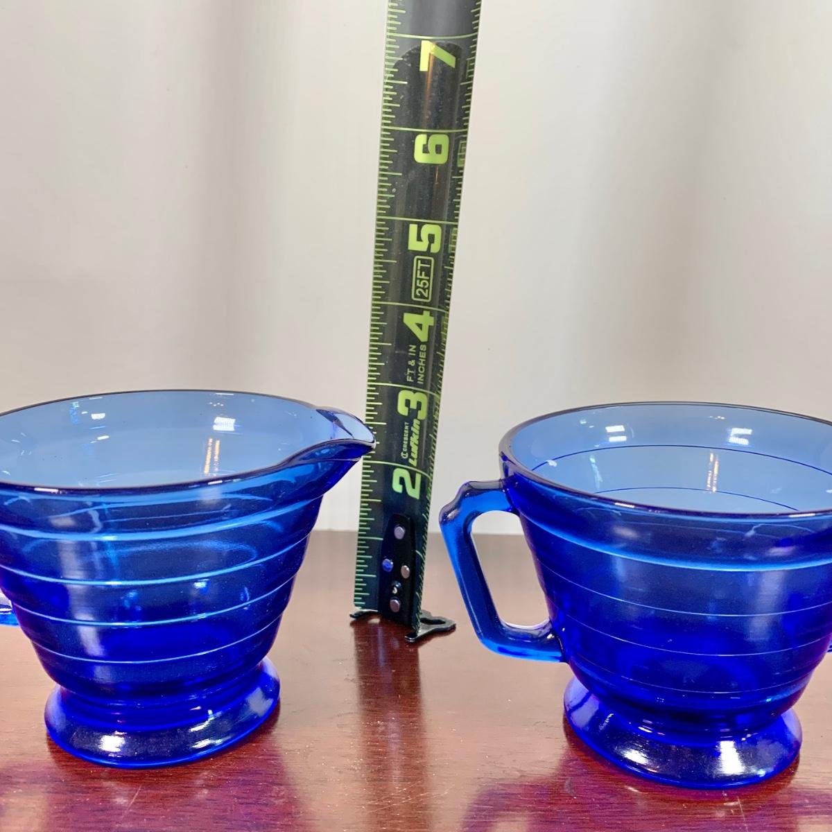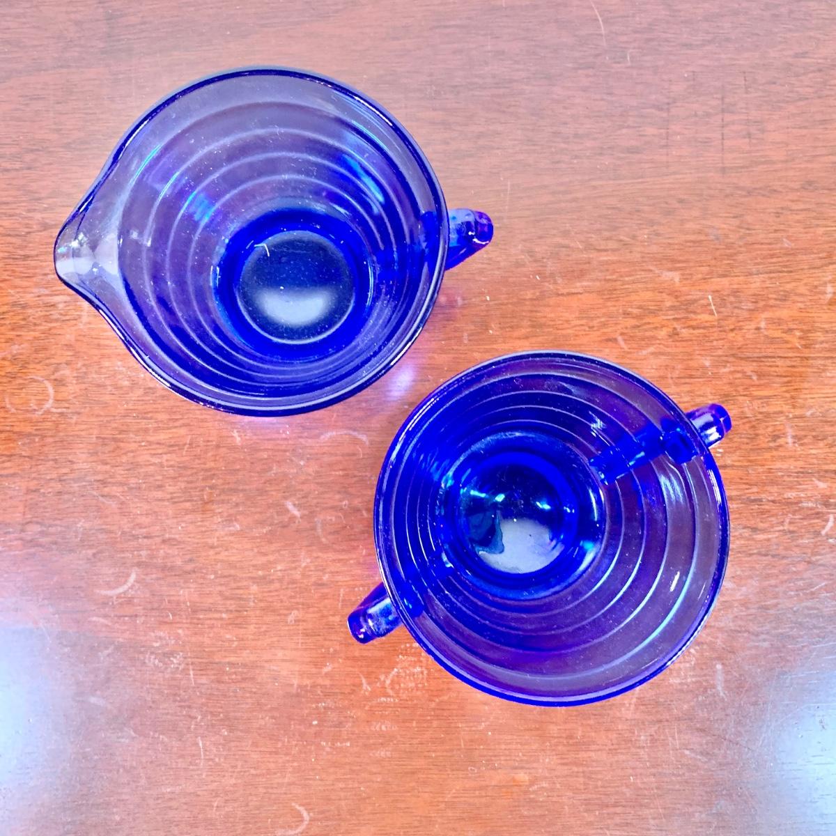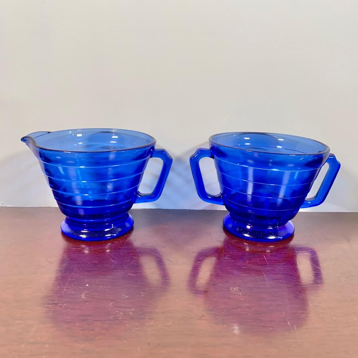 LOT 115 D: Blue Glass Collection: 1950's Lowell Hand Cream Top Hat Ashtray, Della Robbia Fruit Plate, 1890's Cathedral Pepper Sauce Bottle, & More