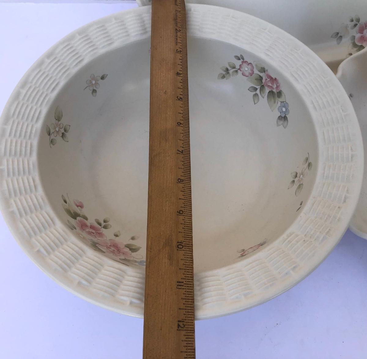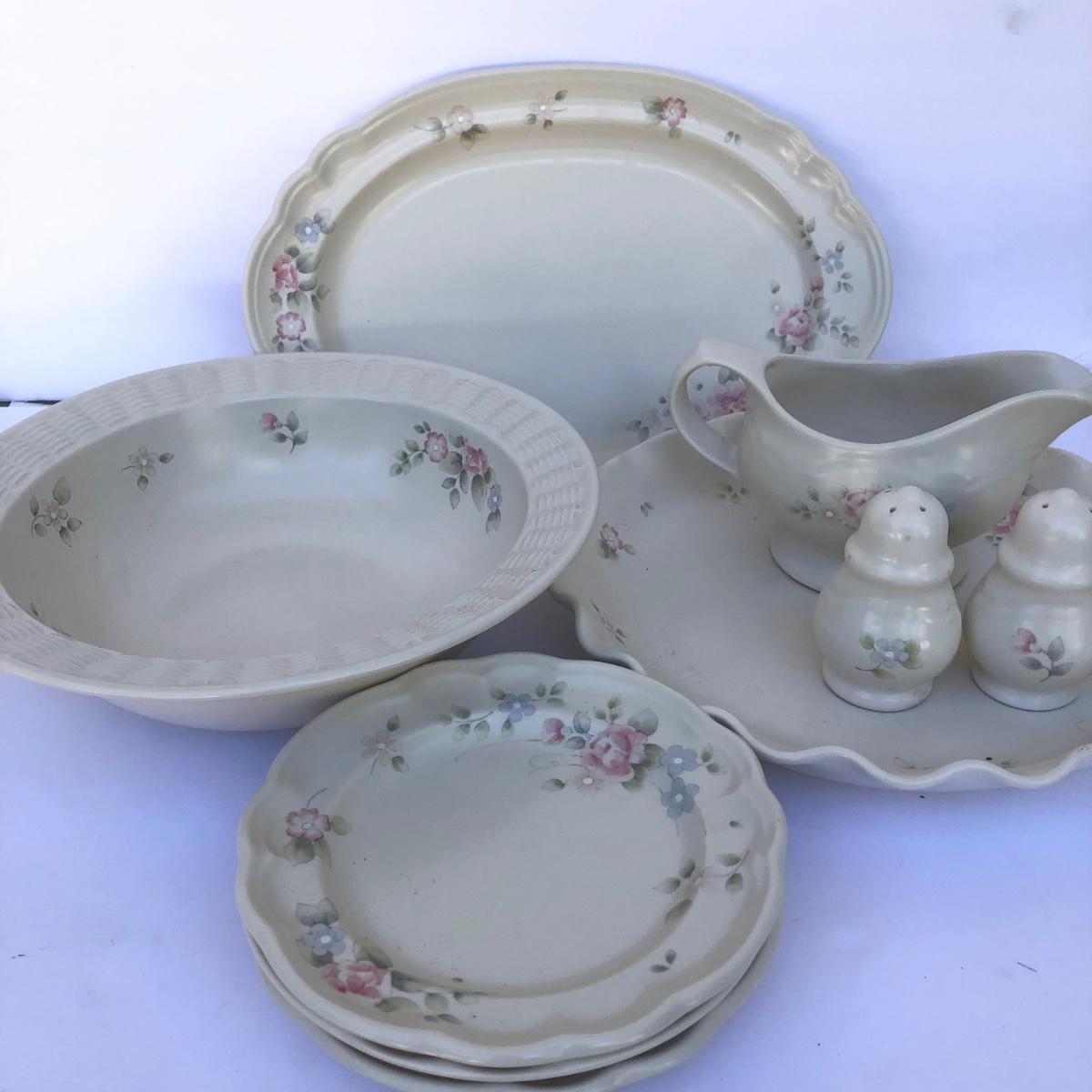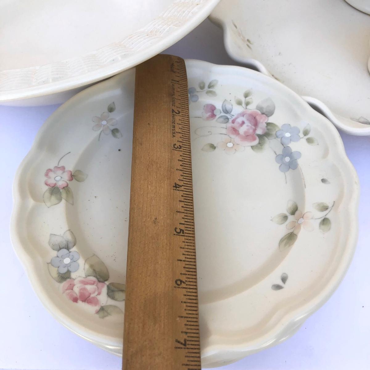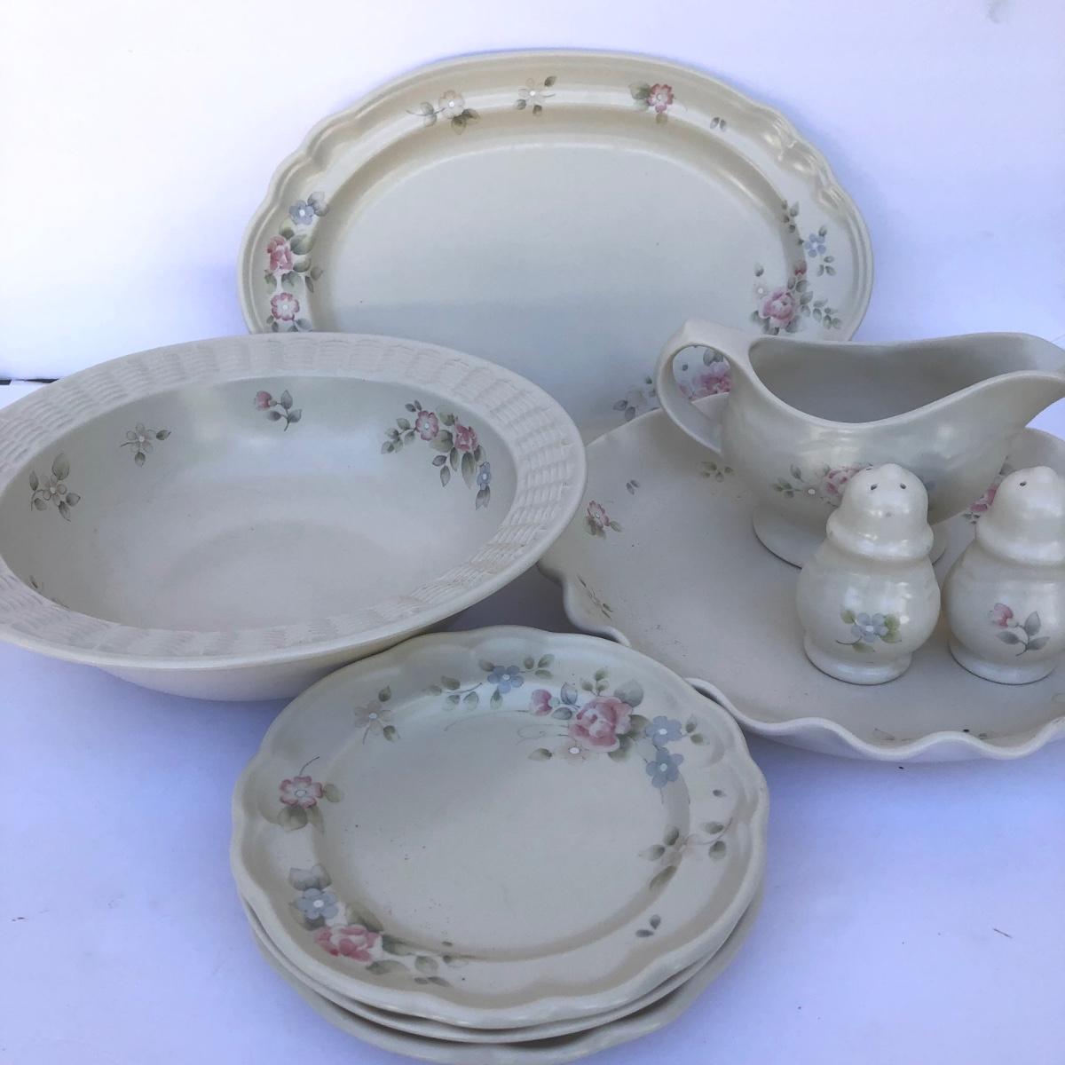 LOT 141G: Pfaltzgraff Tea Rose Salt & Pepper Shakers, 7" Plates, Woven Edge 11.5" Bowl, Ruffle Edge 12" Plate, Gravy Boat, & 14" Oval Platter