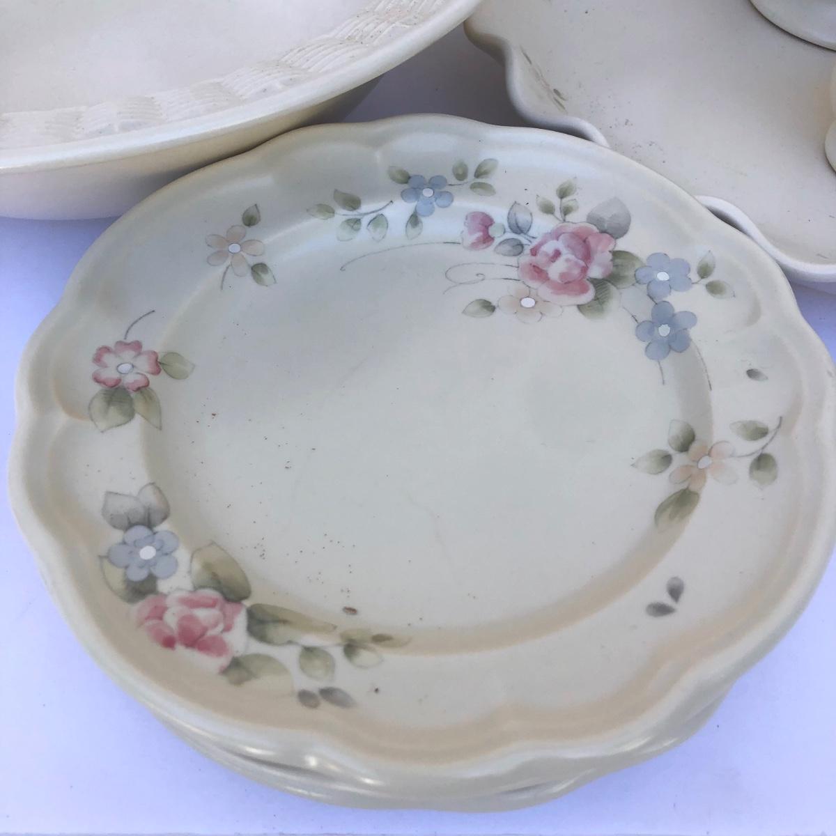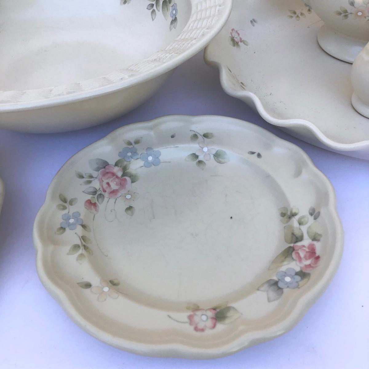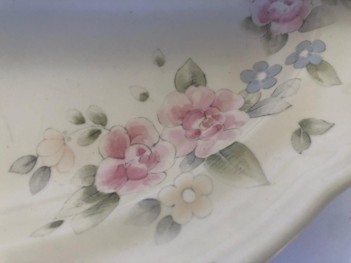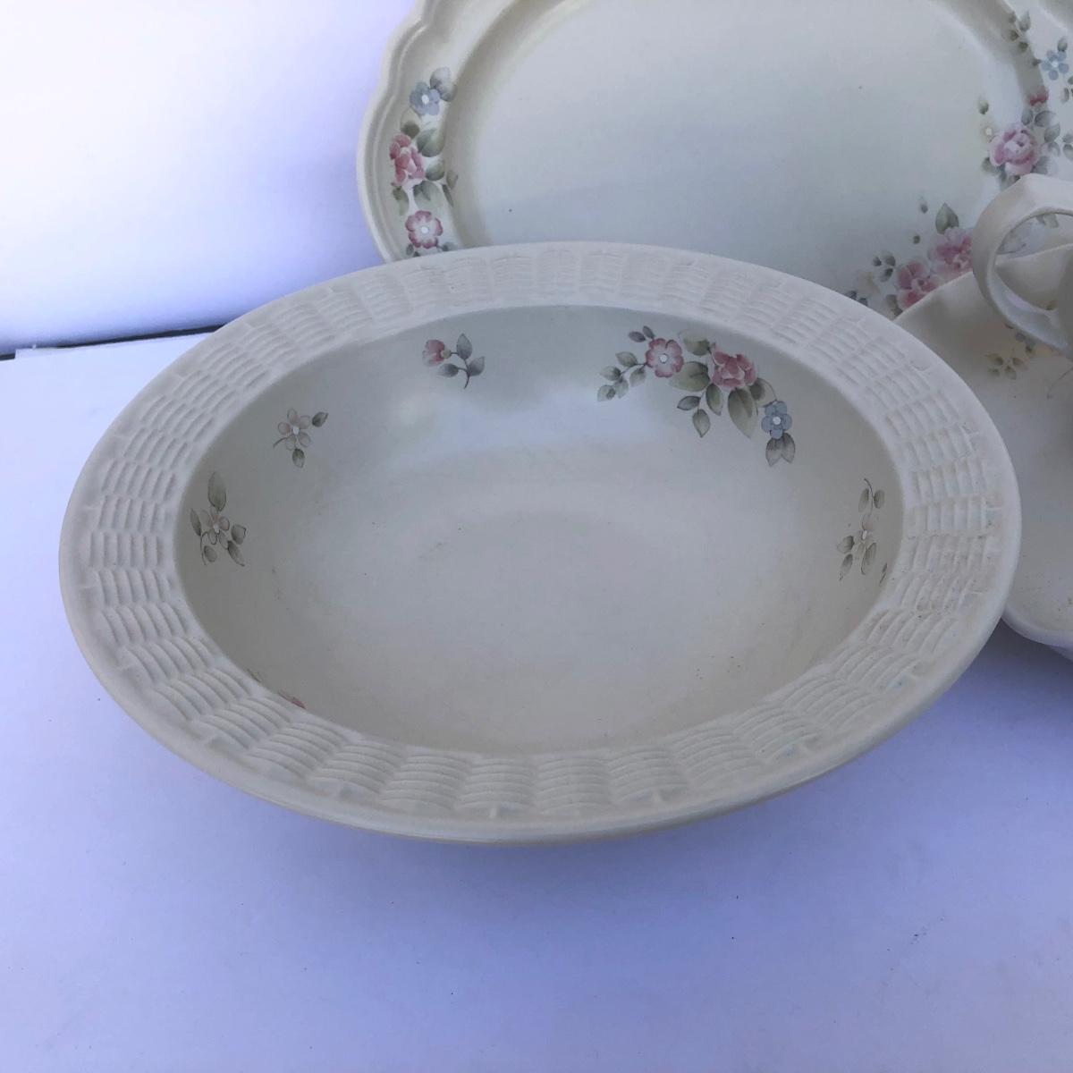 LOT 141G: Pfaltzgraff Tea Rose Salt & Pepper Shakers, 7" Plates, Woven Edge 11.5" Bowl, Ruffle Edge 12" Plate, Gravy Boat, & 14" Oval Platter