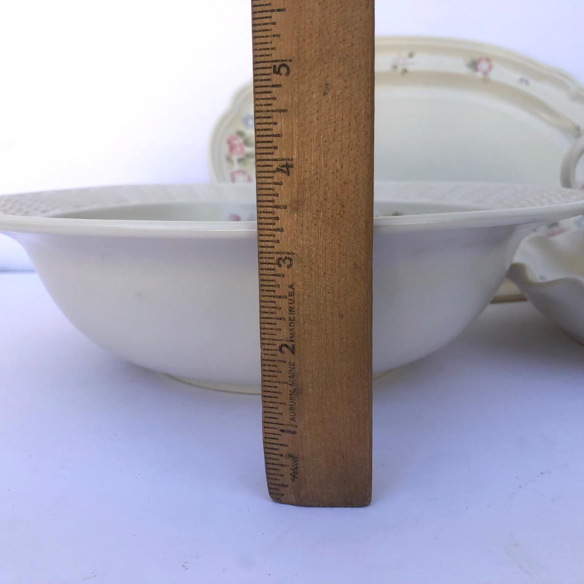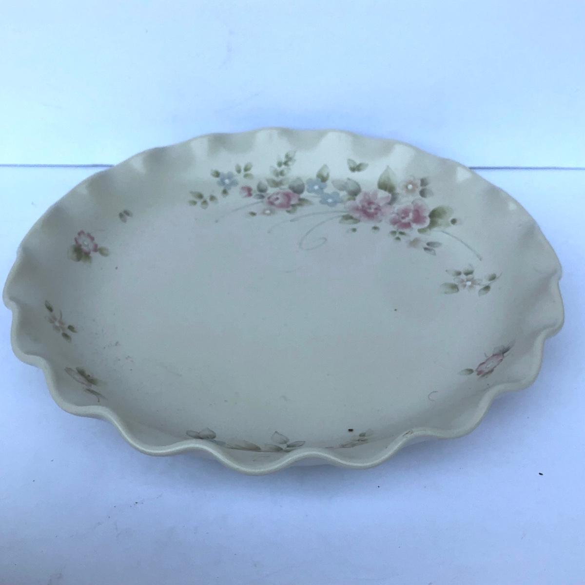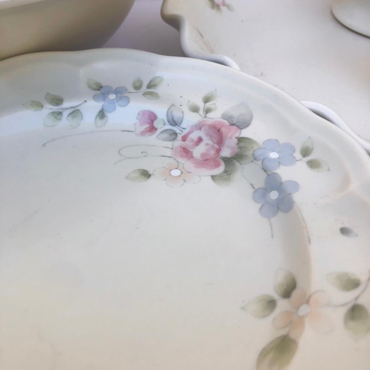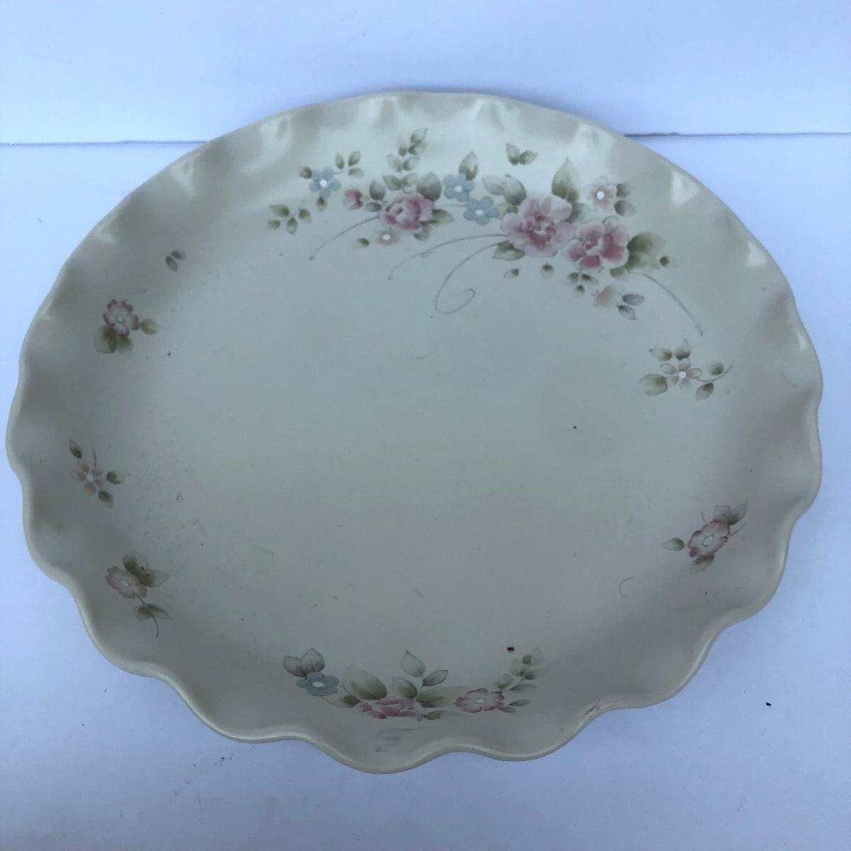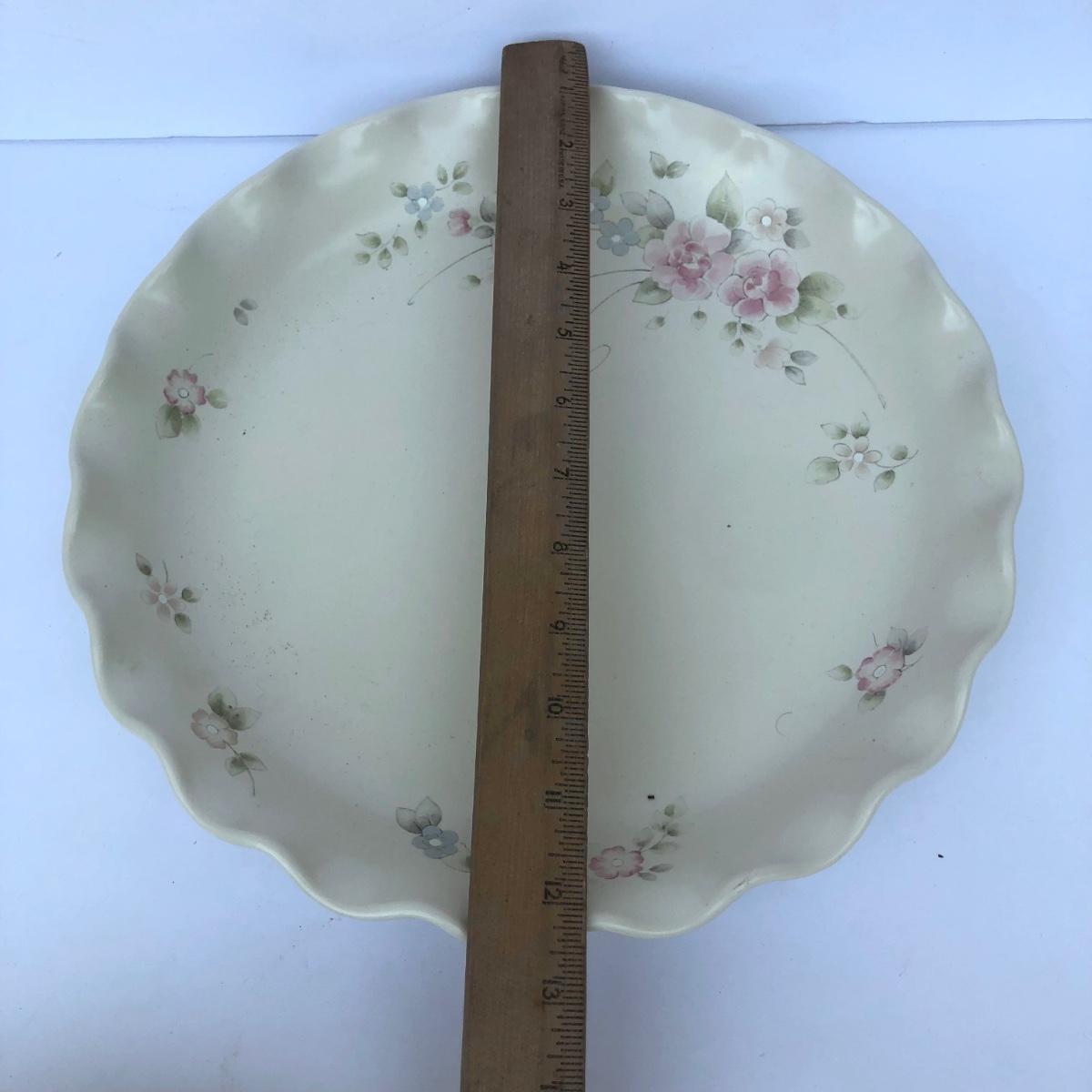 LOT 141G: Pfaltzgraff Tea Rose Salt & Pepper Shakers, 7" Plates, Woven Edge 11.5" Bowl, Ruffle Edge 12" Plate, Gravy Boat, & 14" Oval Platter