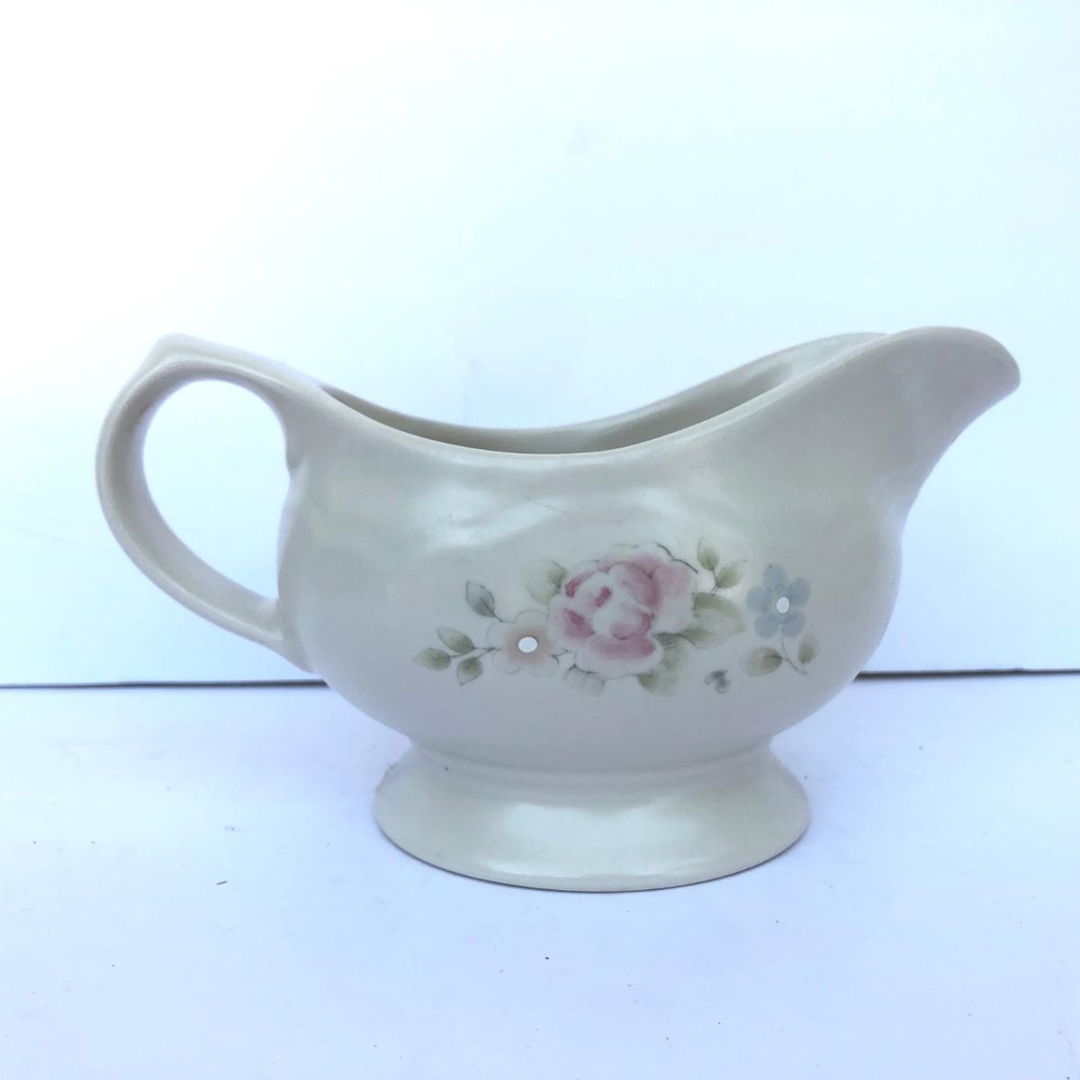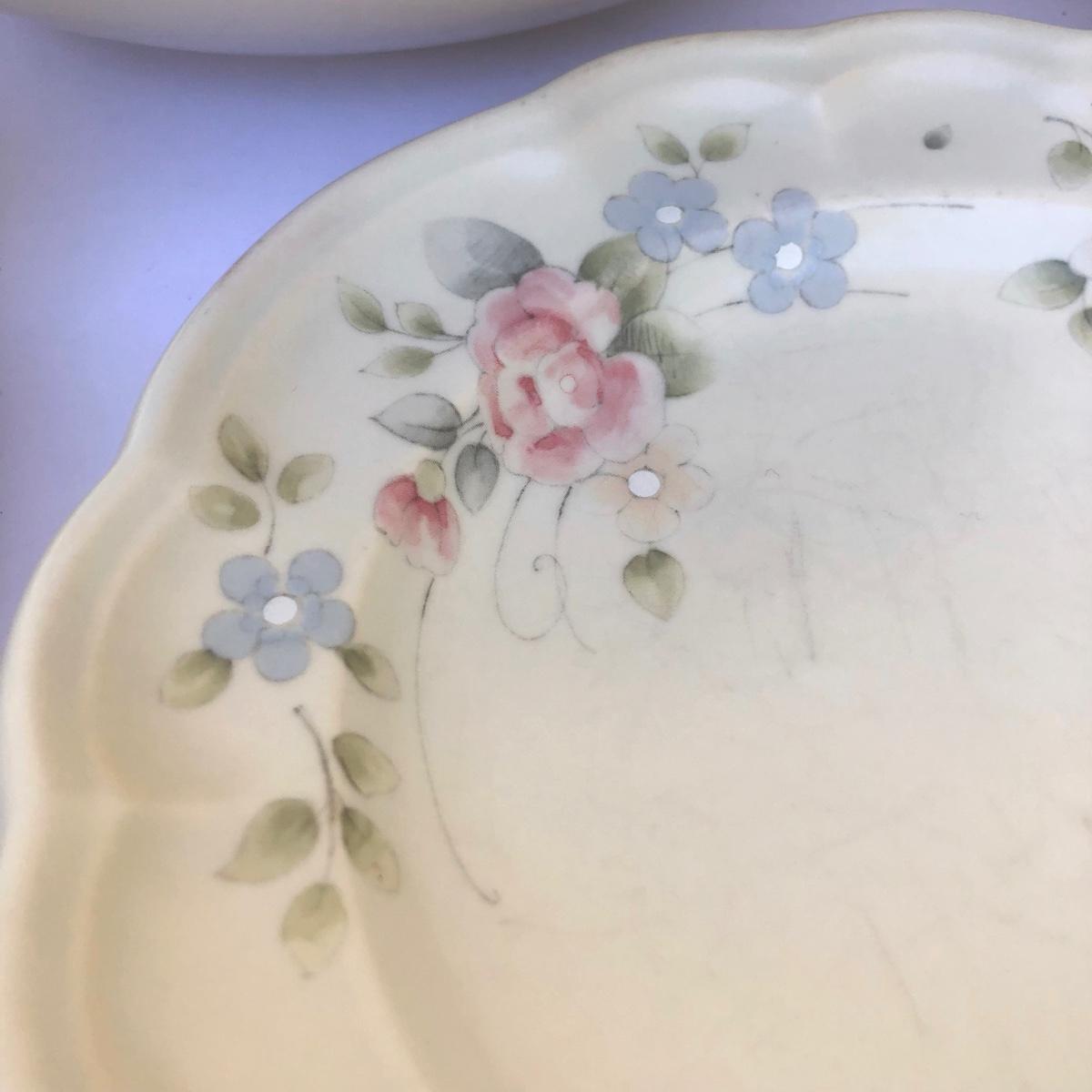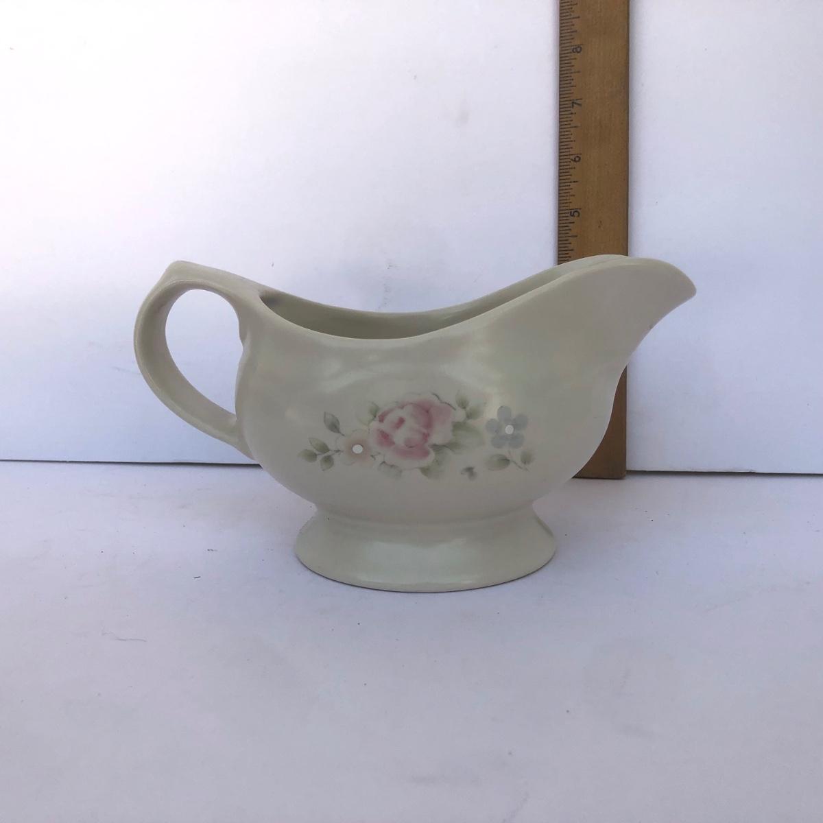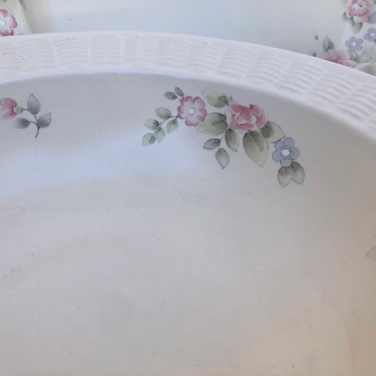 LOT 141G: Pfaltzgraff Tea Rose Salt & Pepper Shakers, 7" Plates, Woven Edge 11.5" Bowl, Ruffle Edge 12" Plate, Gravy Boat, & 14" Oval Platter