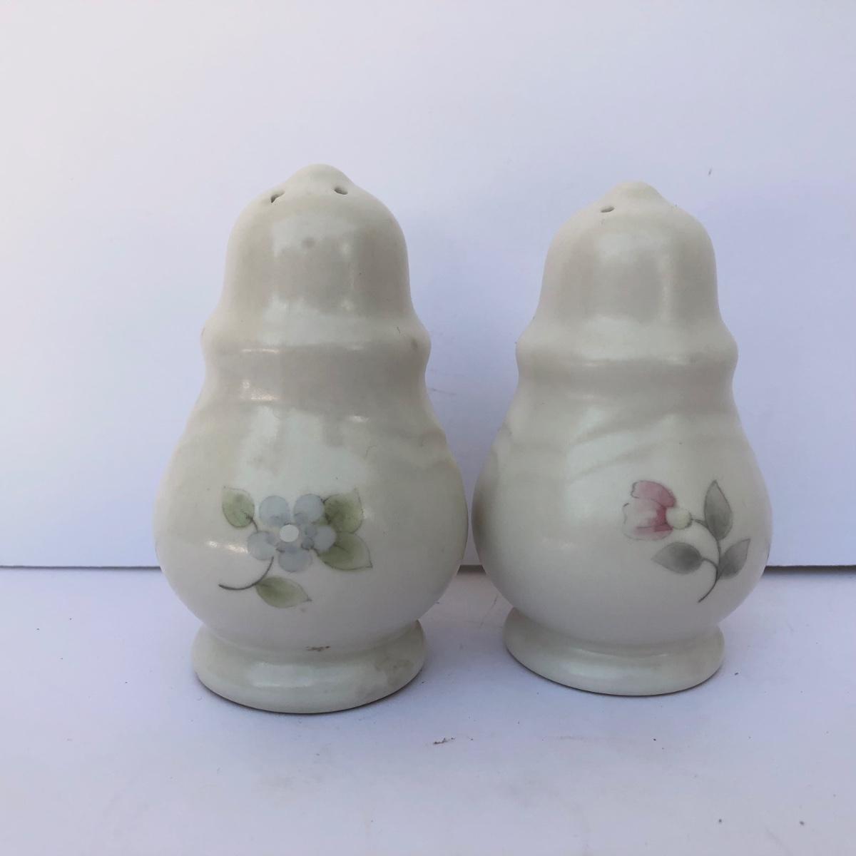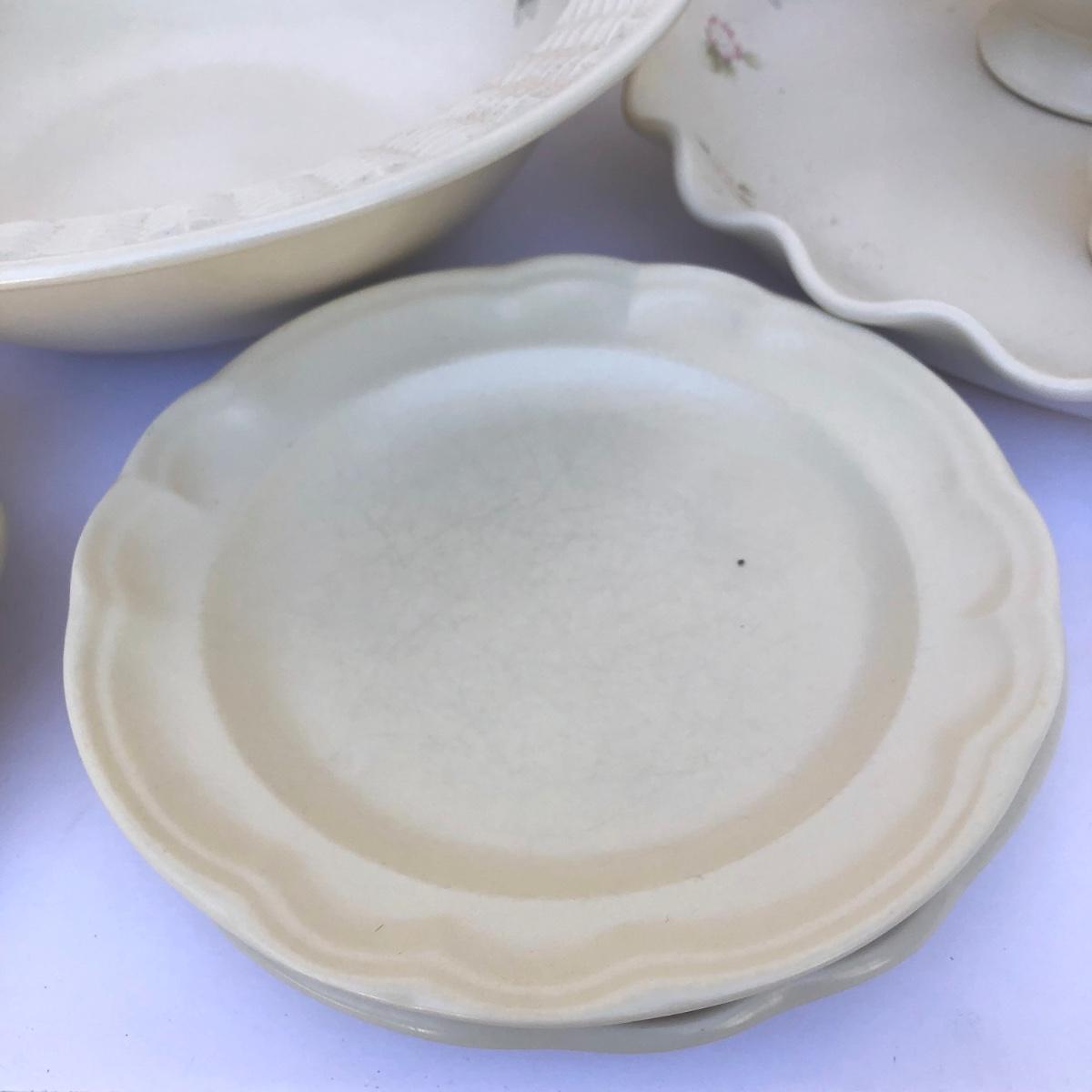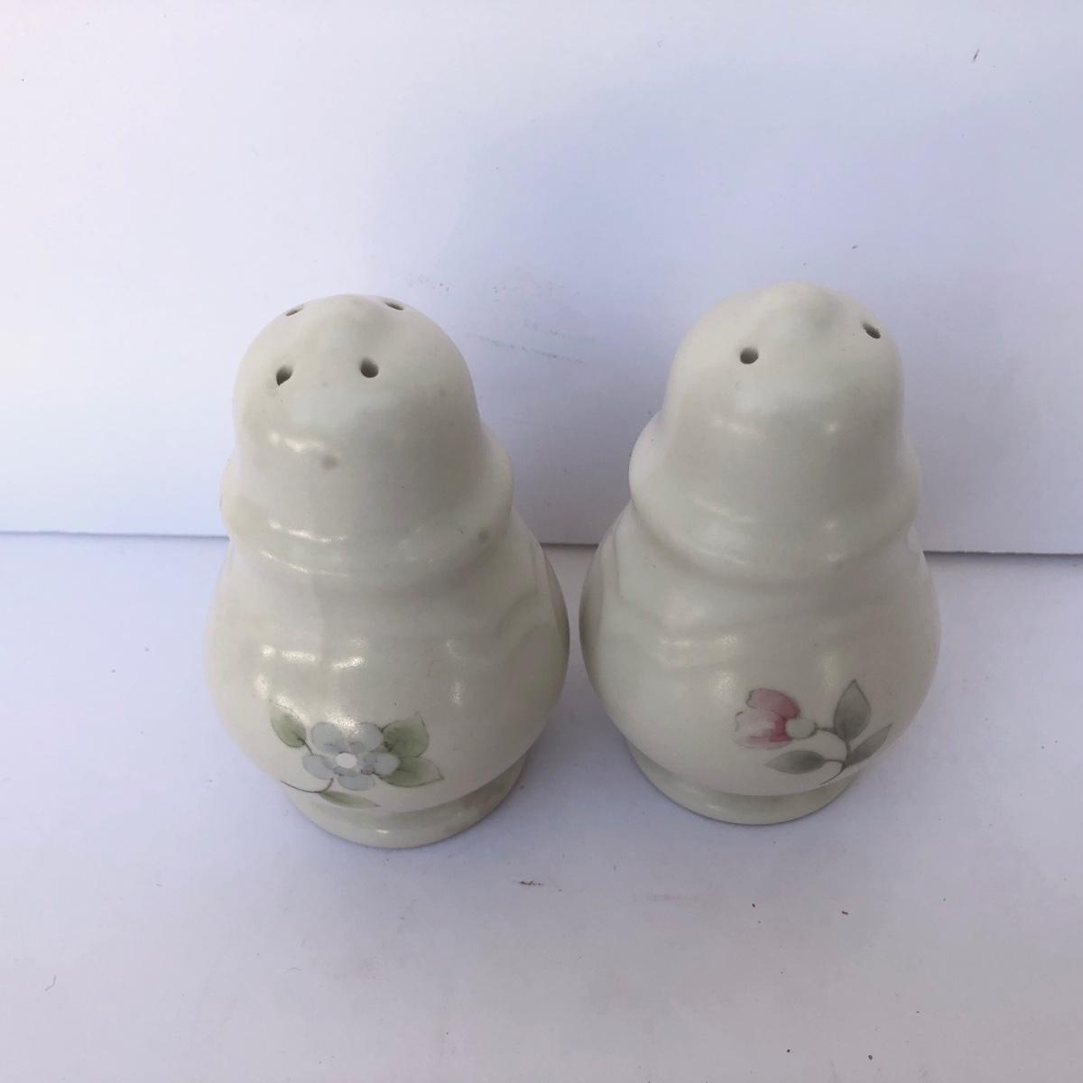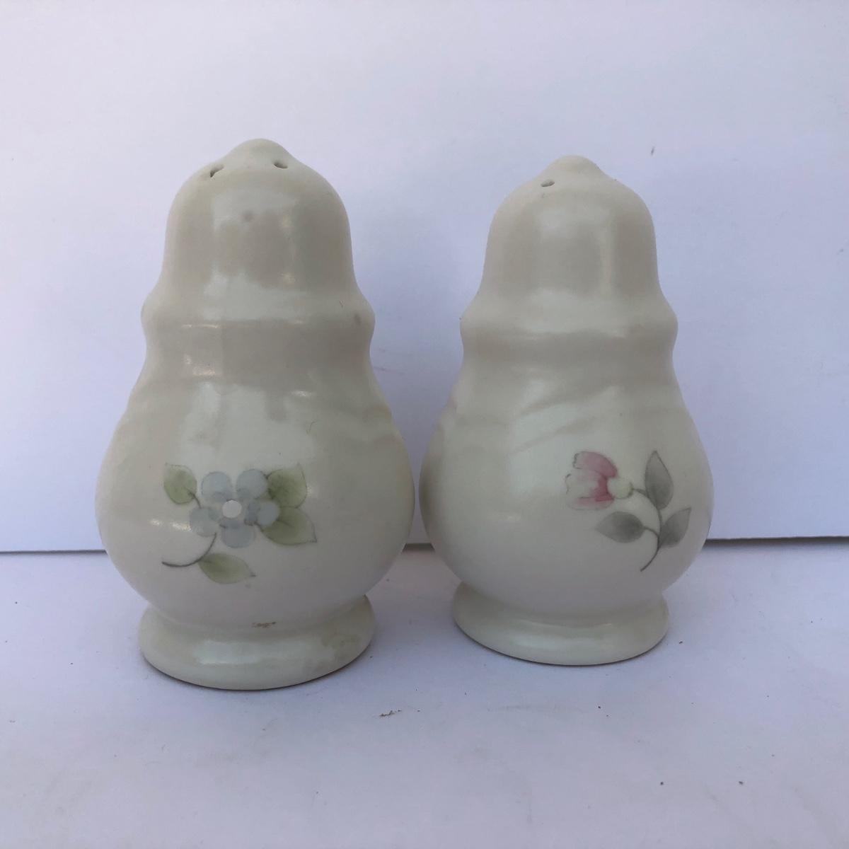 LOT 141G: Pfaltzgraff Tea Rose Salt & Pepper Shakers, 7" Plates, Woven Edge 11.5" Bowl, Ruffle Edge 12" Plate, Gravy Boat, & 14" Oval Platter