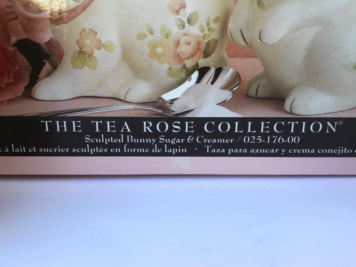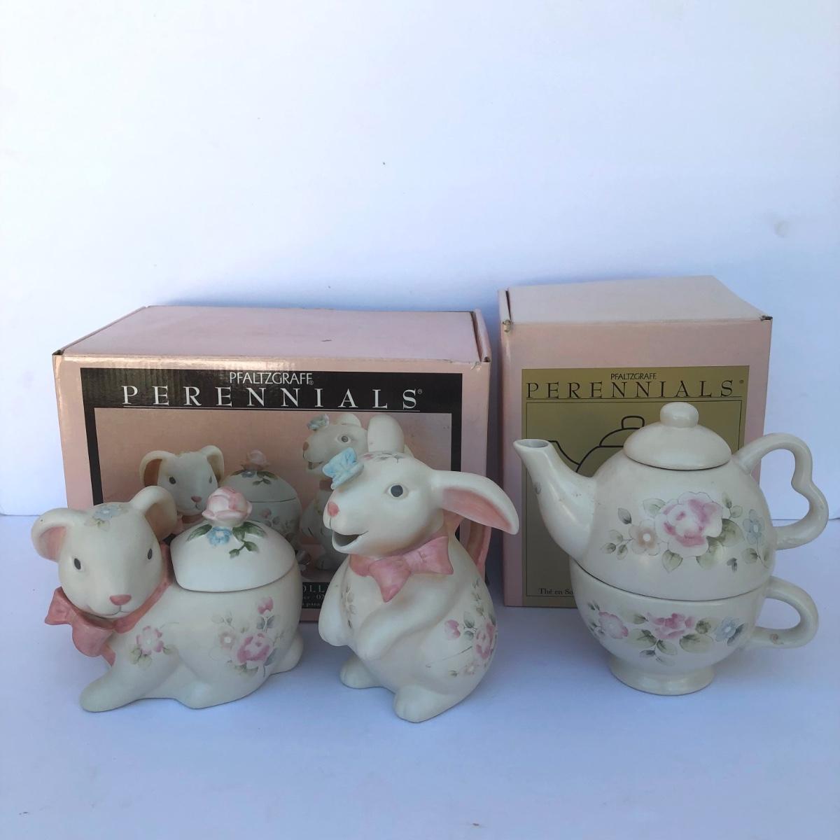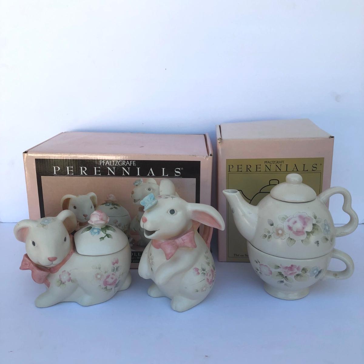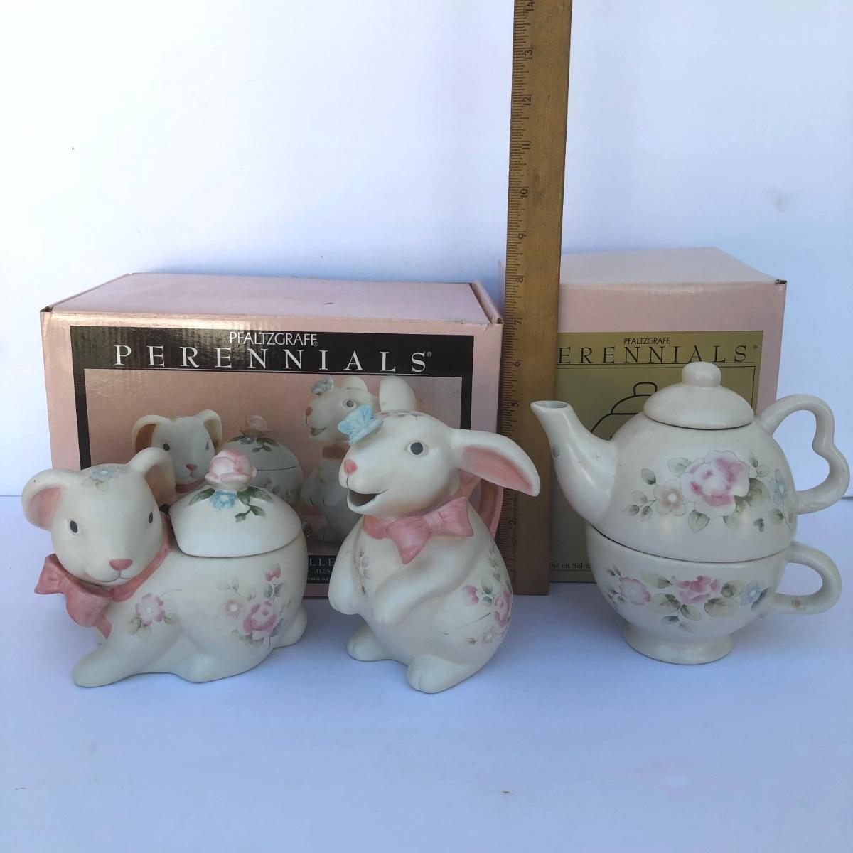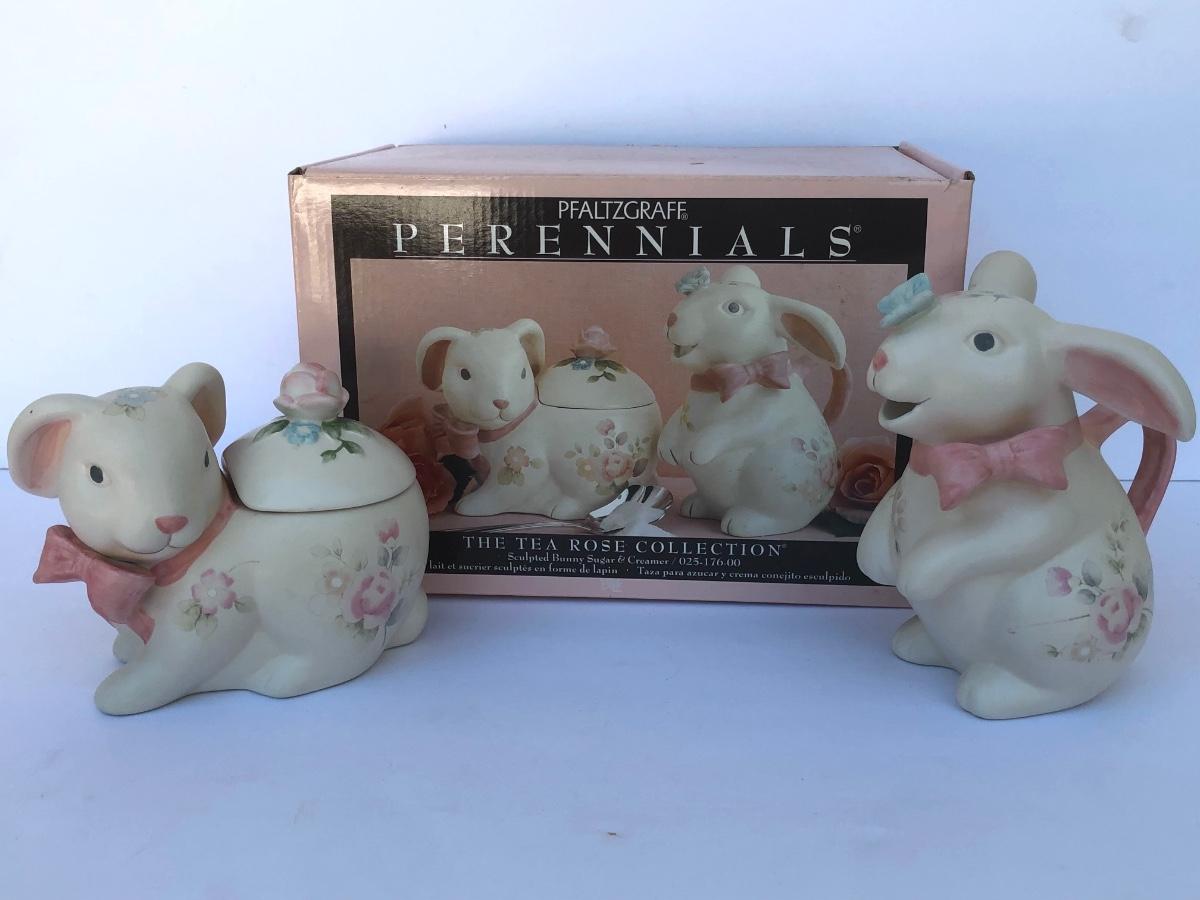 LOT 142G: Pfaltzgraff Perennials Tea Rose Tea for One Stacking Teapot & Sculpted Bunny Sugar and Creamer (Both w/ Original Boxes)