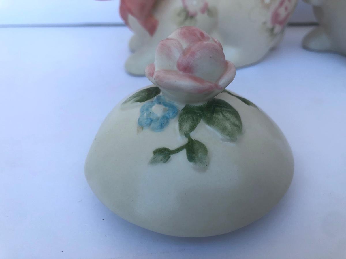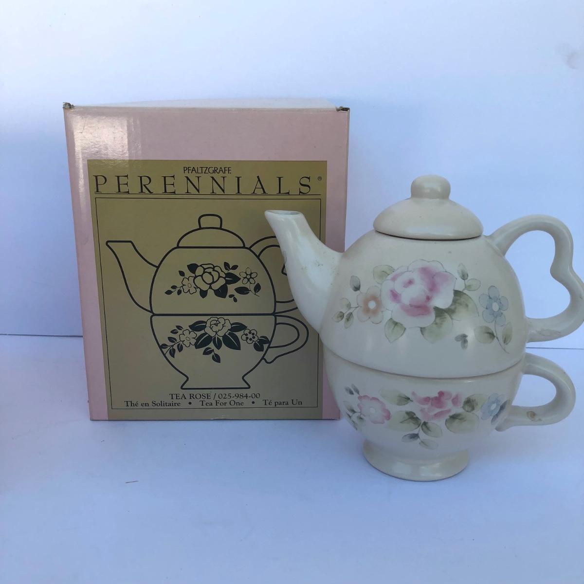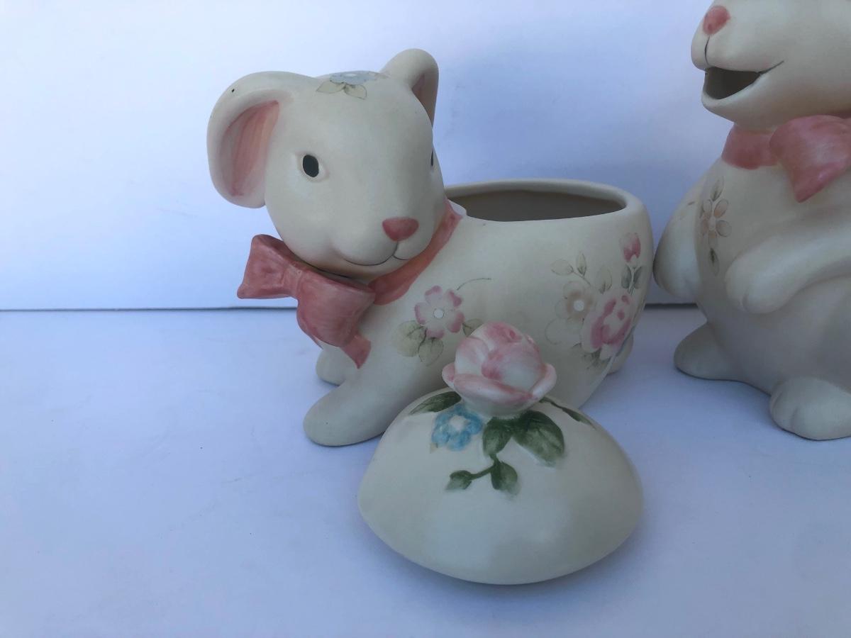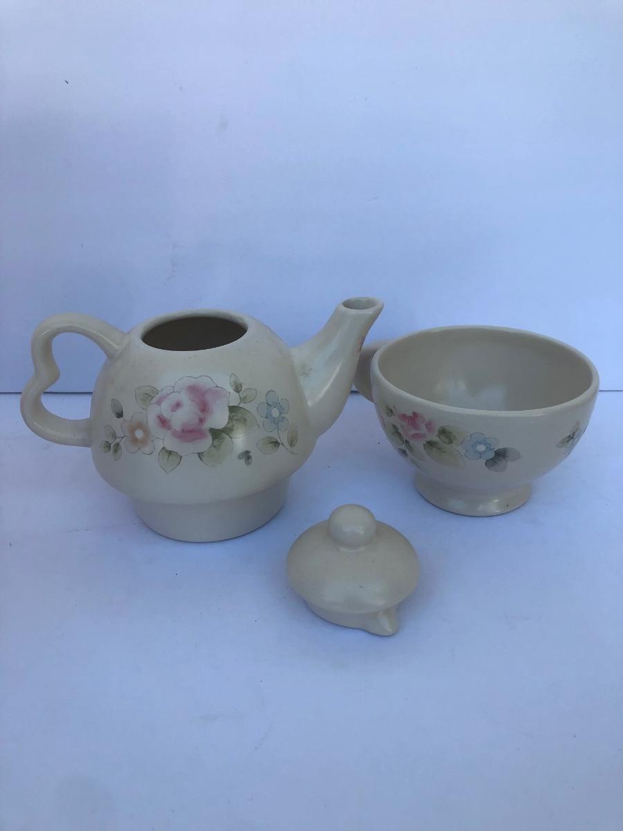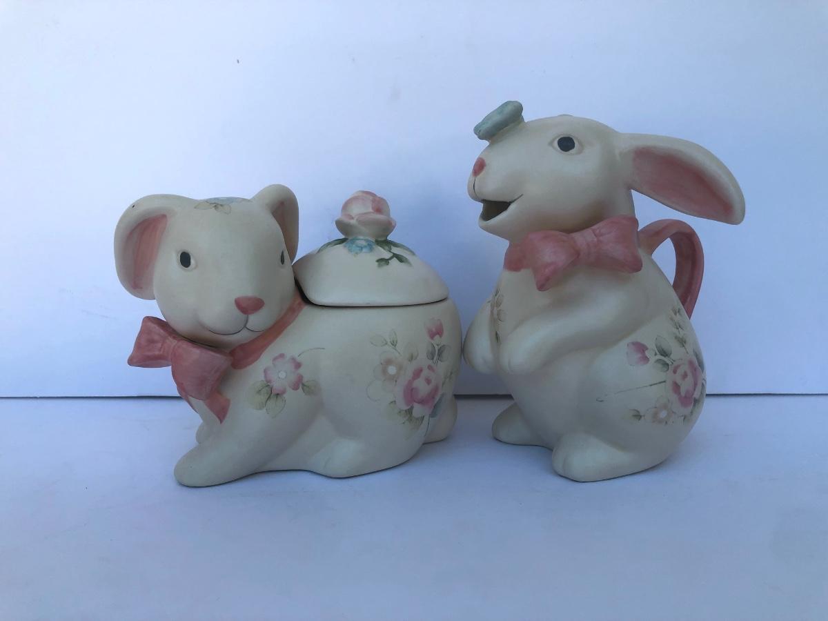 LOT 142G: Pfaltzgraff Perennials Tea Rose Tea for One Stacking Teapot & Sculpted Bunny Sugar and Creamer (Both w/ Original Boxes)