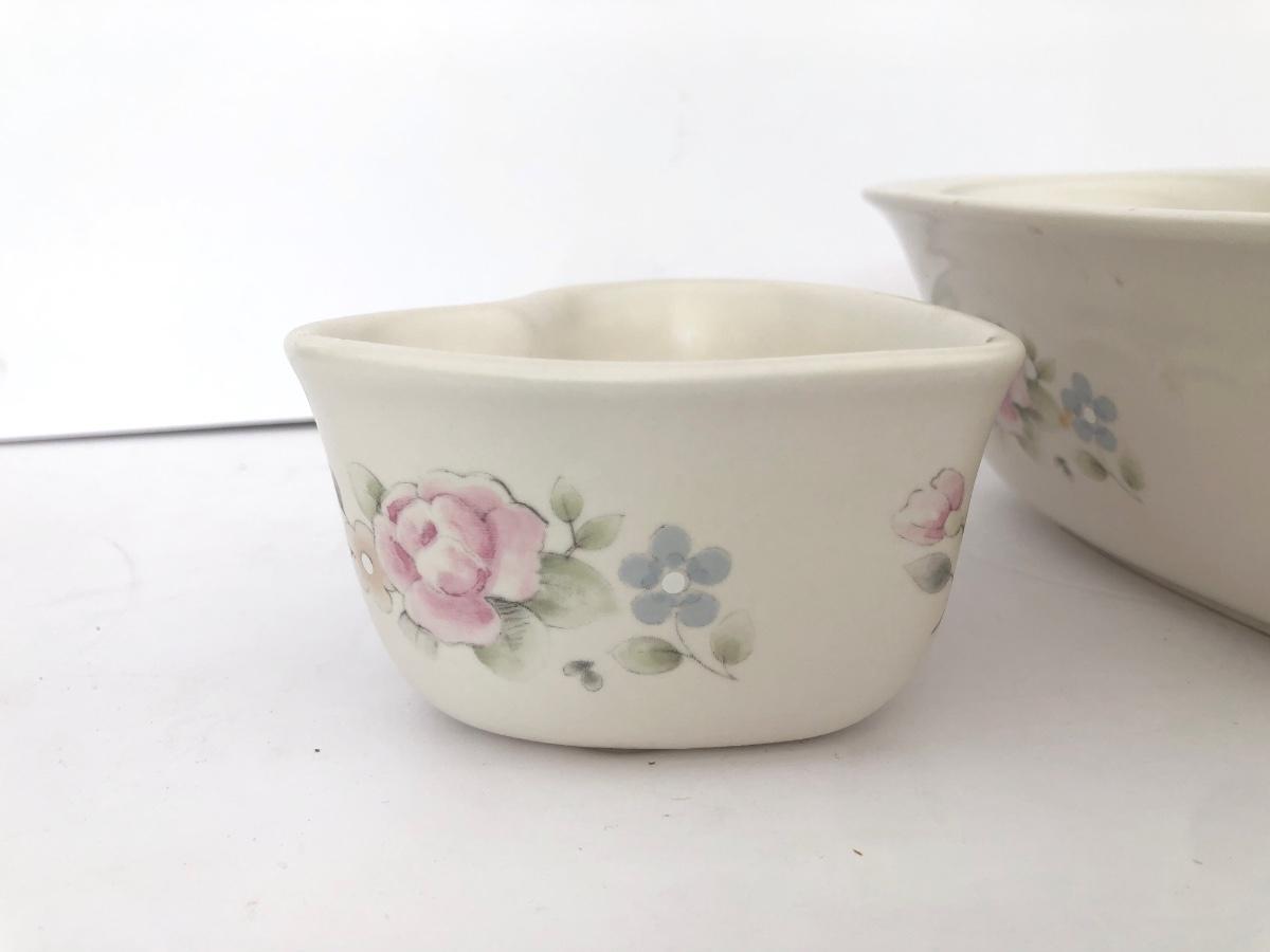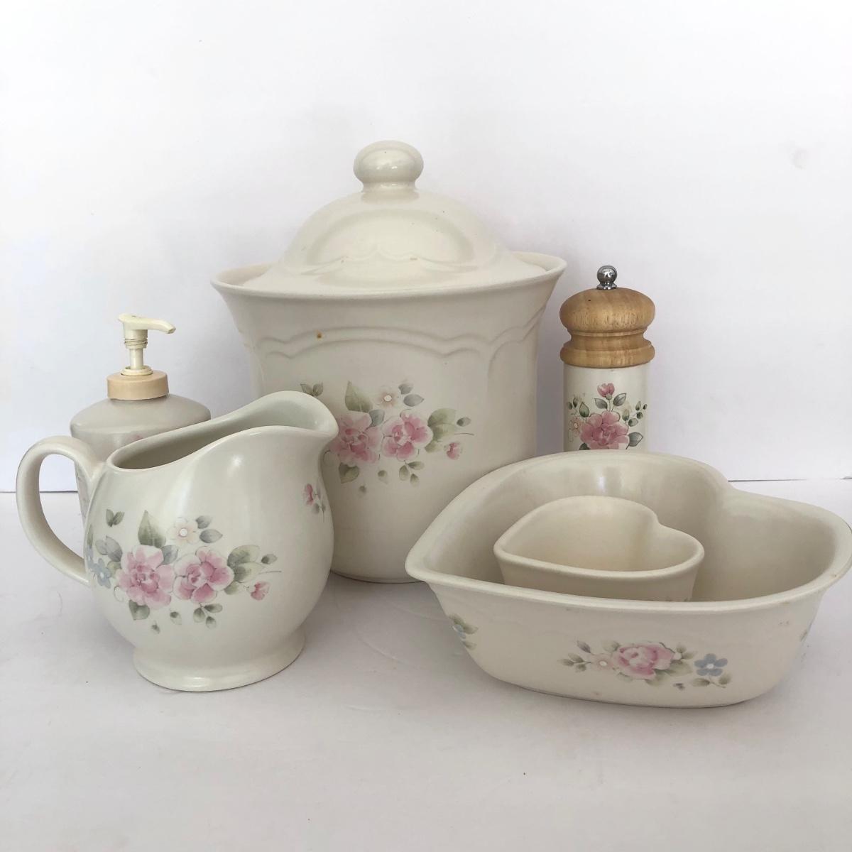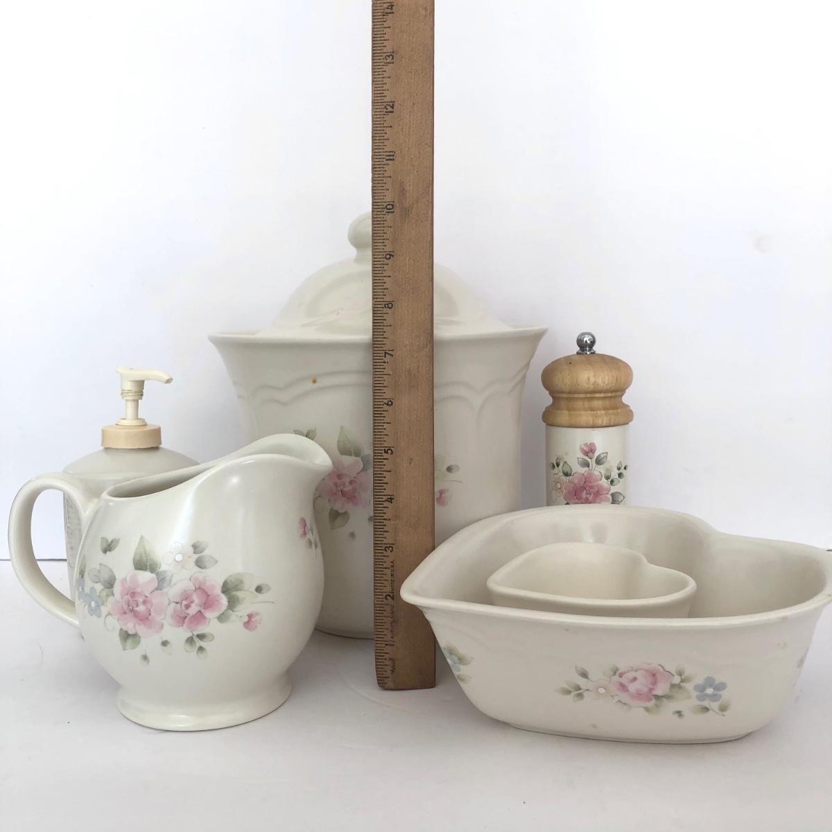 LOT 158G: Pfaltzgraff Tea Rose - Cookie Jar, Heart Shaped Dishes, Pepper Mill, Soap Dispenser & Pitcher
