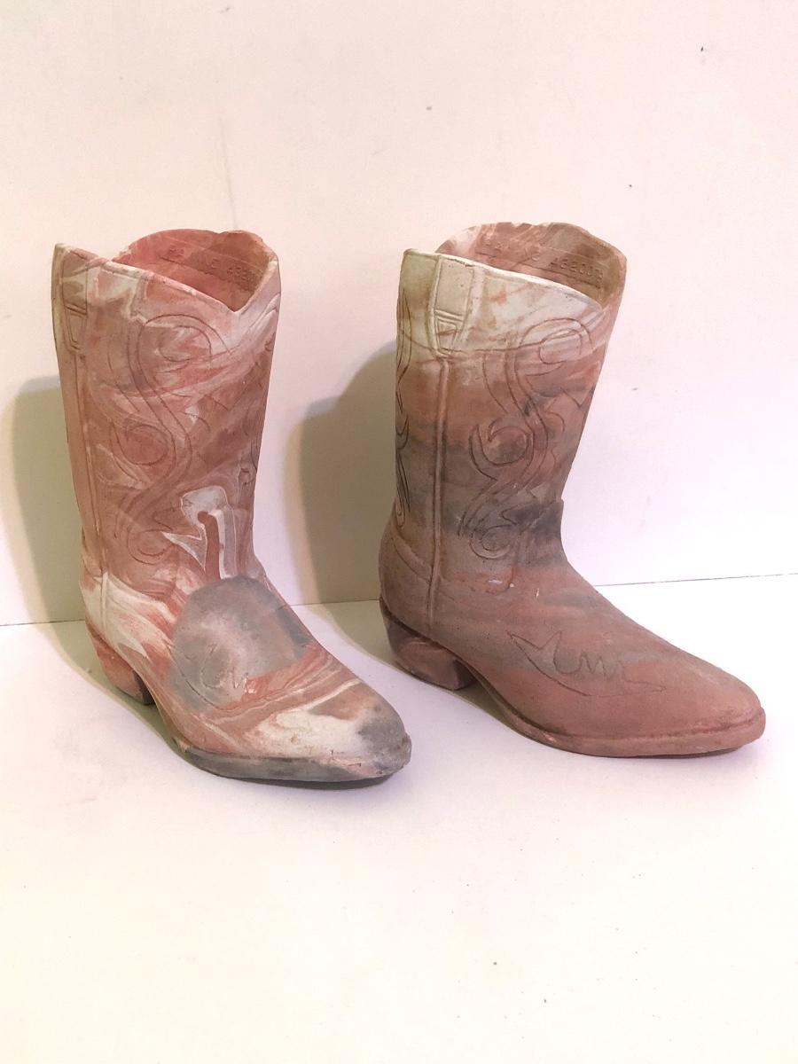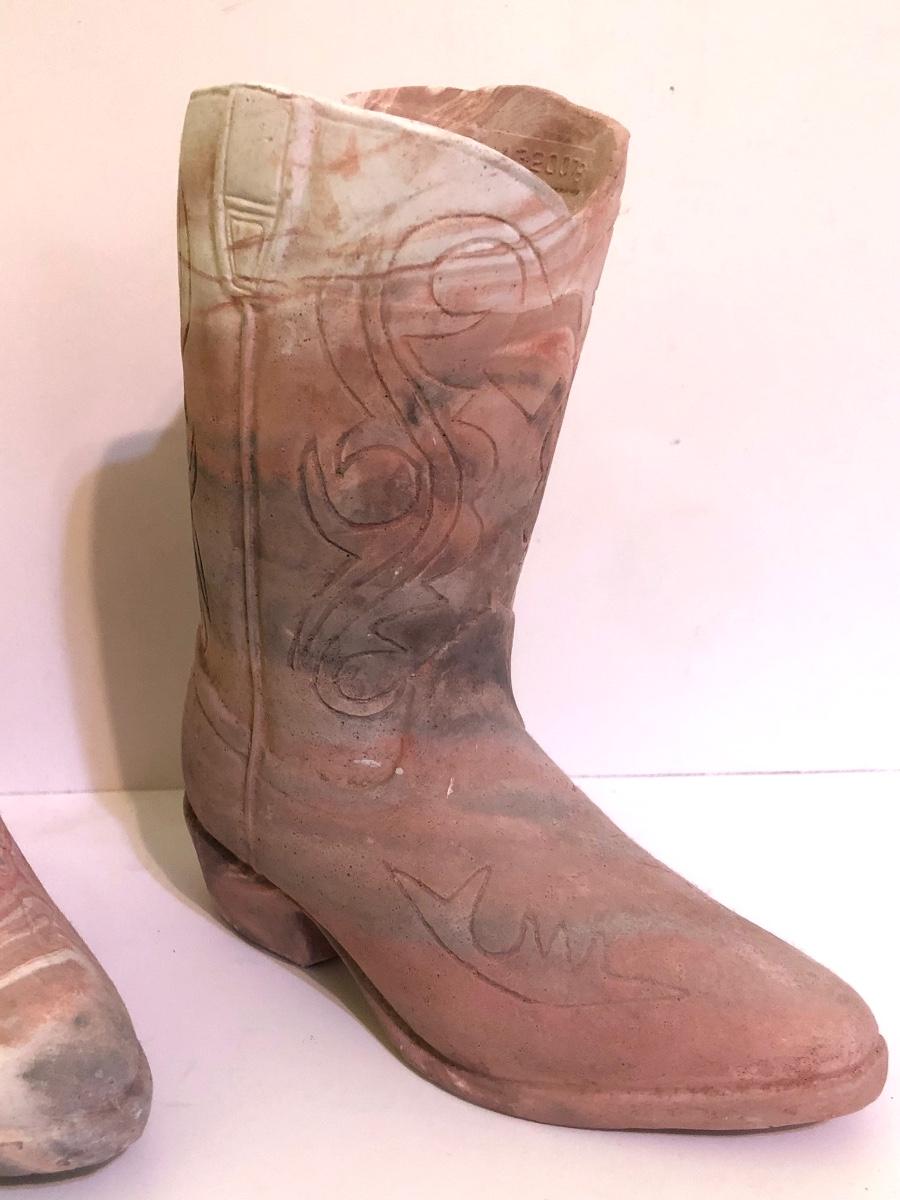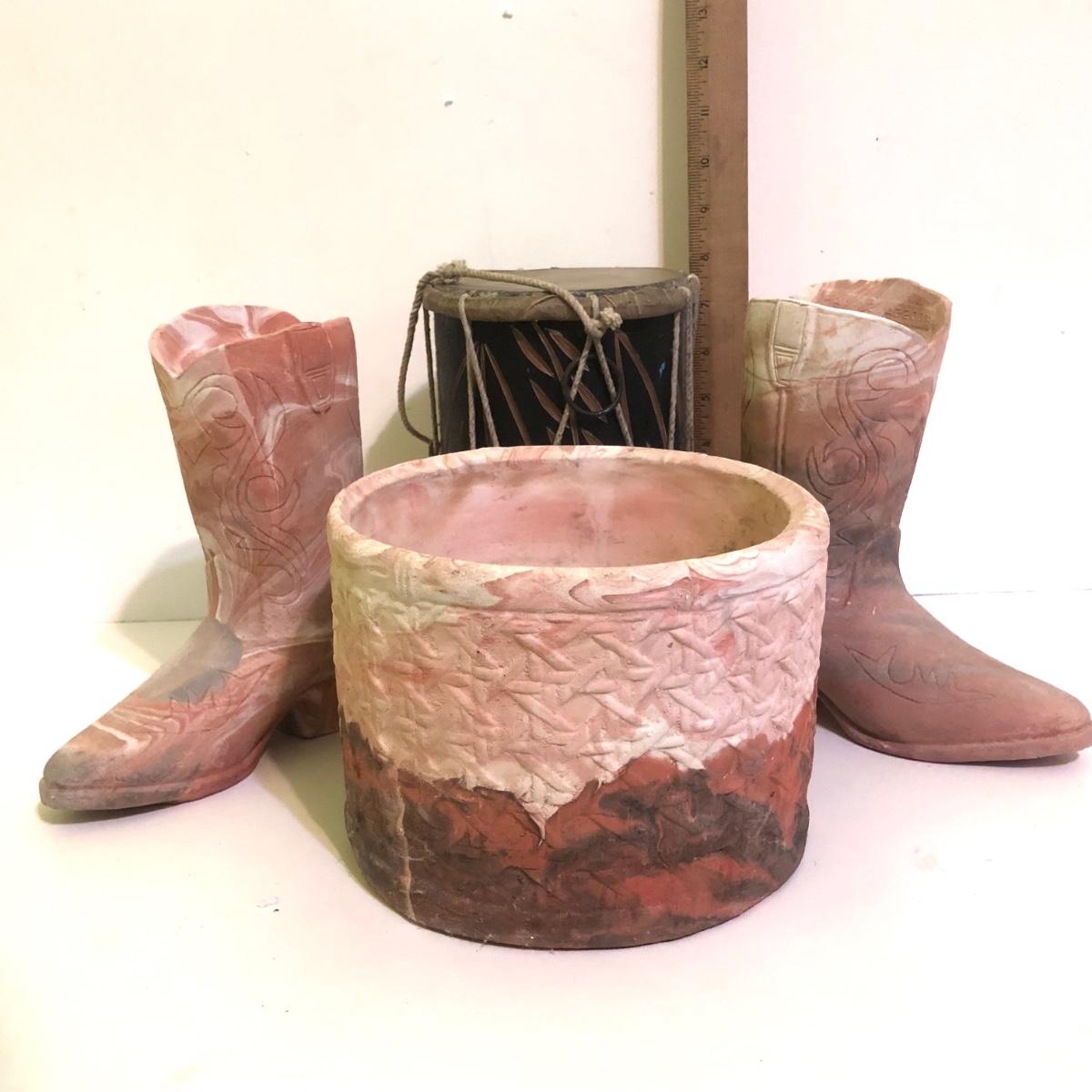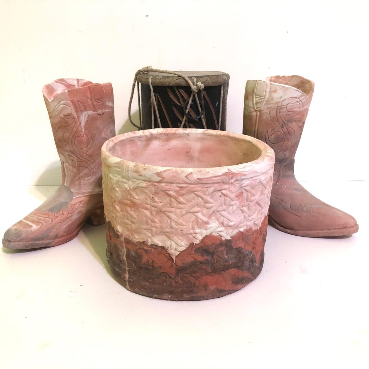 LOT 197Y: Hand Made Drum, Clay Cowboy Boots & Clay Planter