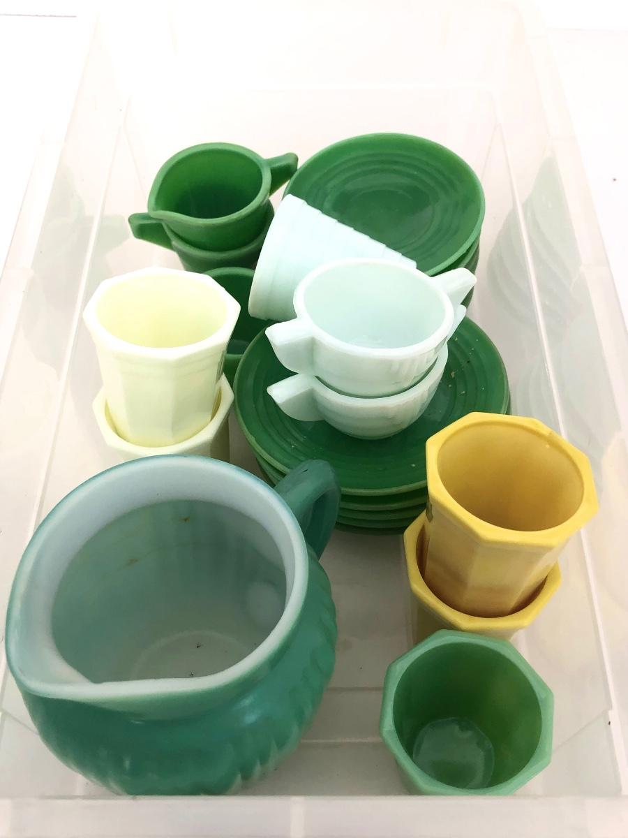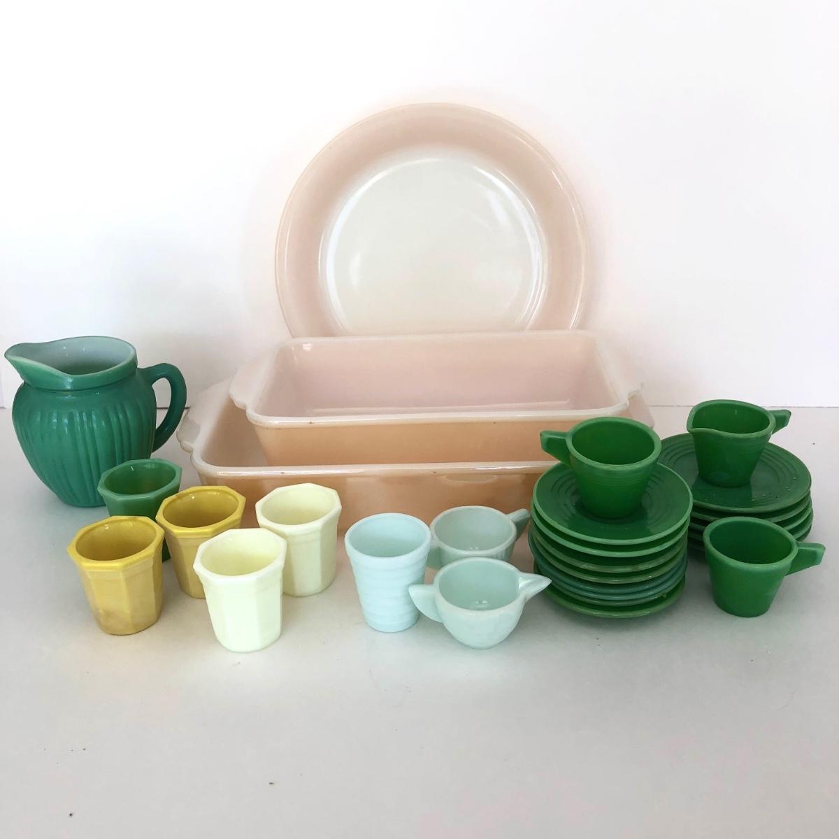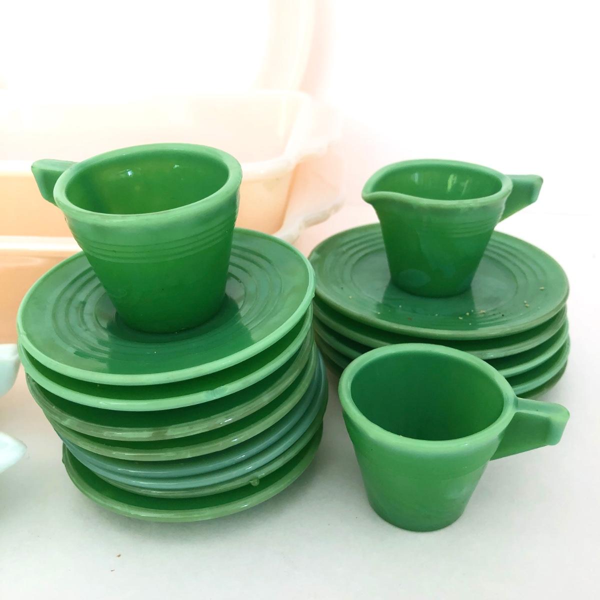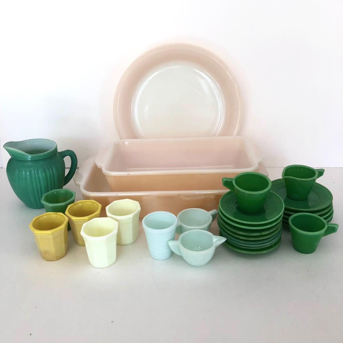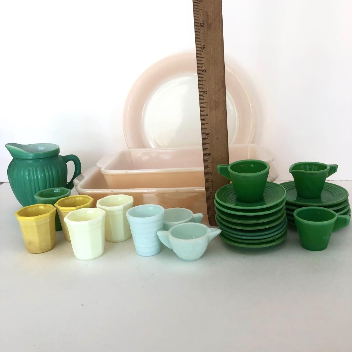 LOT 203G: Vintage Fireking Orange & White Milk Glass w/ Unique Color Glass Childs Tea Set Pieces