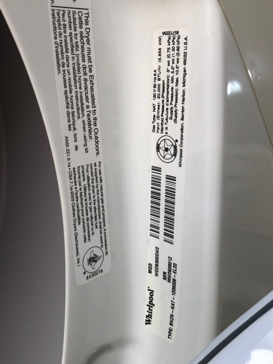 LOT 206G: Whirlpool Duet Sport Electronic Gas Dryer Model WGD8300SW2