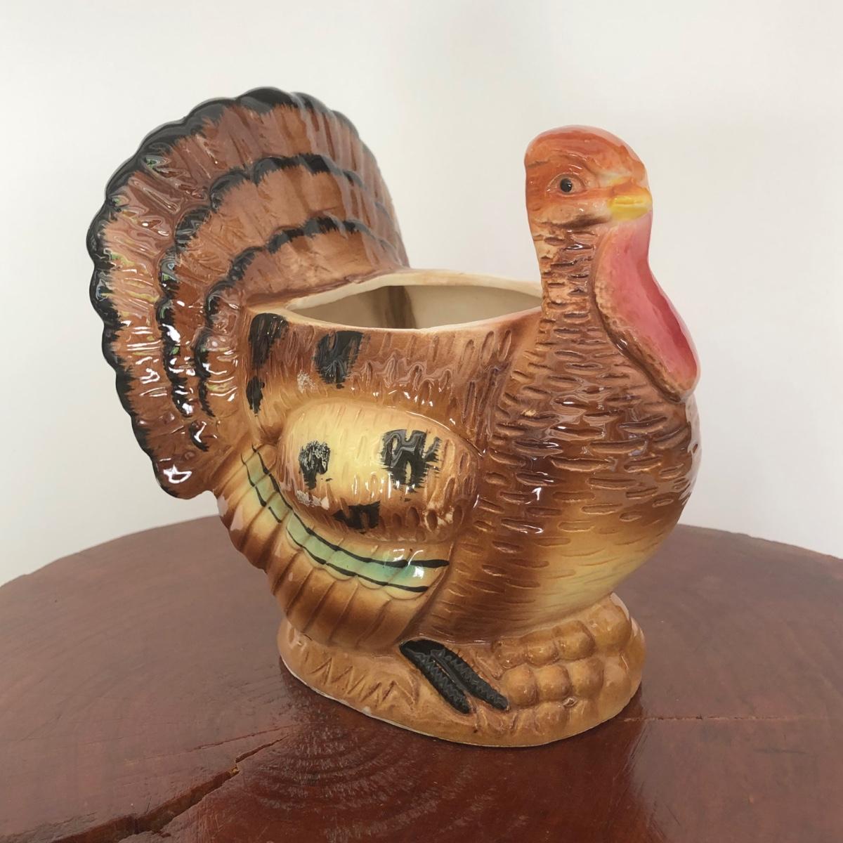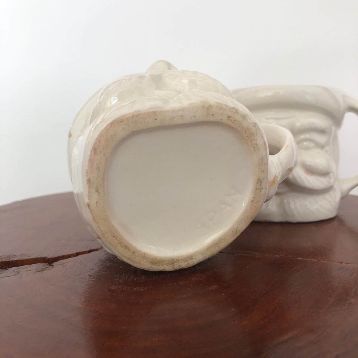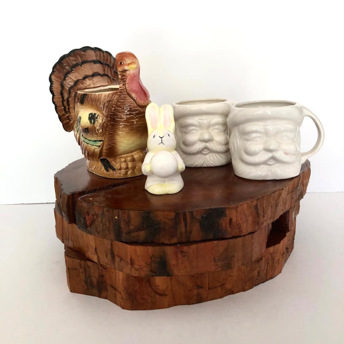 LOT 208G: Holiday Collection - Santa Head Mugs made in Japan, Turkey Planter, Enesco Bunny & 3 Wood Slice Varnished Display Stands