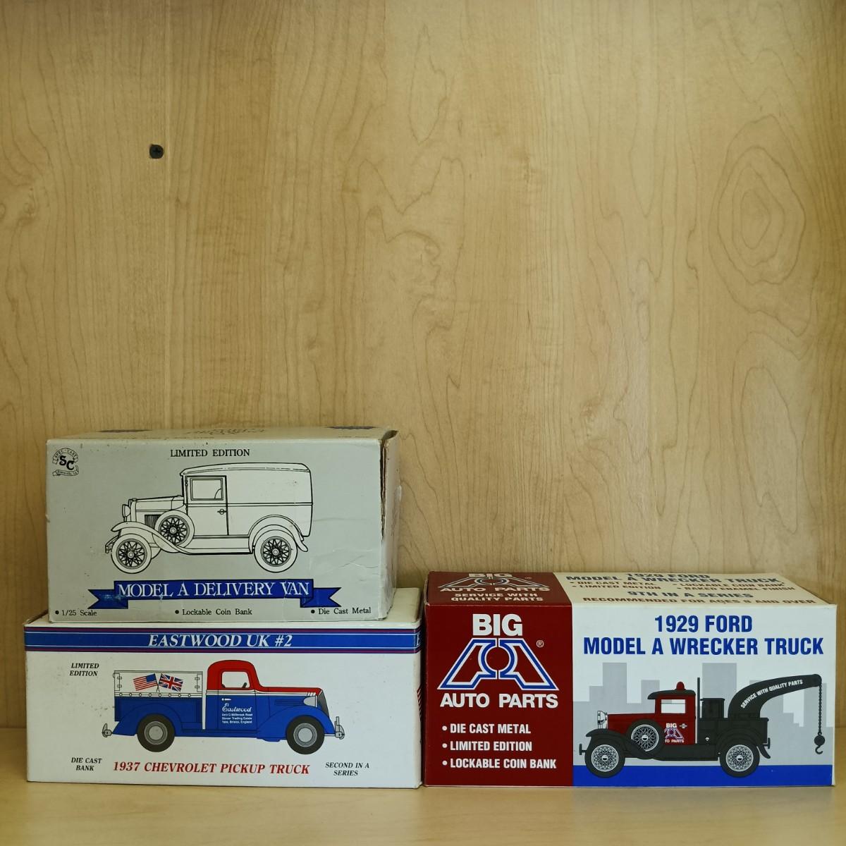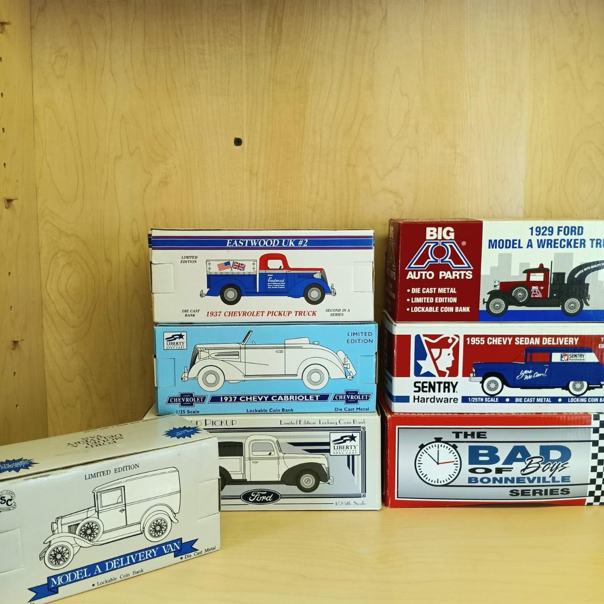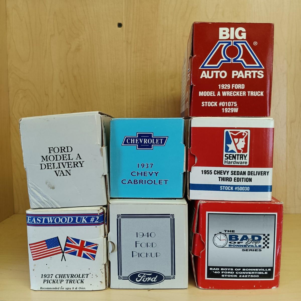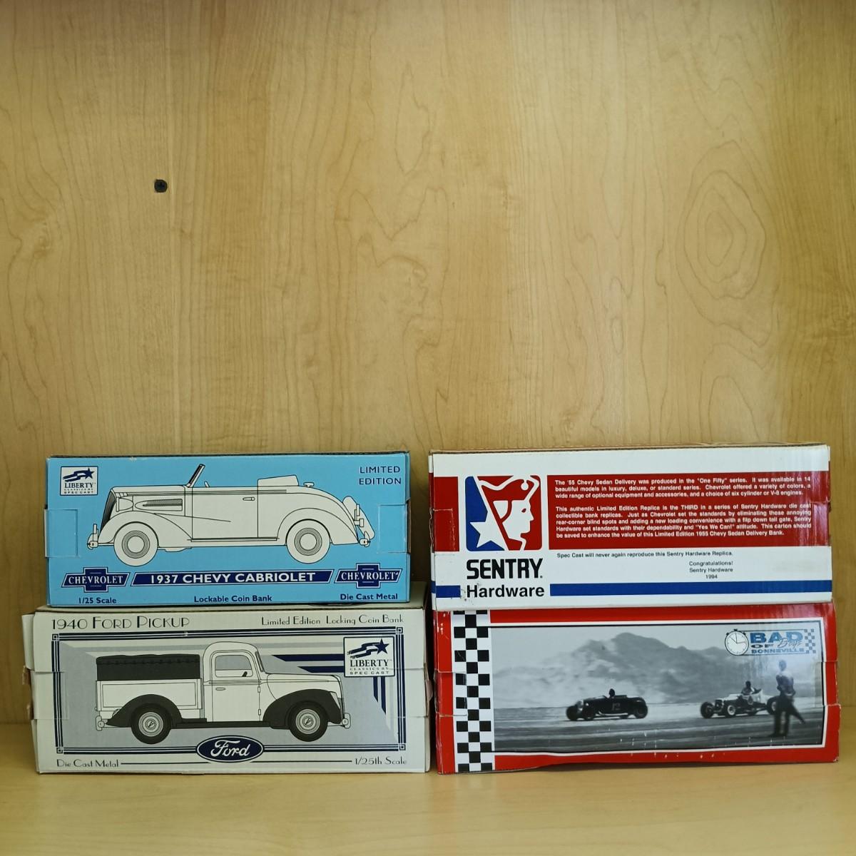 LOT 7: Diecast 1940 Ford Pickup Coin Bank, Bad Boys of Bonneville '40 Ford Convertible Model Car & More