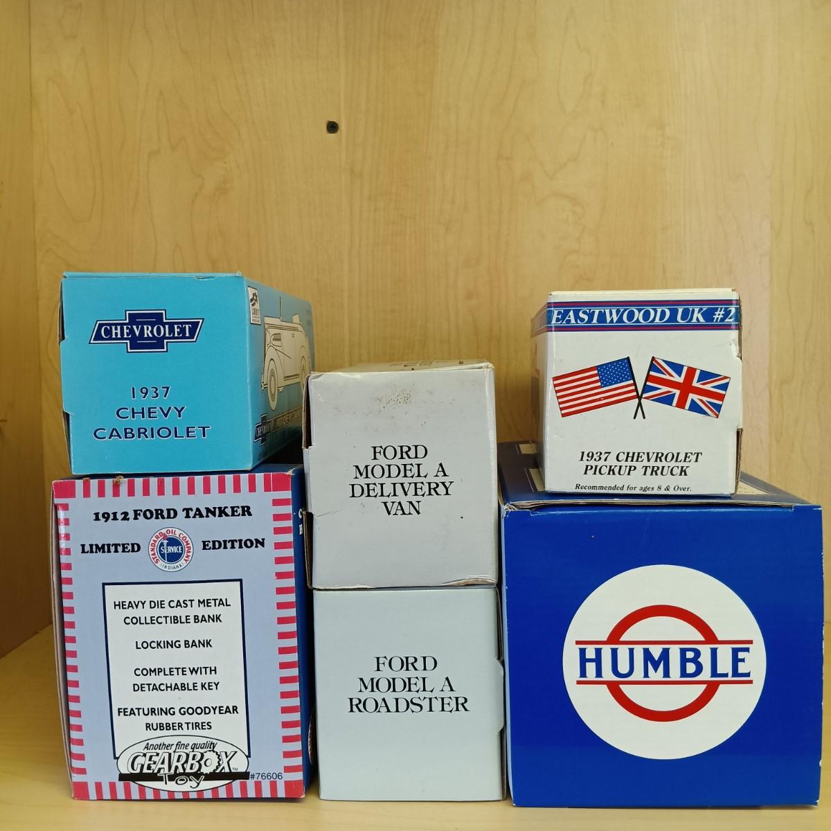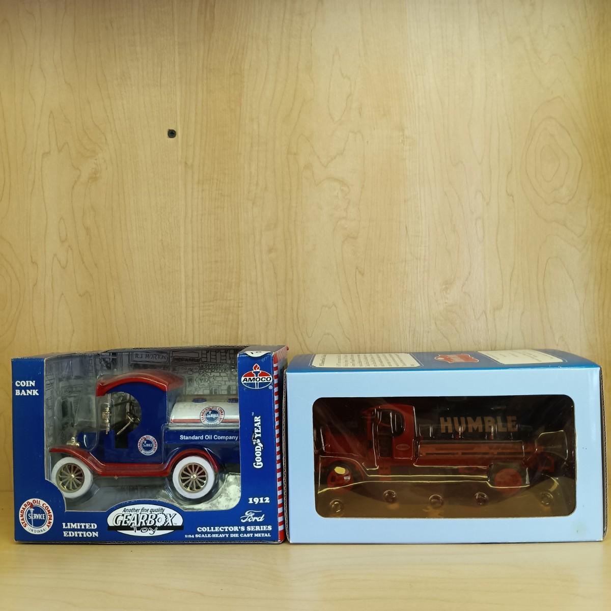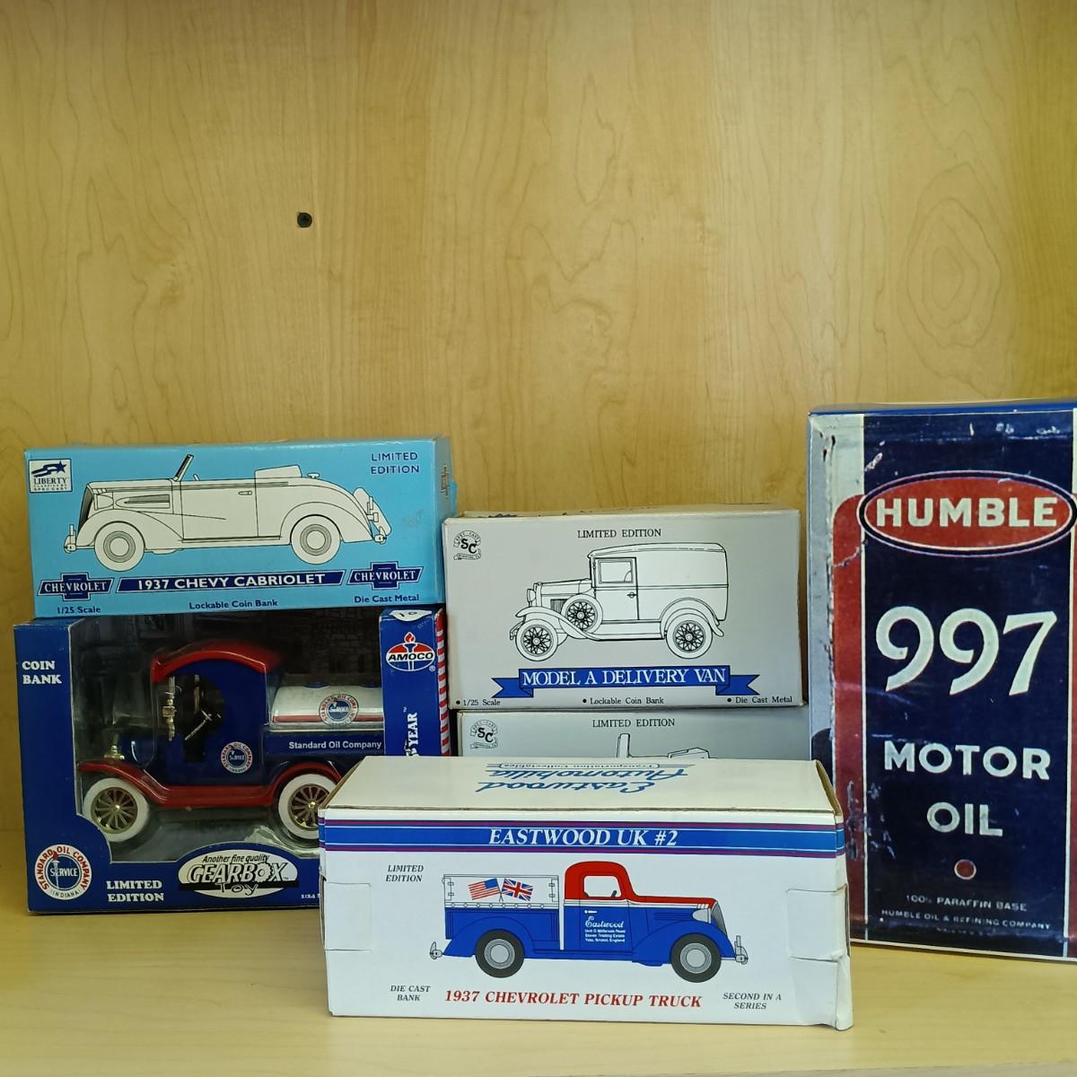 LOT 8: Set of 5 Diecast Model Car Coin Banks w/ Exxon 1923 Kenworth Humble Oil Tanker Truck Model