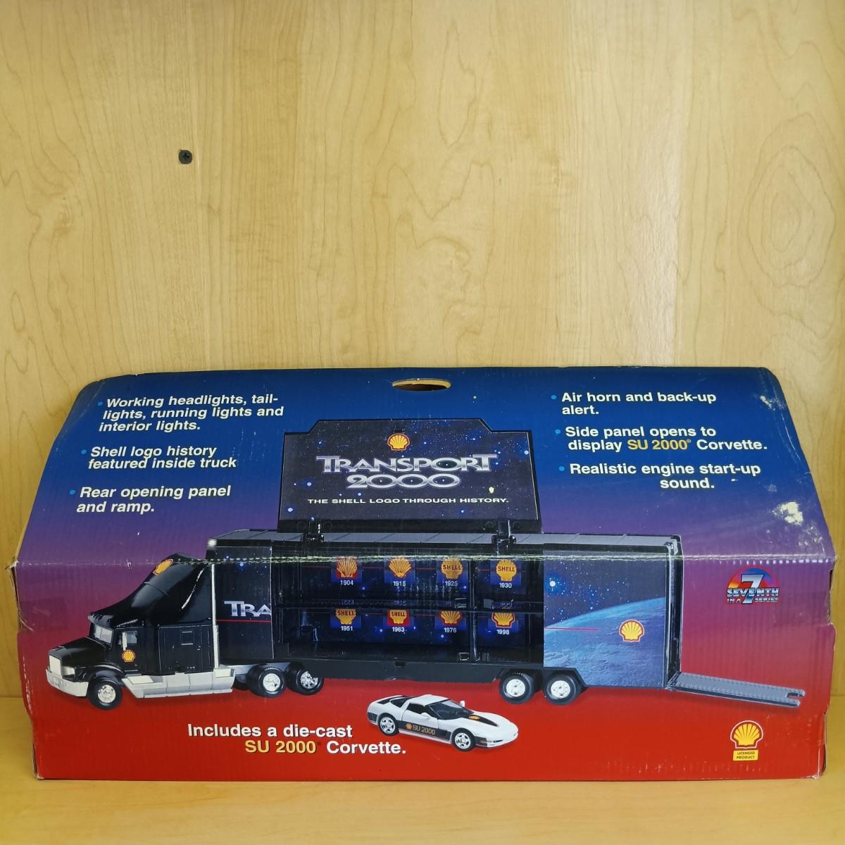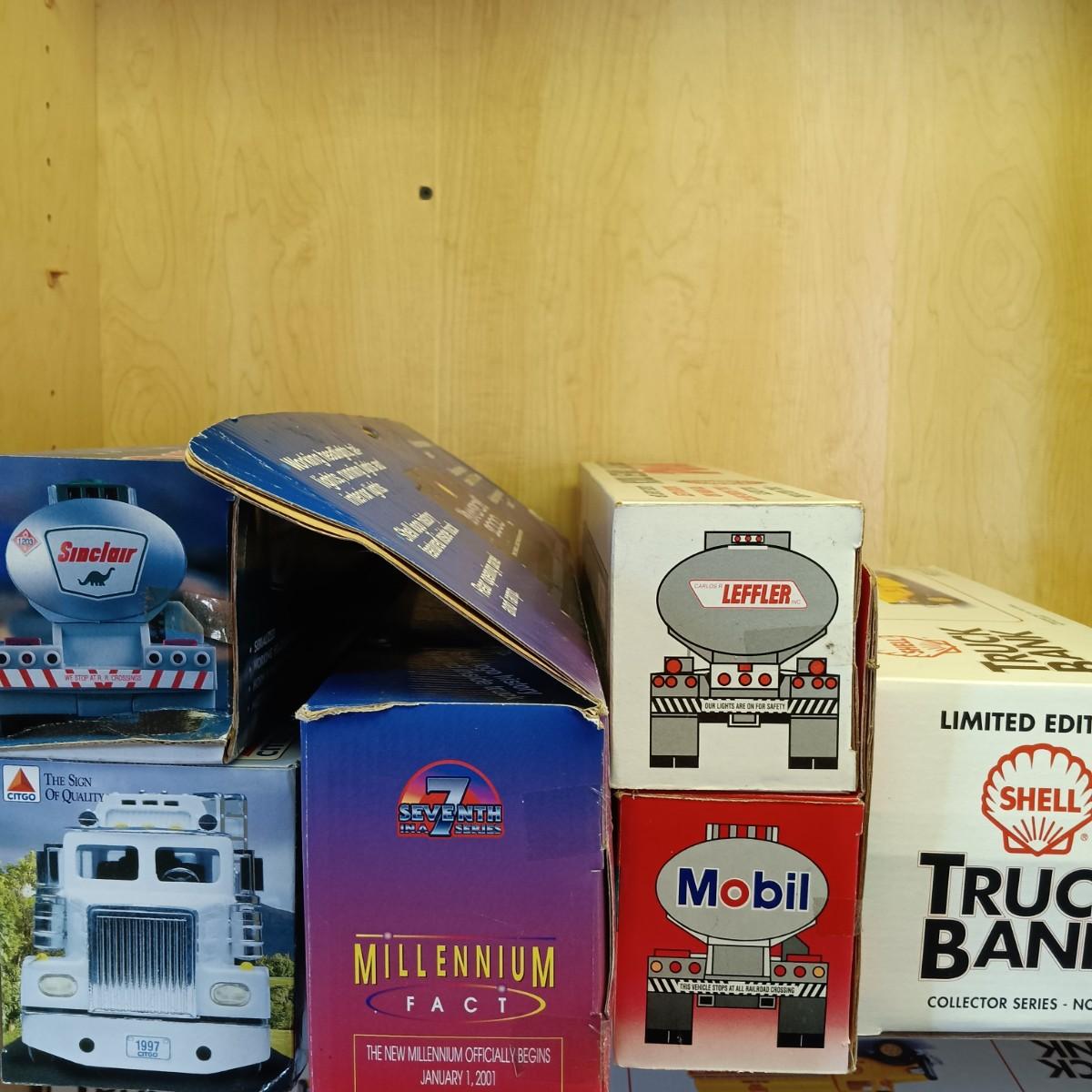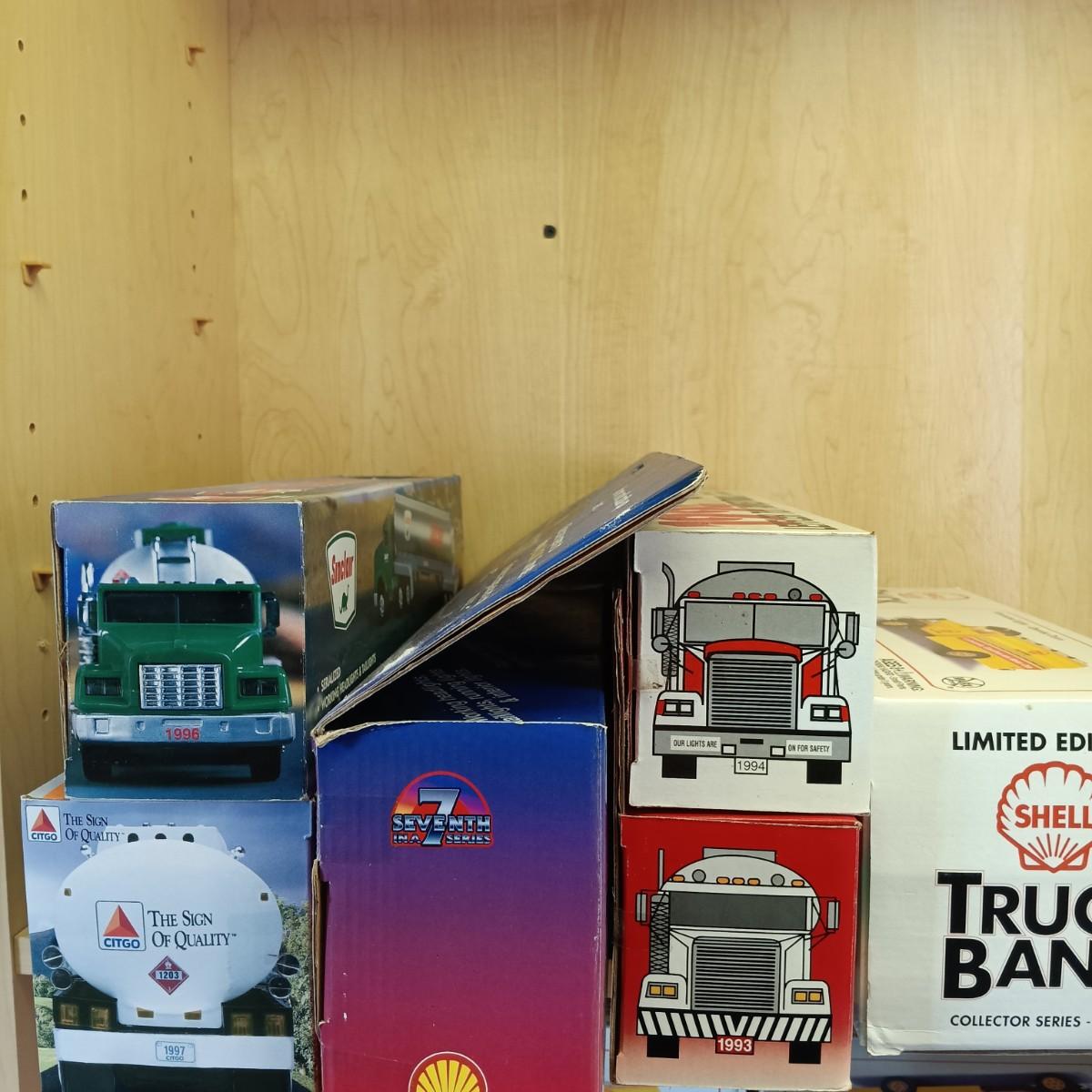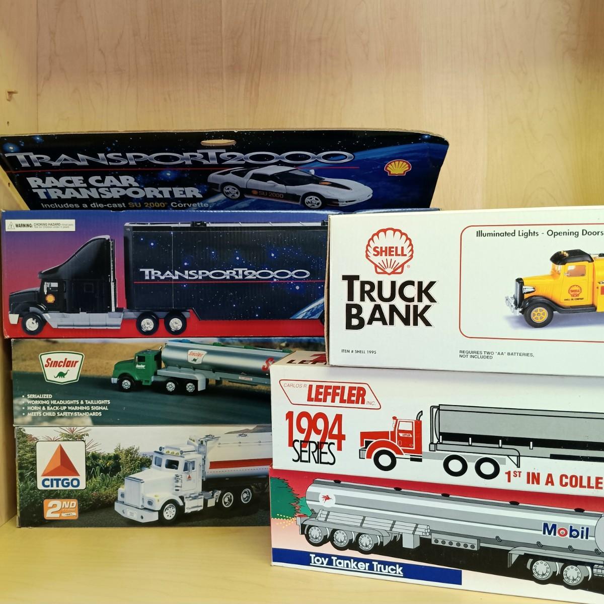 LOT 13: Loeffler 1994 Collector's Series Toy Truck, Transport 2000 Race Car Transporter, Shell Truck Bank & More