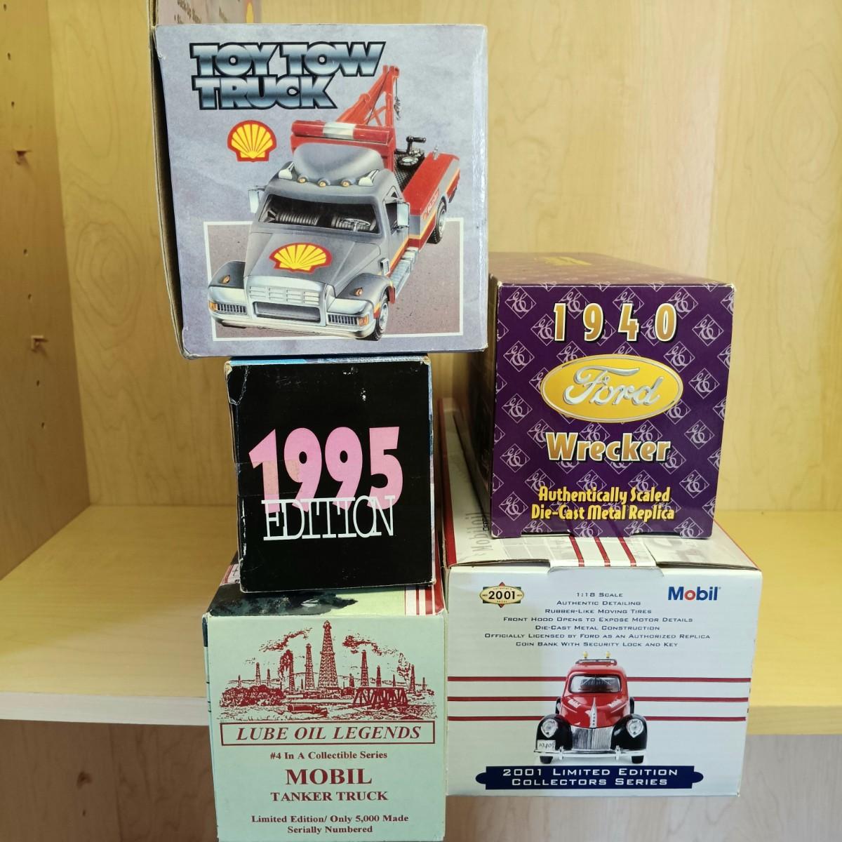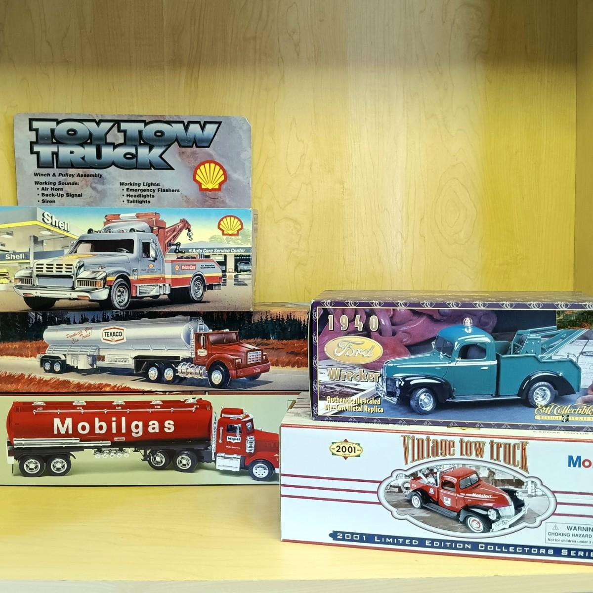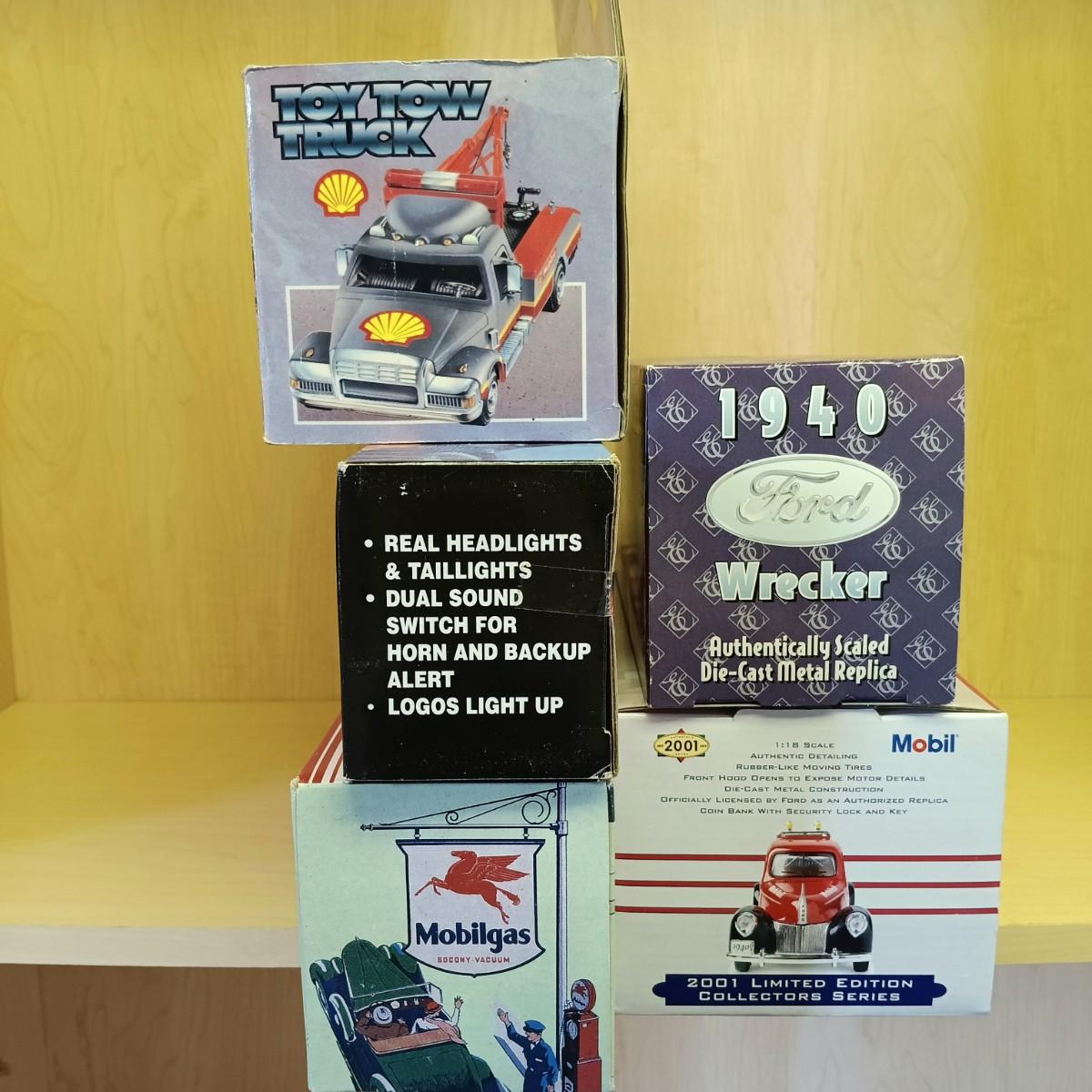 LOT 22: Diecast 1940 Ford Wrecker Replica, Lube Oil Legends Mobil Tanker Truck (Only 5,000 Made), Shell Toy Tow Truck & More