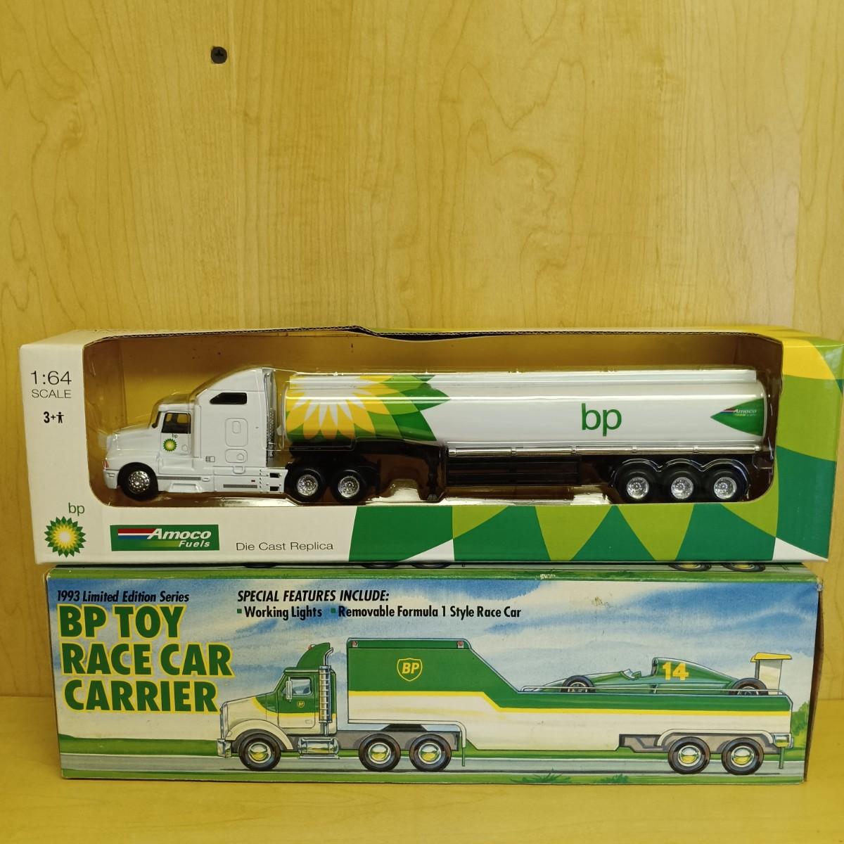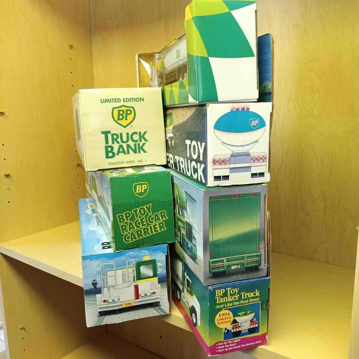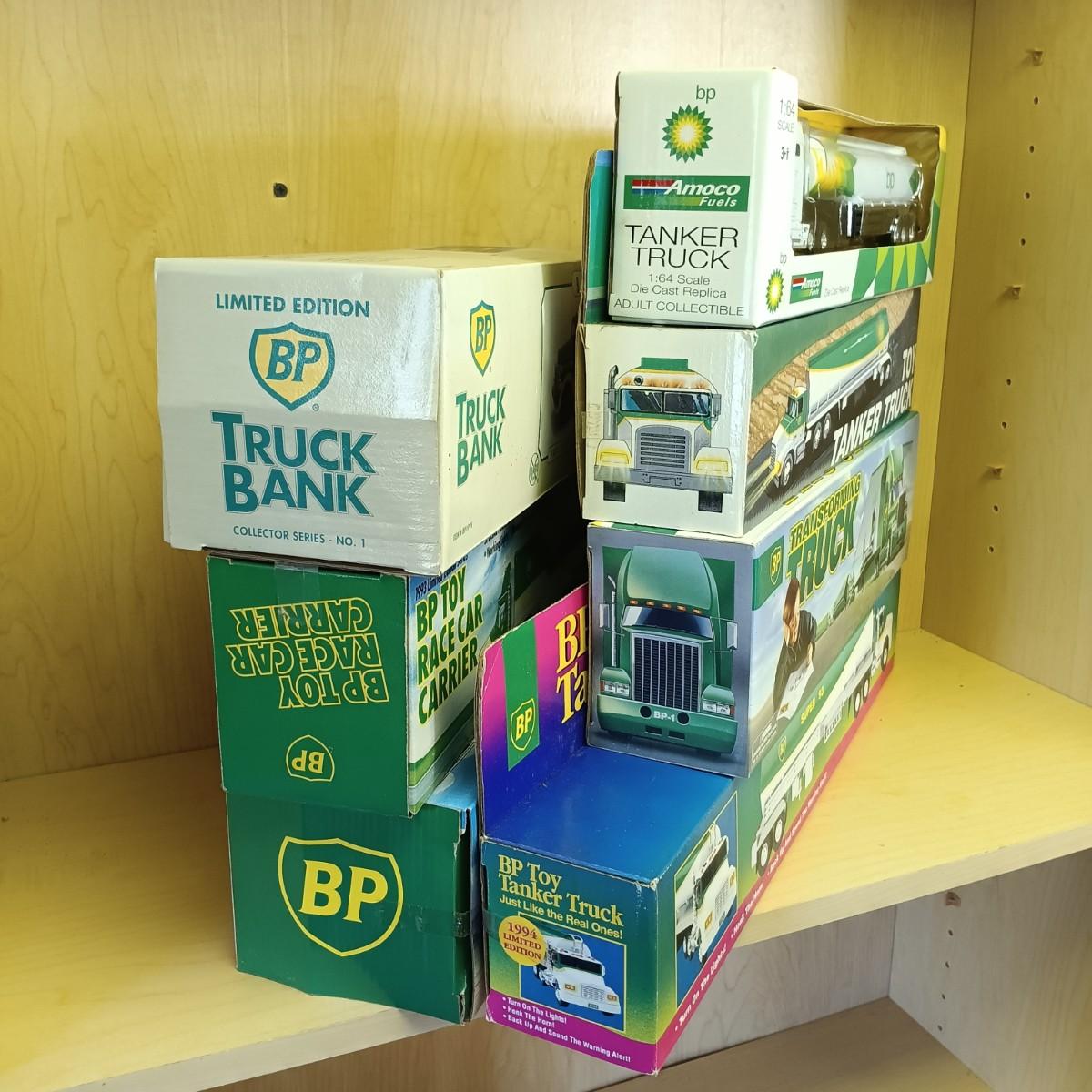 LOT 29: Diecast BP Tanker Truck, 1993 Lim. Ed. BP Race Car Carrier, BP Truck Bank & More