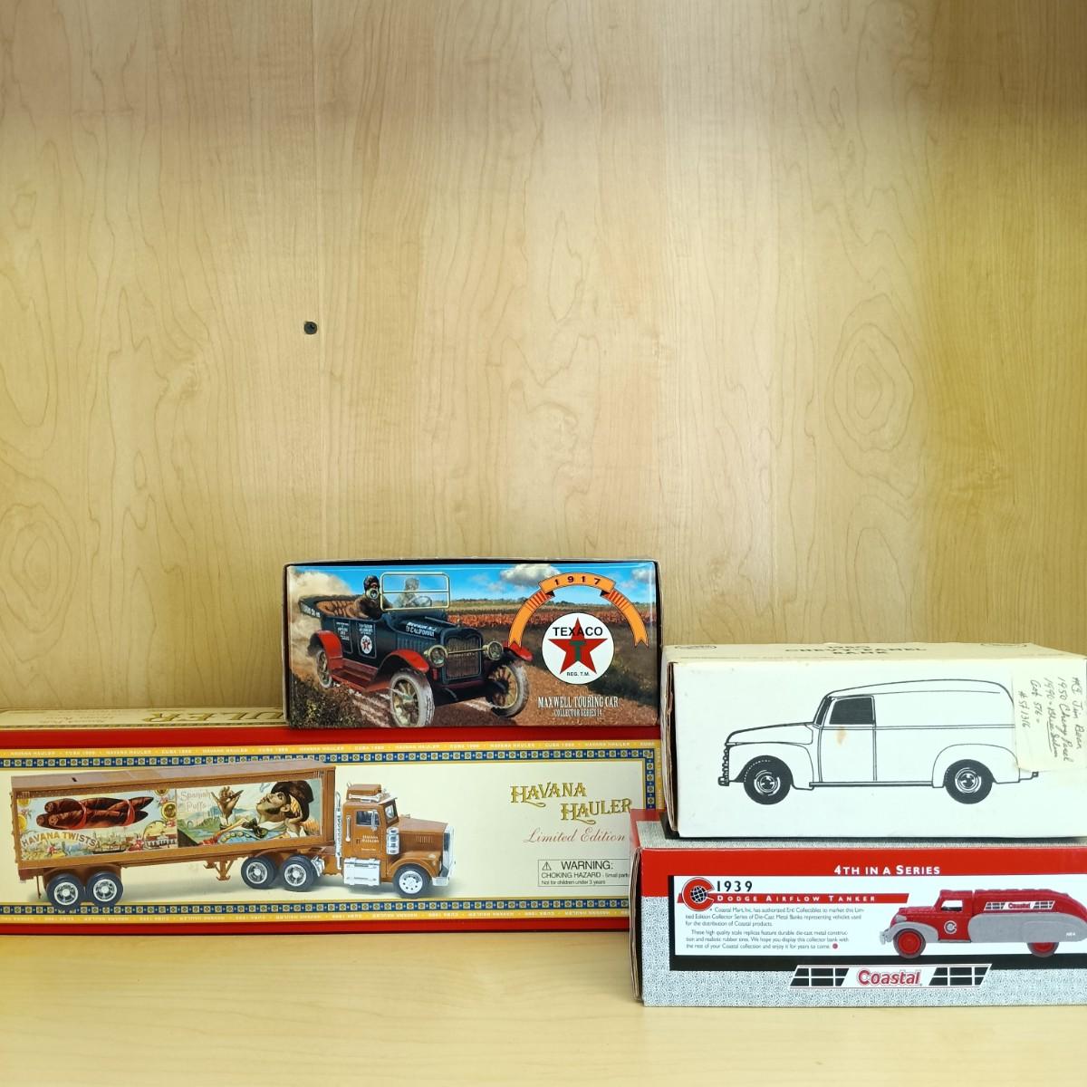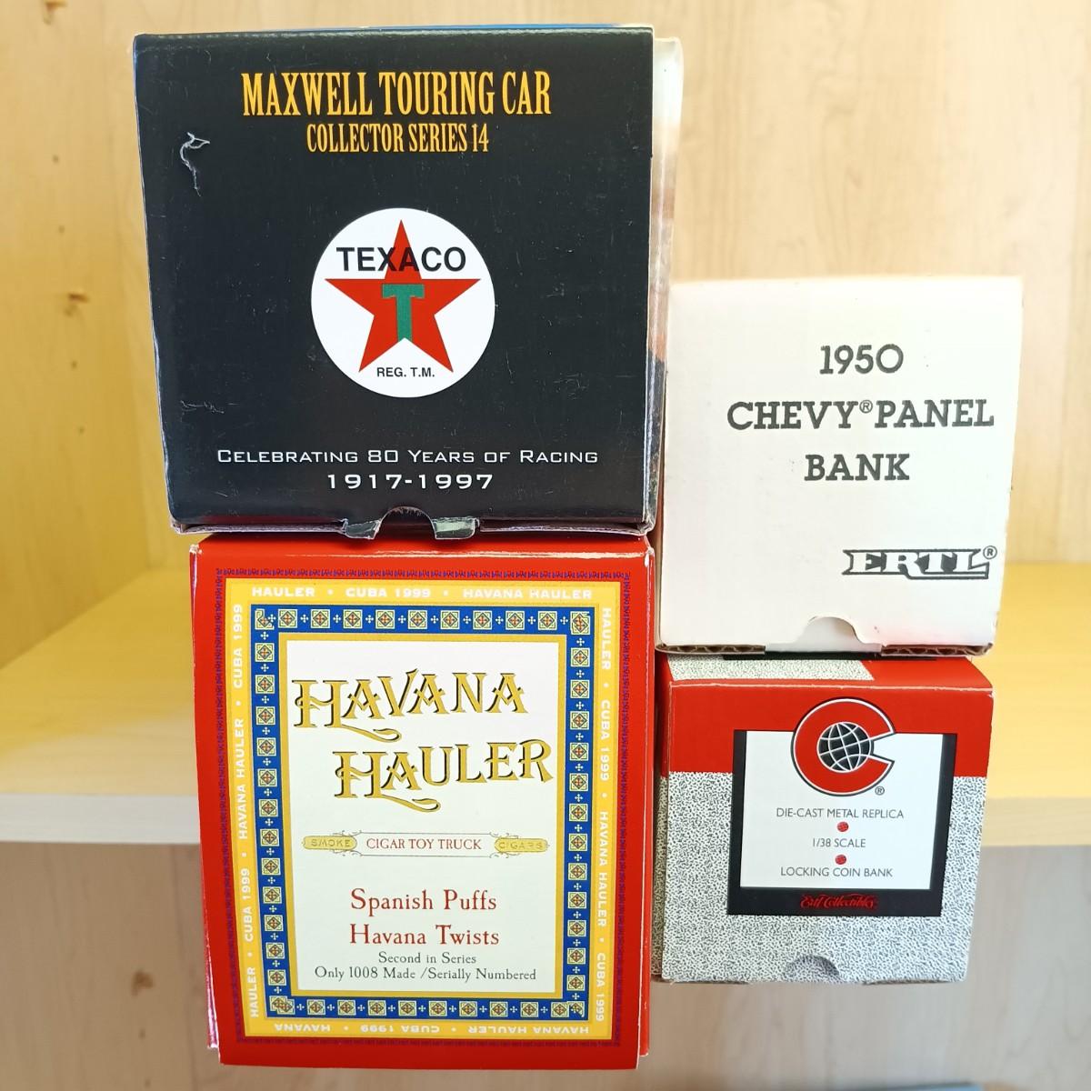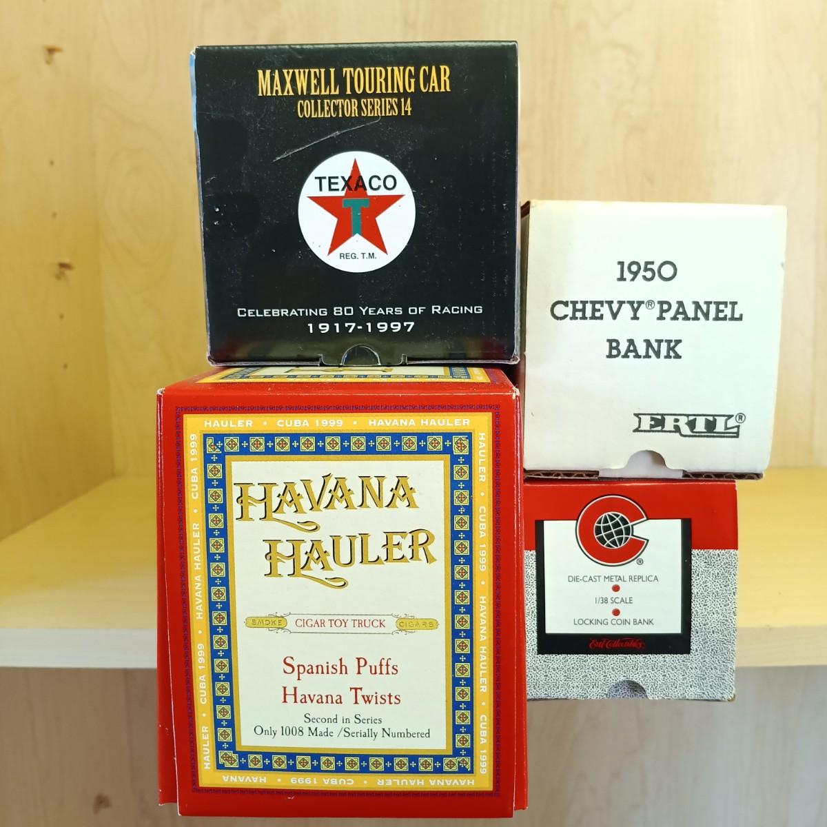 LOT 39: Limited Edition Havana Hauler (Only 1,008 Made), Ertl Jim Beam 1950 Chevy Panel Bank, Texaco 1917 Maxwell Touring Car & More