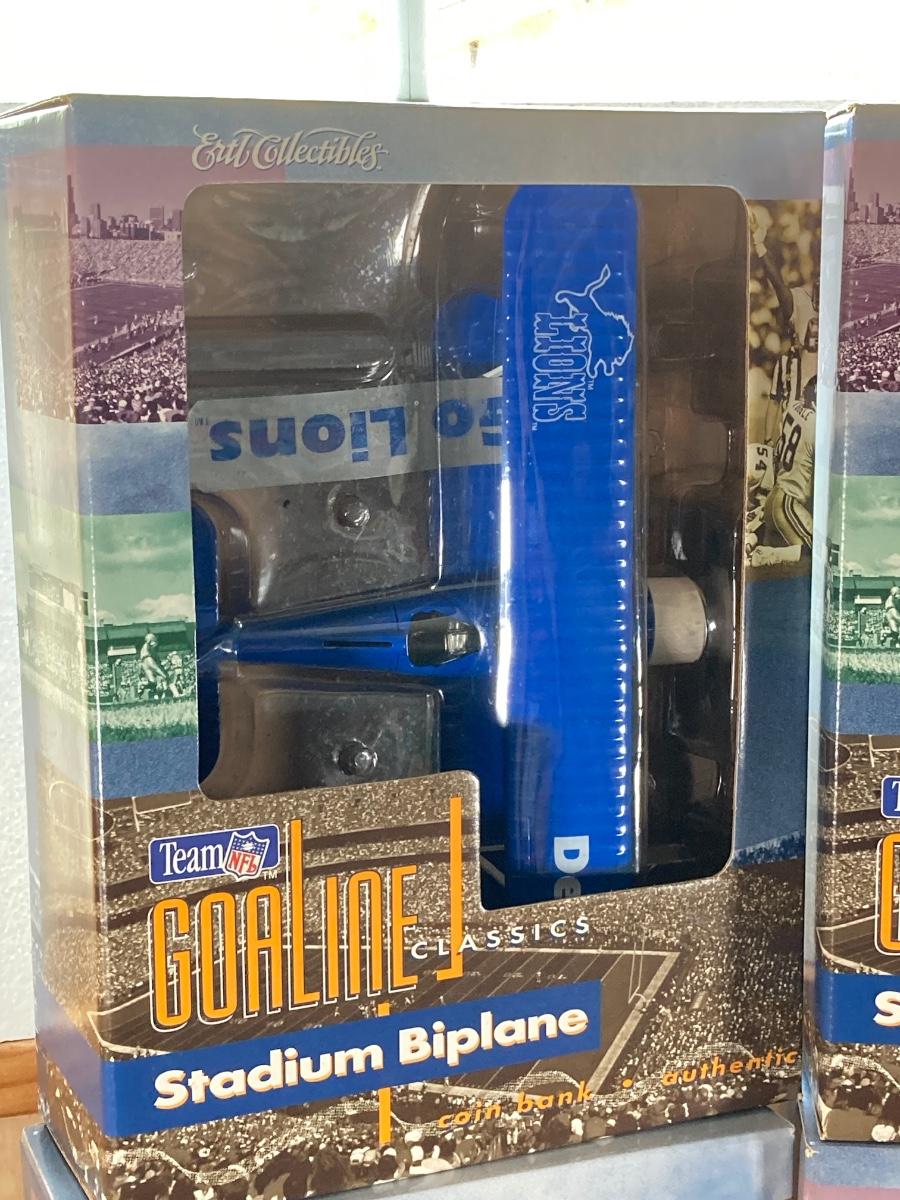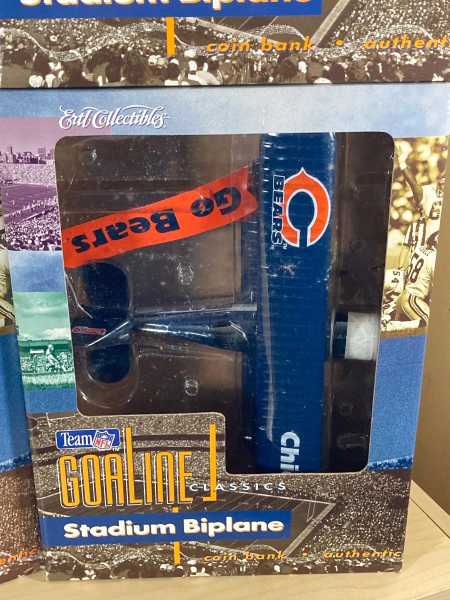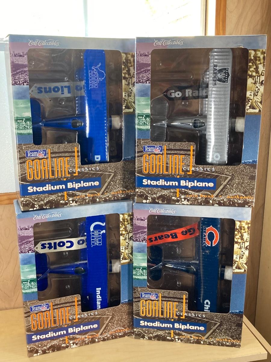 LOT 57: Ertl Collectibles Goaline Stadium Biplane NFL Bank Collection - Lions, Raiders, Colts and Bears