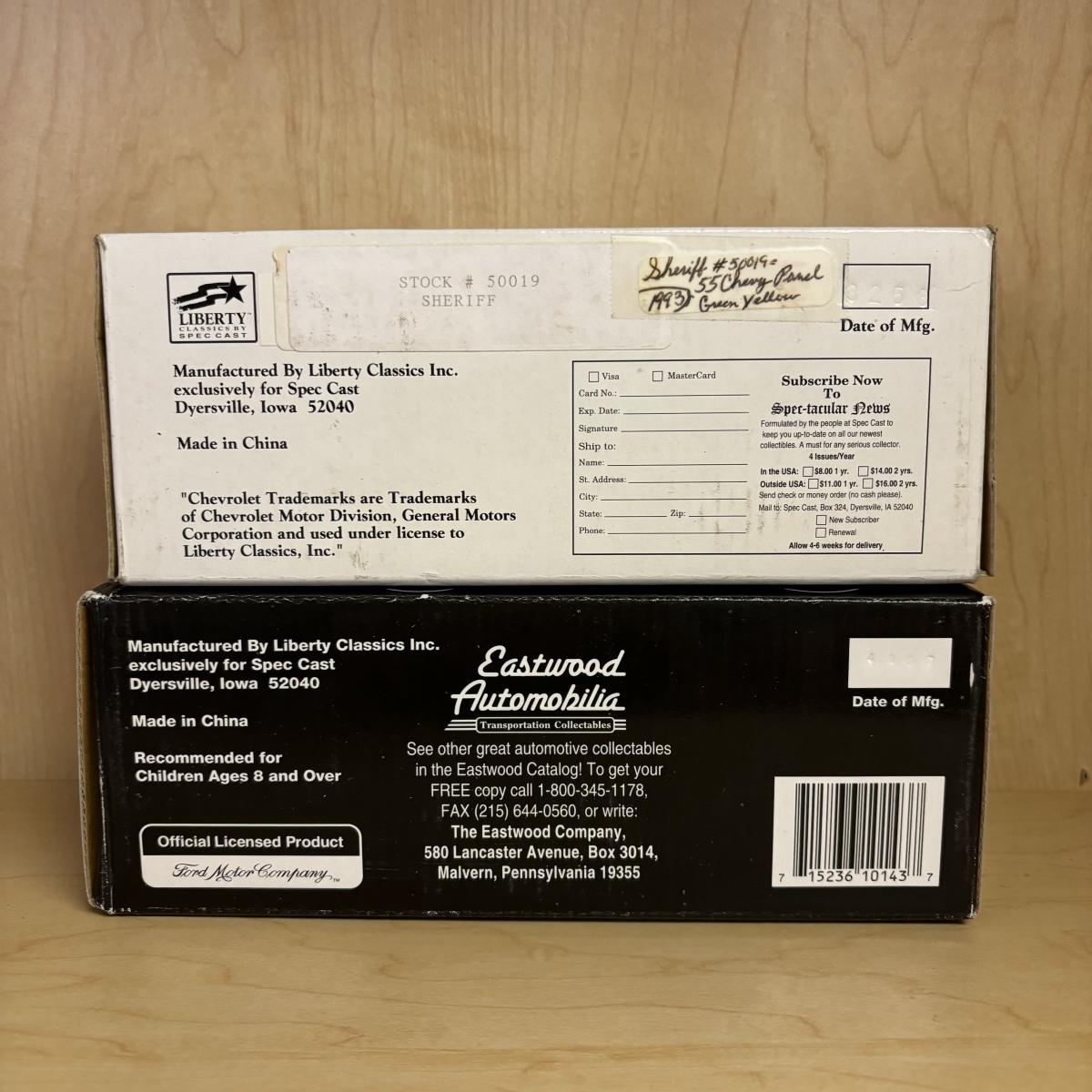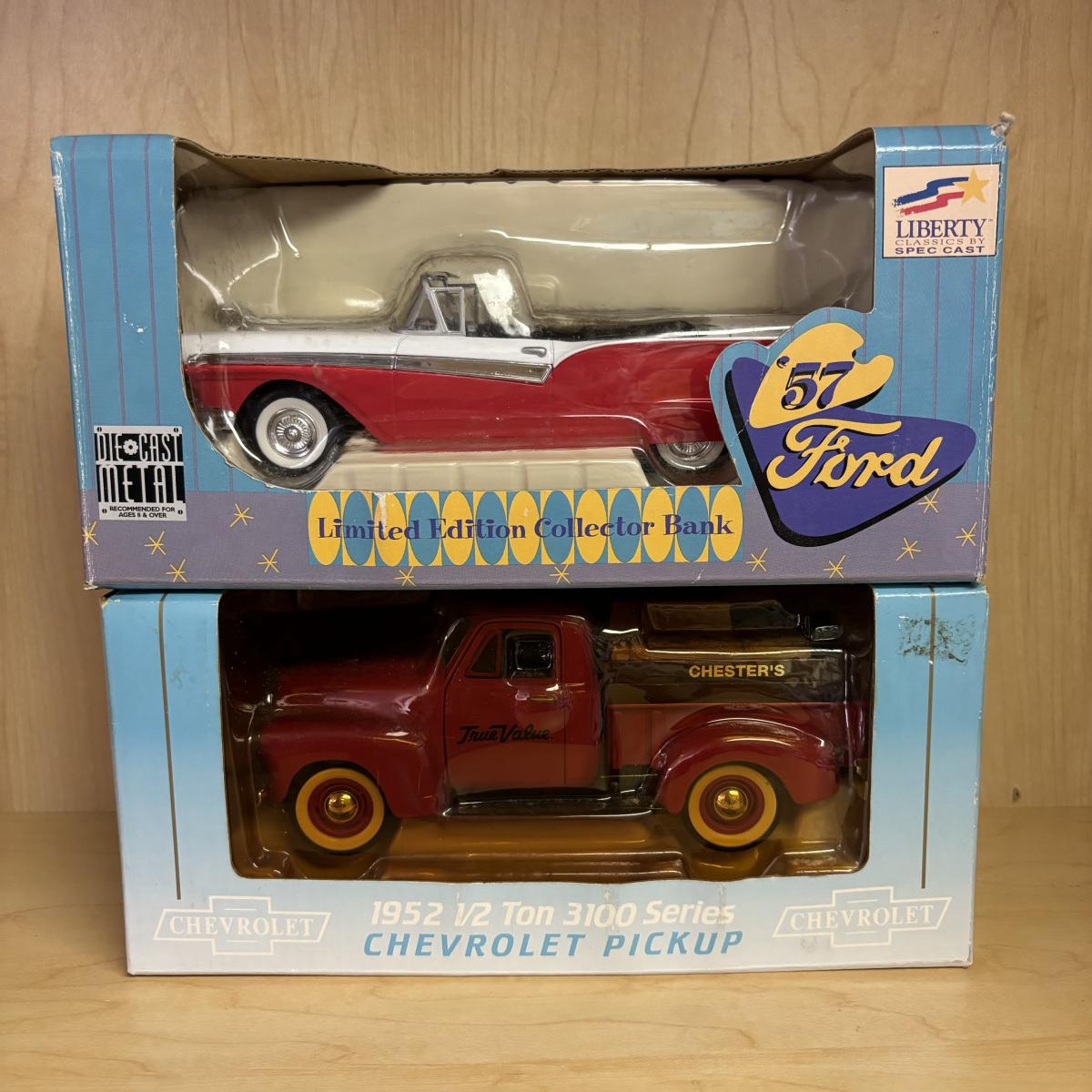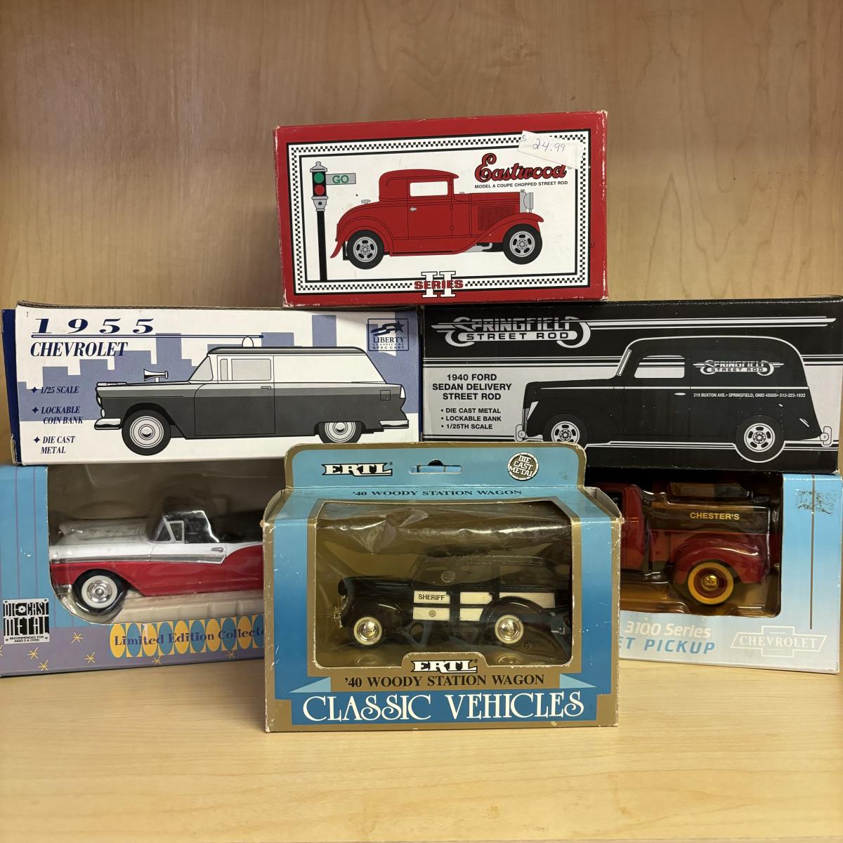LOT 85: Die Cast Collectibles: Ertl 1940 Woody Station Wagon, Liberty Spec 1957 Ford, Eastwood 1952 1/2-ton Chevrolet Pk Up & Springfield 1955 Chevrolet Street Road