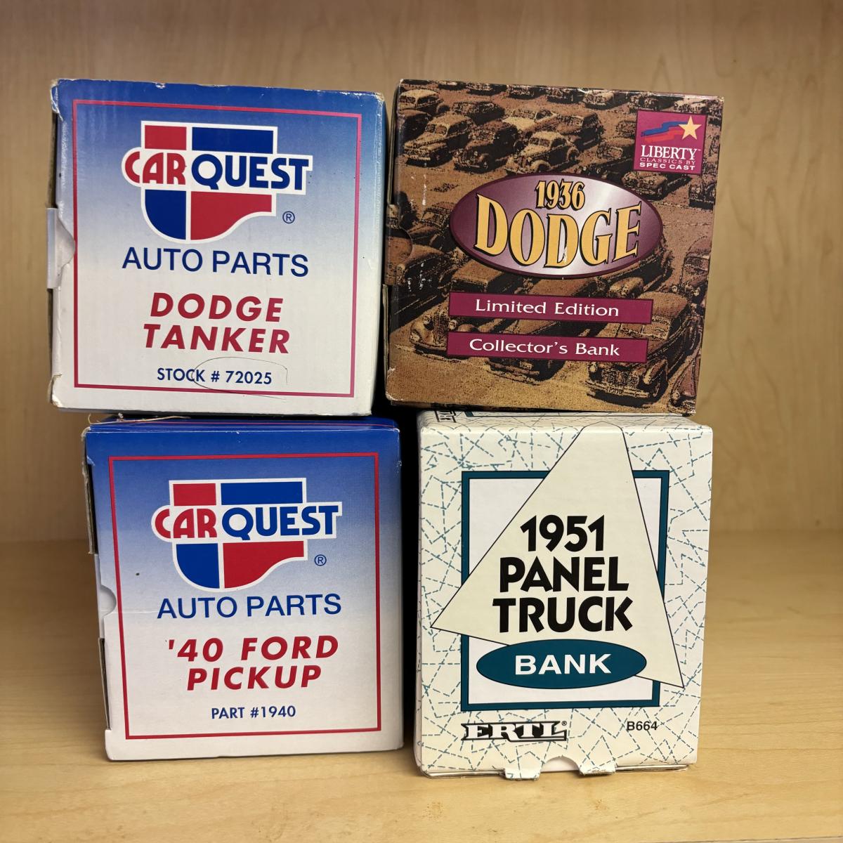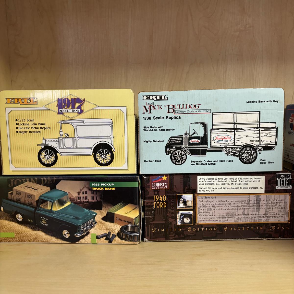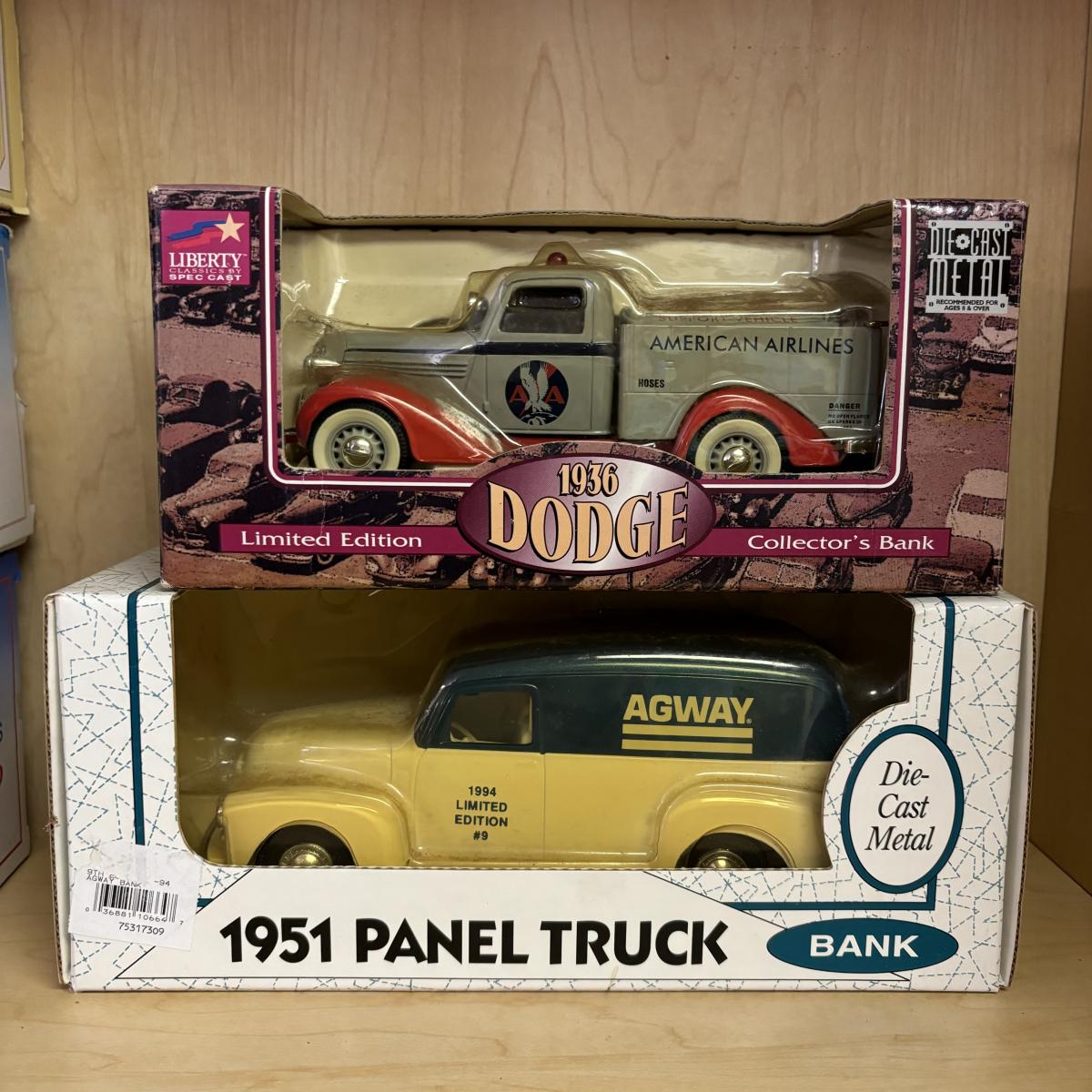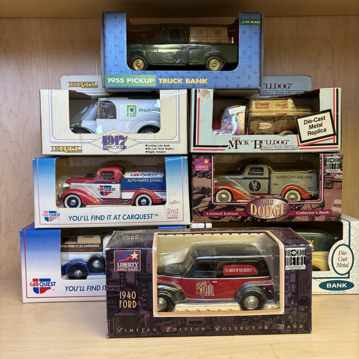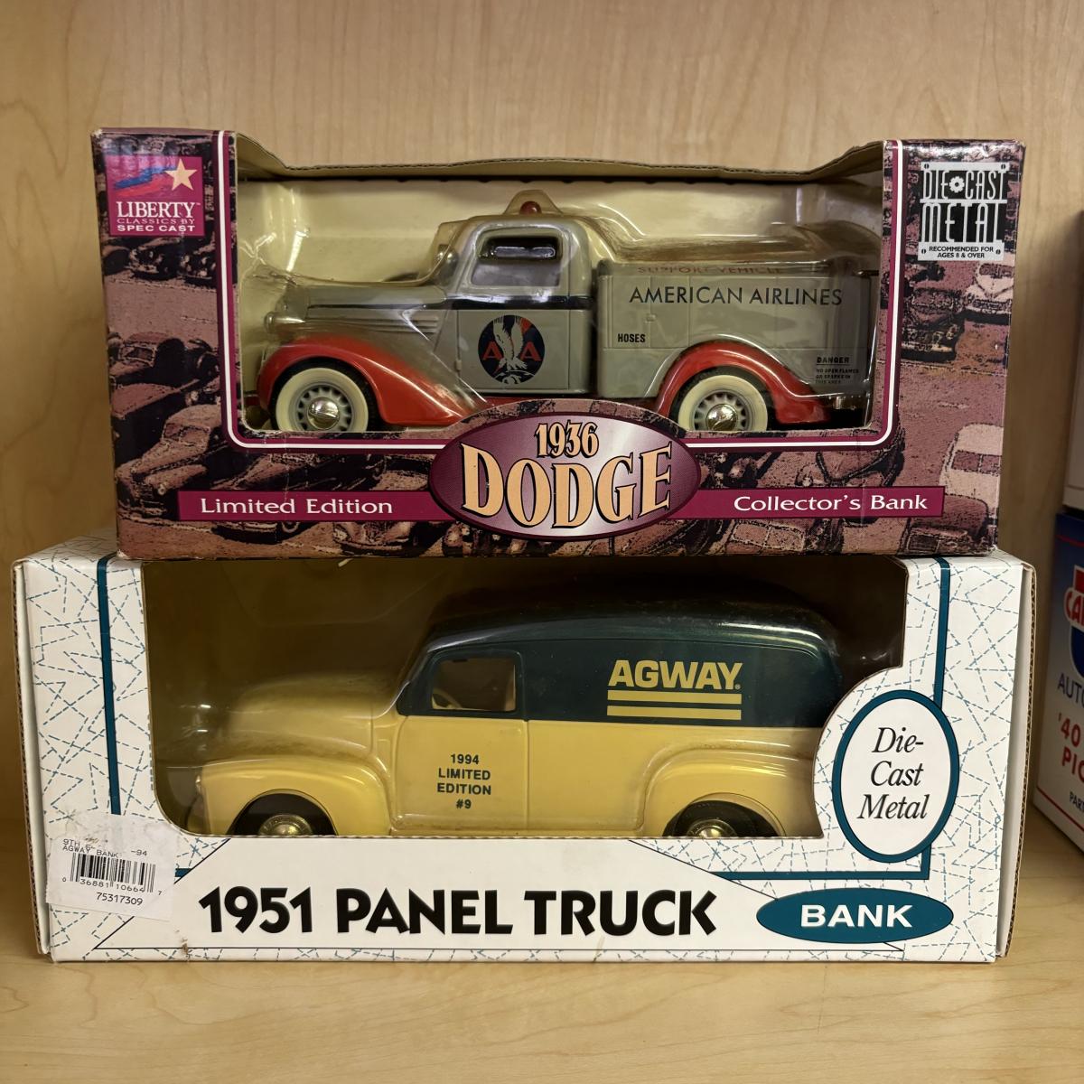 LOT 91: Vintage Model Truck Die Cat Metal Bank Collection: American Airlines, Agway Panel Truck, Car Quest & Others