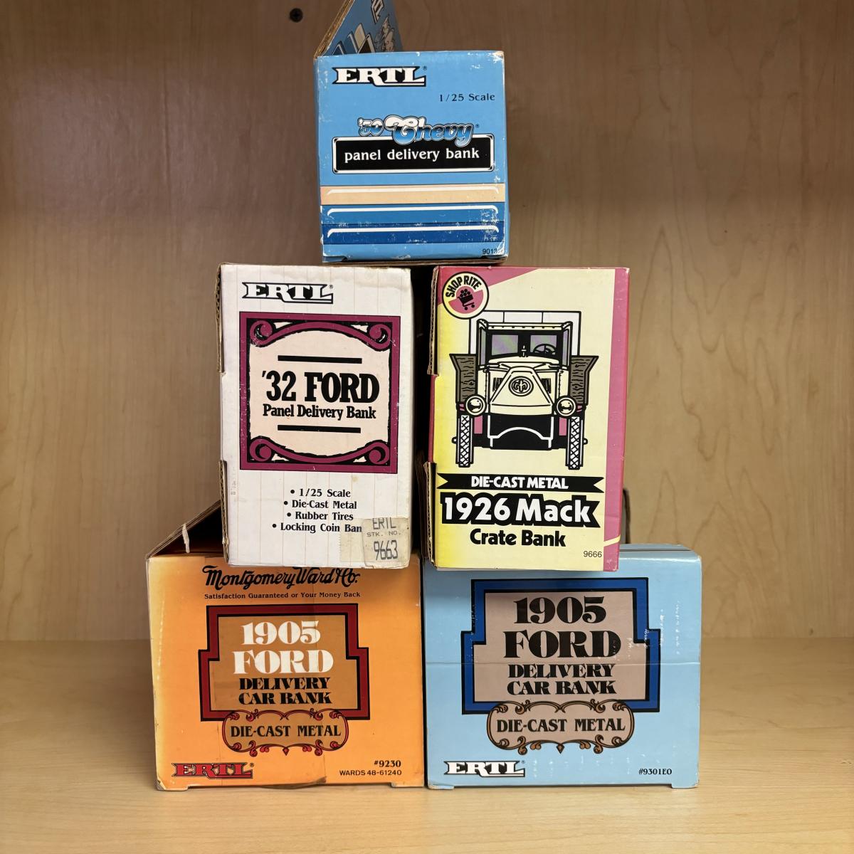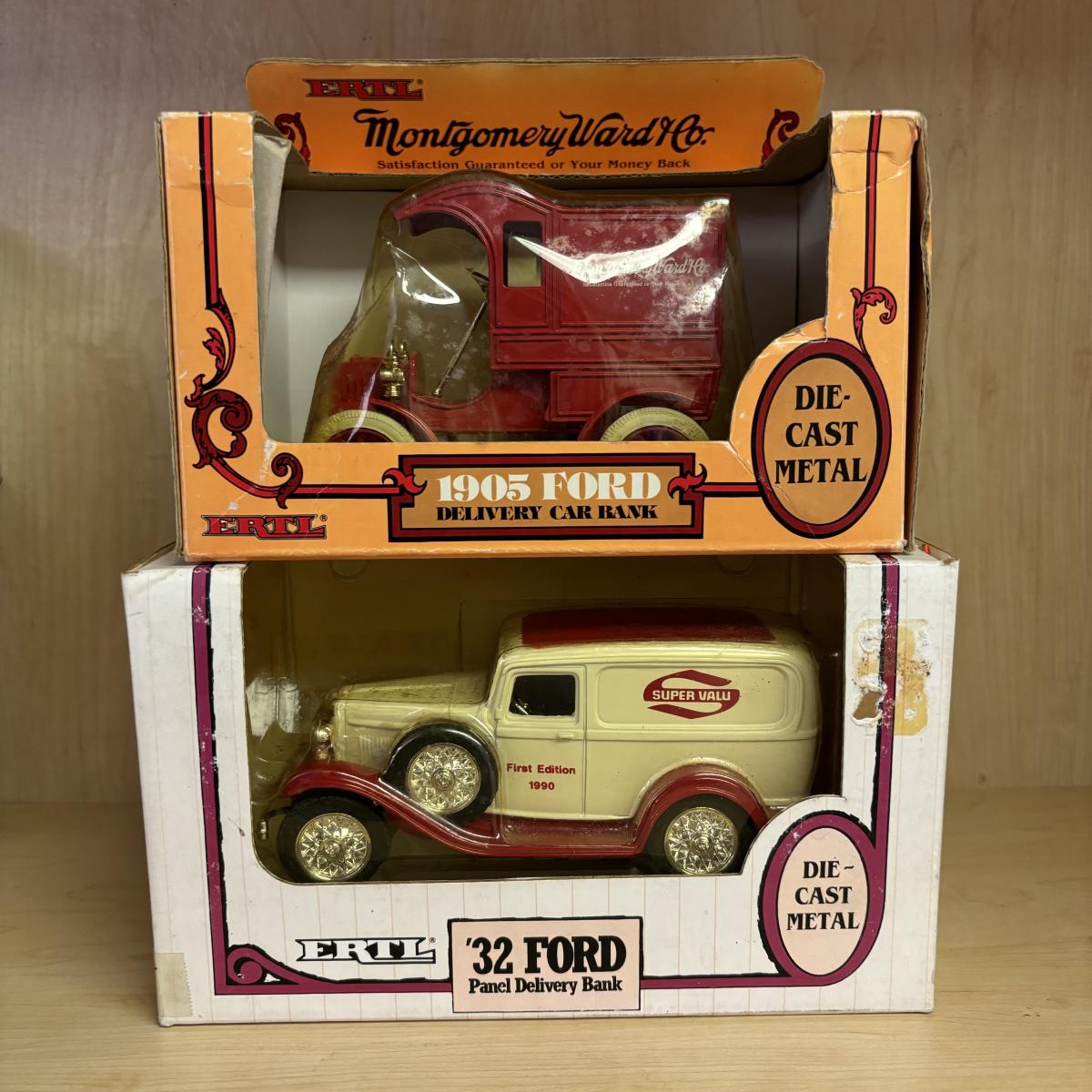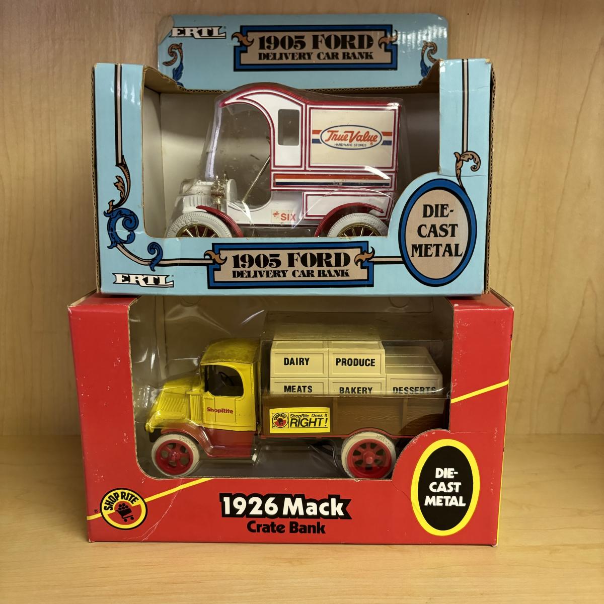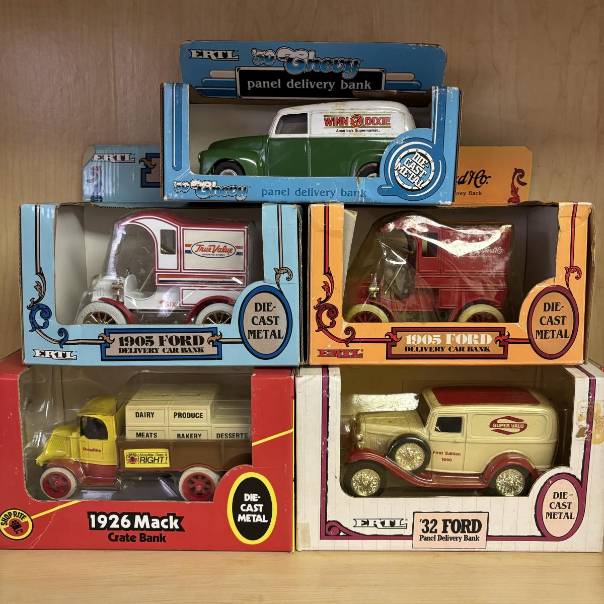 LOT 90: Ertl Collection of Die Cast Banks: Winn Panel Truck, 1905 Ford True Value, 1932 Super Valu Panel Truck, 1905 Montgomery Ward Delivery Car, 1926 Shop Rite Mock Crate Truck