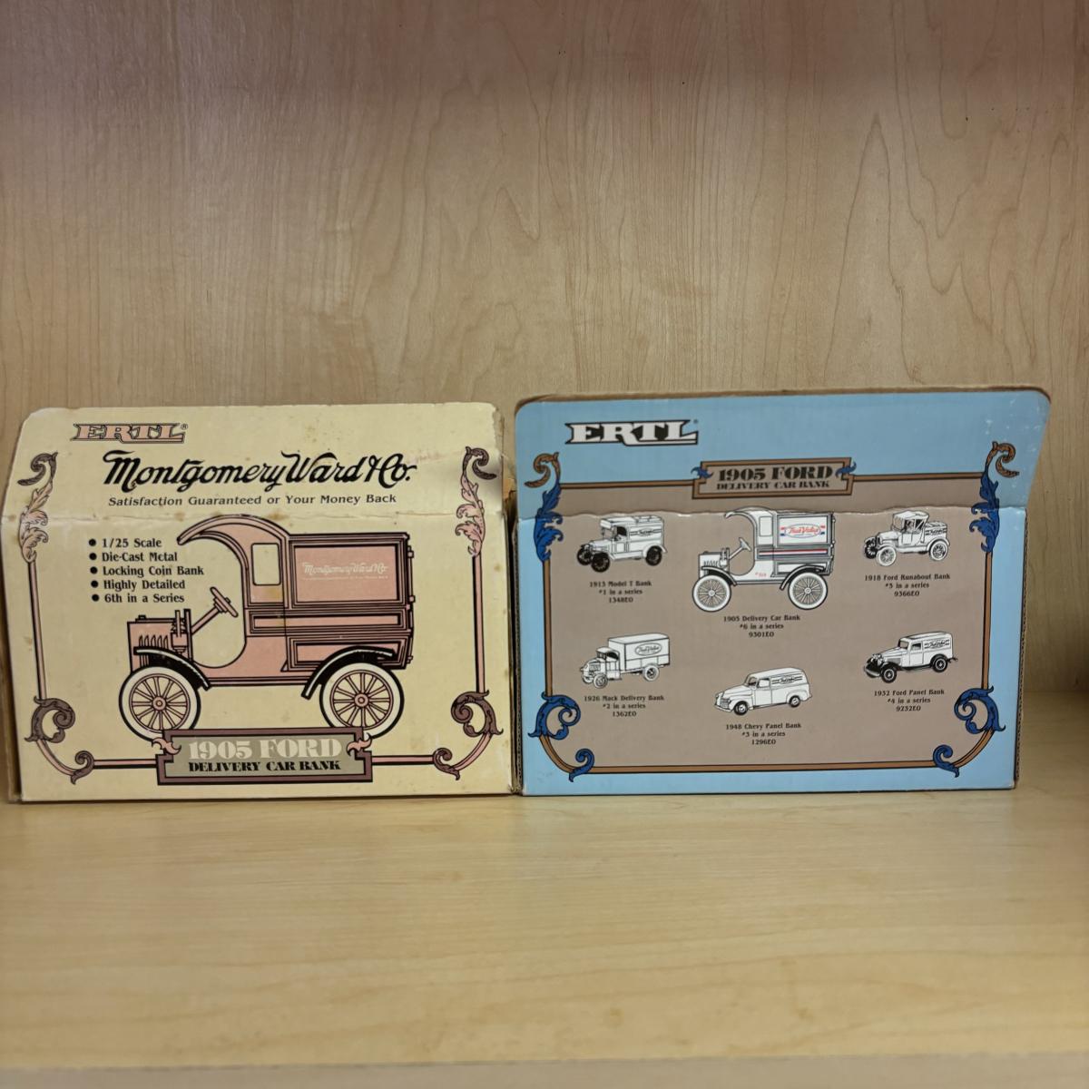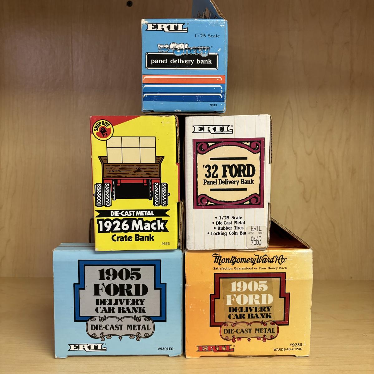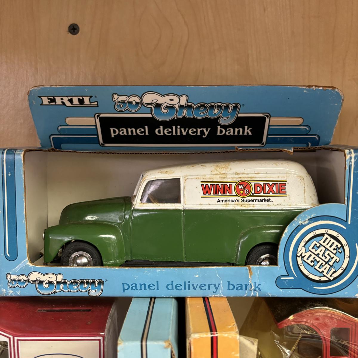 LOT 90: Ertl Collection of Die Cast Banks: Winn Panel Truck, 1905 Ford True Value, 1932 Super Valu Panel Truck, 1905 Montgomery Ward Delivery Car, 1926 Shop Rite Mock Crate Truck