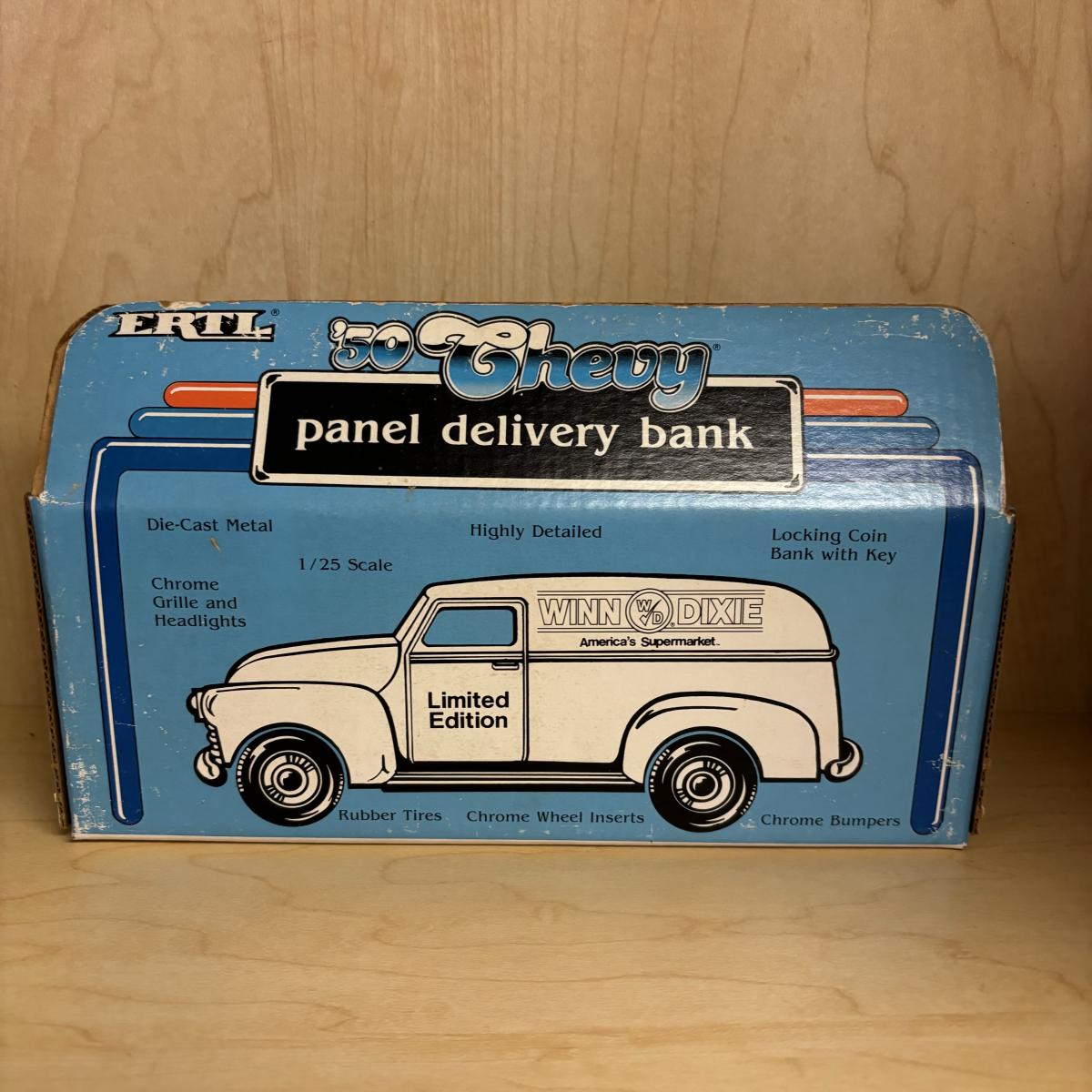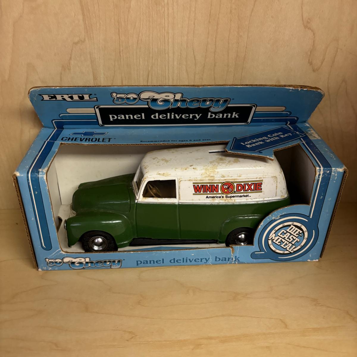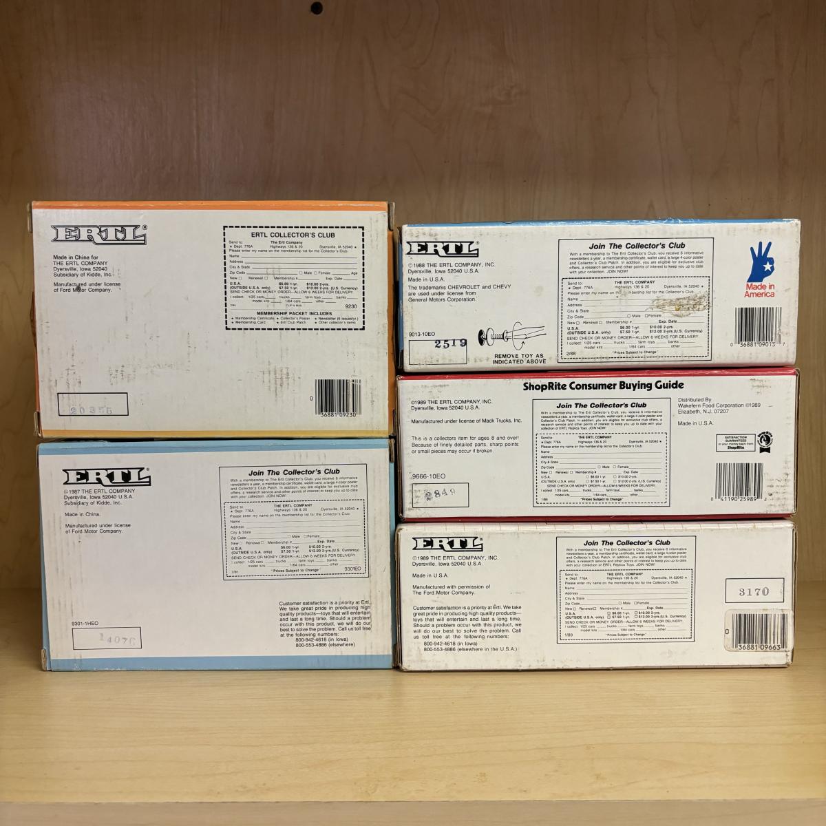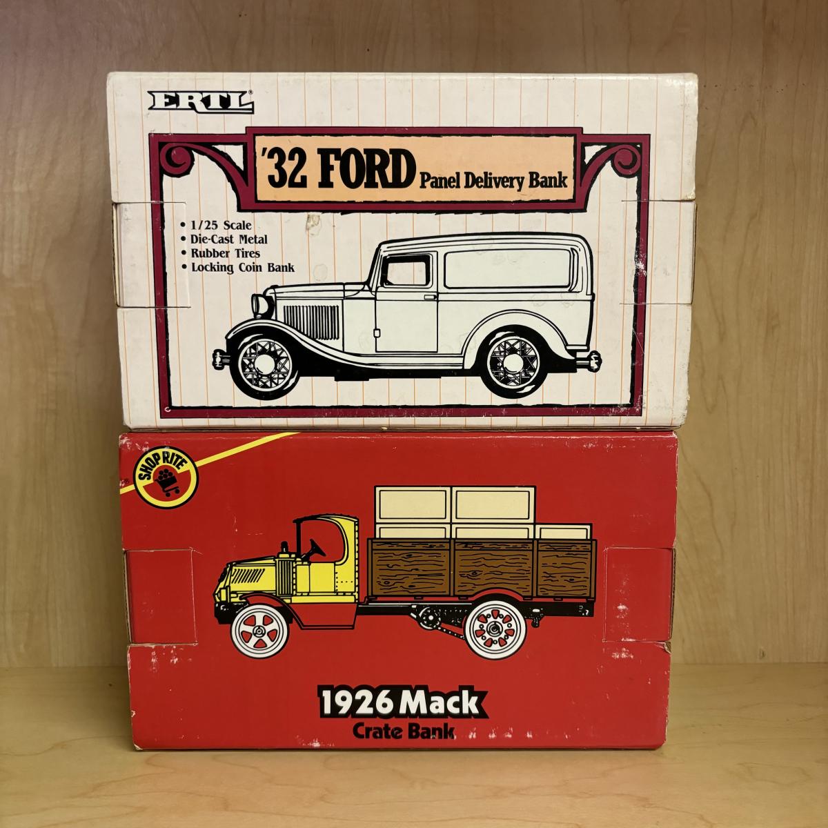 LOT 90: Ertl Collection of Die Cast Banks: Winn Panel Truck, 1905 Ford True Value, 1932 Super Valu Panel Truck, 1905 Montgomery Ward Delivery Car, 1926 Shop Rite Mock Crate Truck