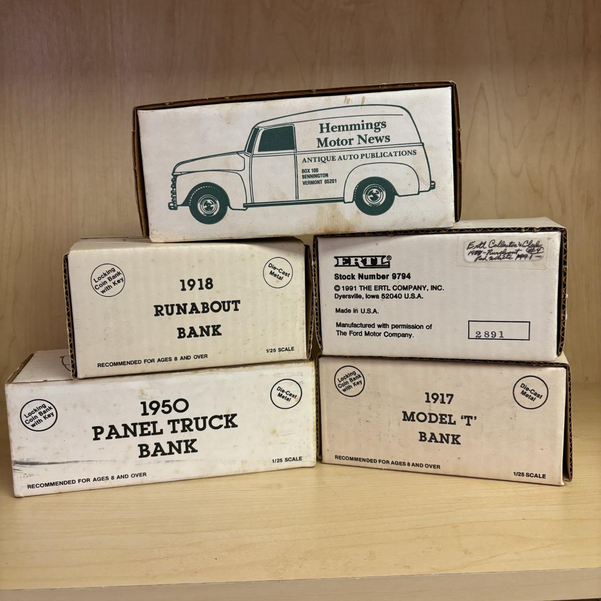 LOT 112: Ertl New/Old Stock Die Cast Metal Banks #8430, #9794, #9461, #2953 & #F042