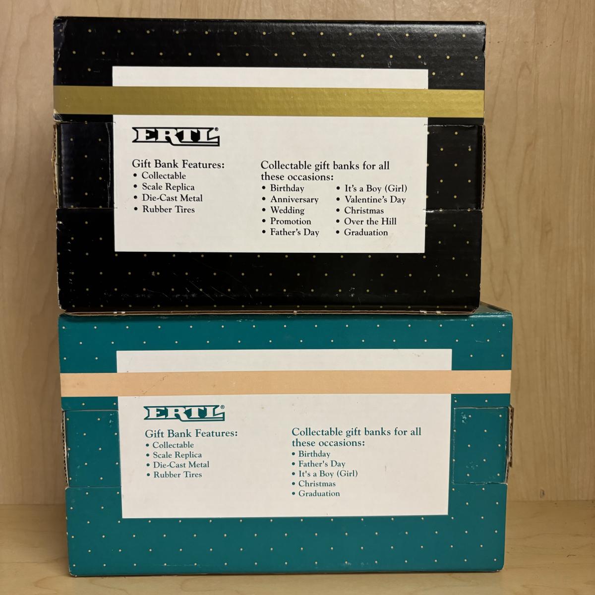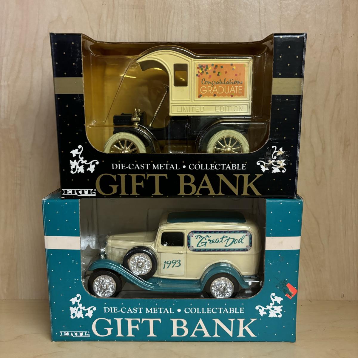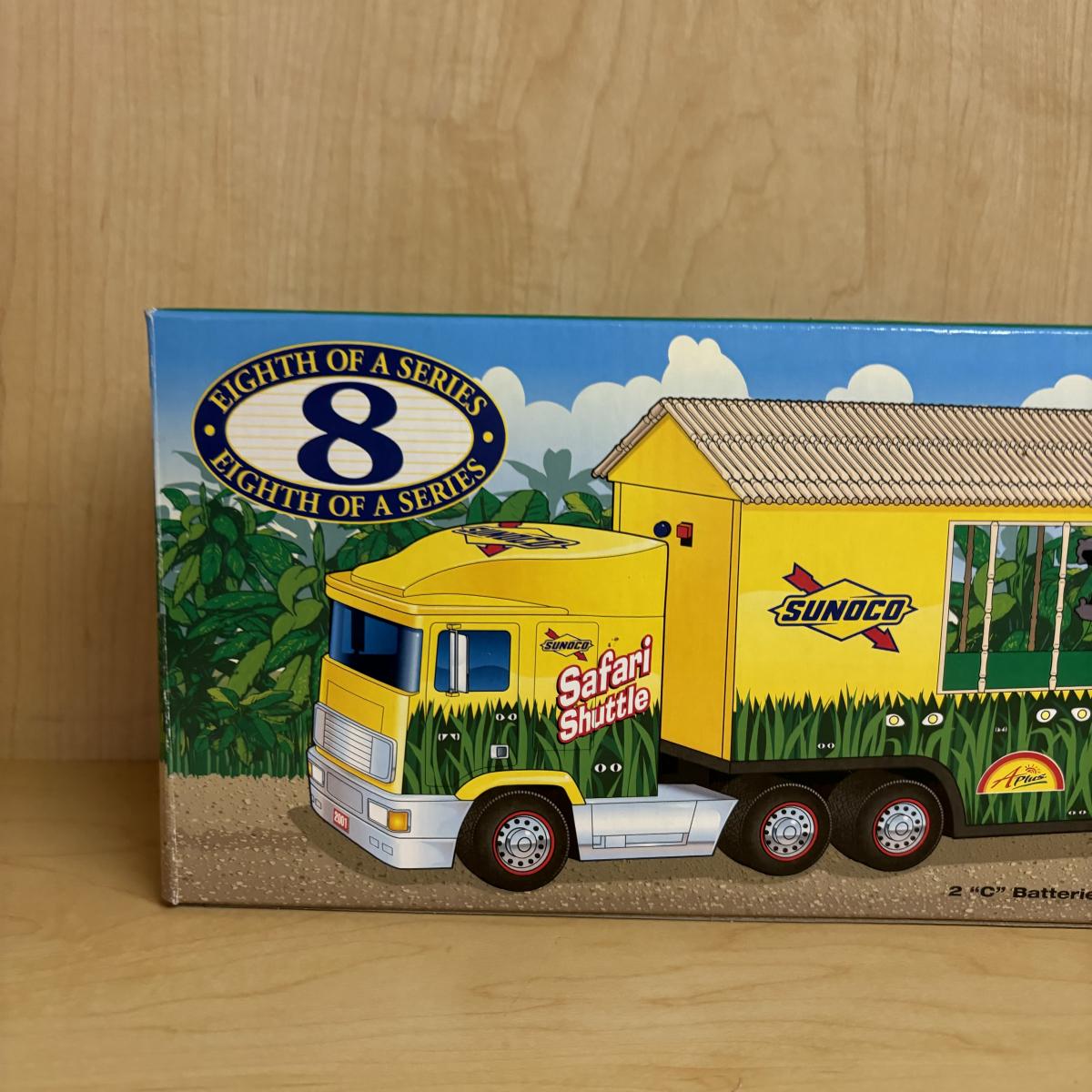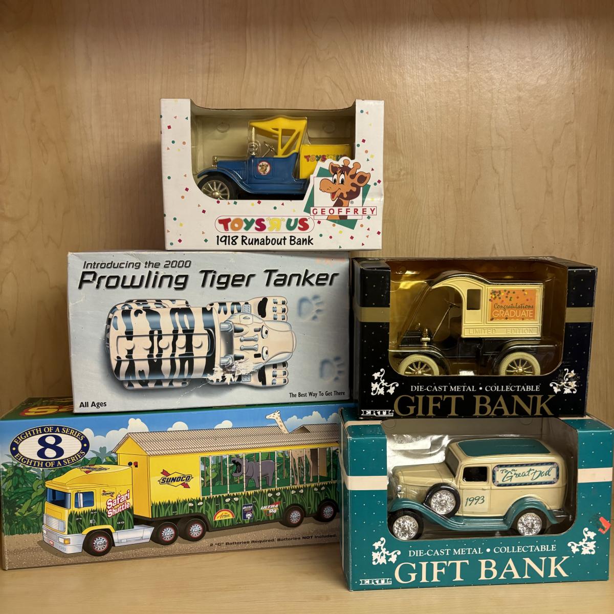 LOT 186: Ertl Gift Banks: Ertl Toy R Us Bank, Sunoco Safari Shuttle Truck & Exxon Prowling Tiger Tanker