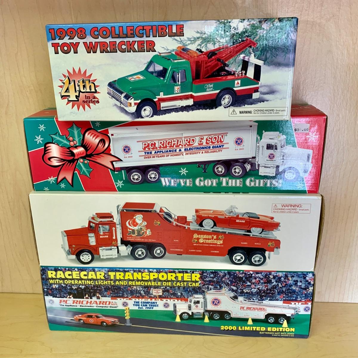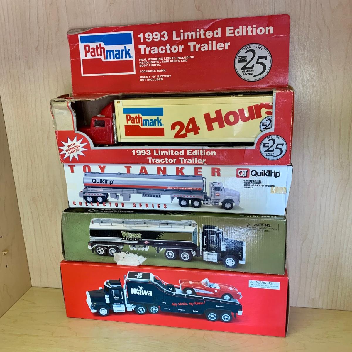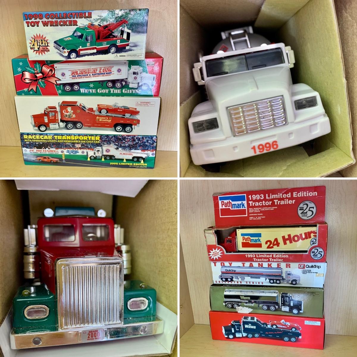 LOT 191: 1998 7/11 Collectible Toy Wrecker, 1993 Pathmark Limited Edition Tractor Trailer Lockable Bank, P.C. Richard & Sons, Sears, QuikTrip, Wawa, & More