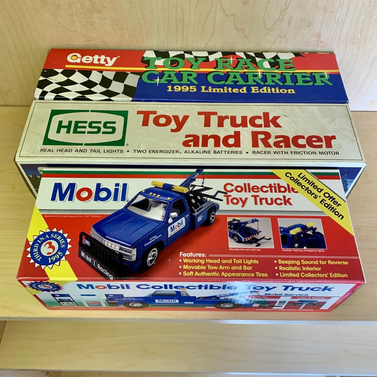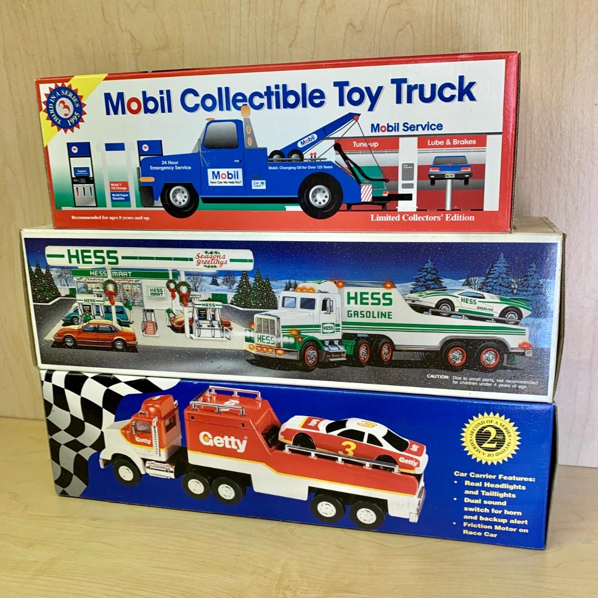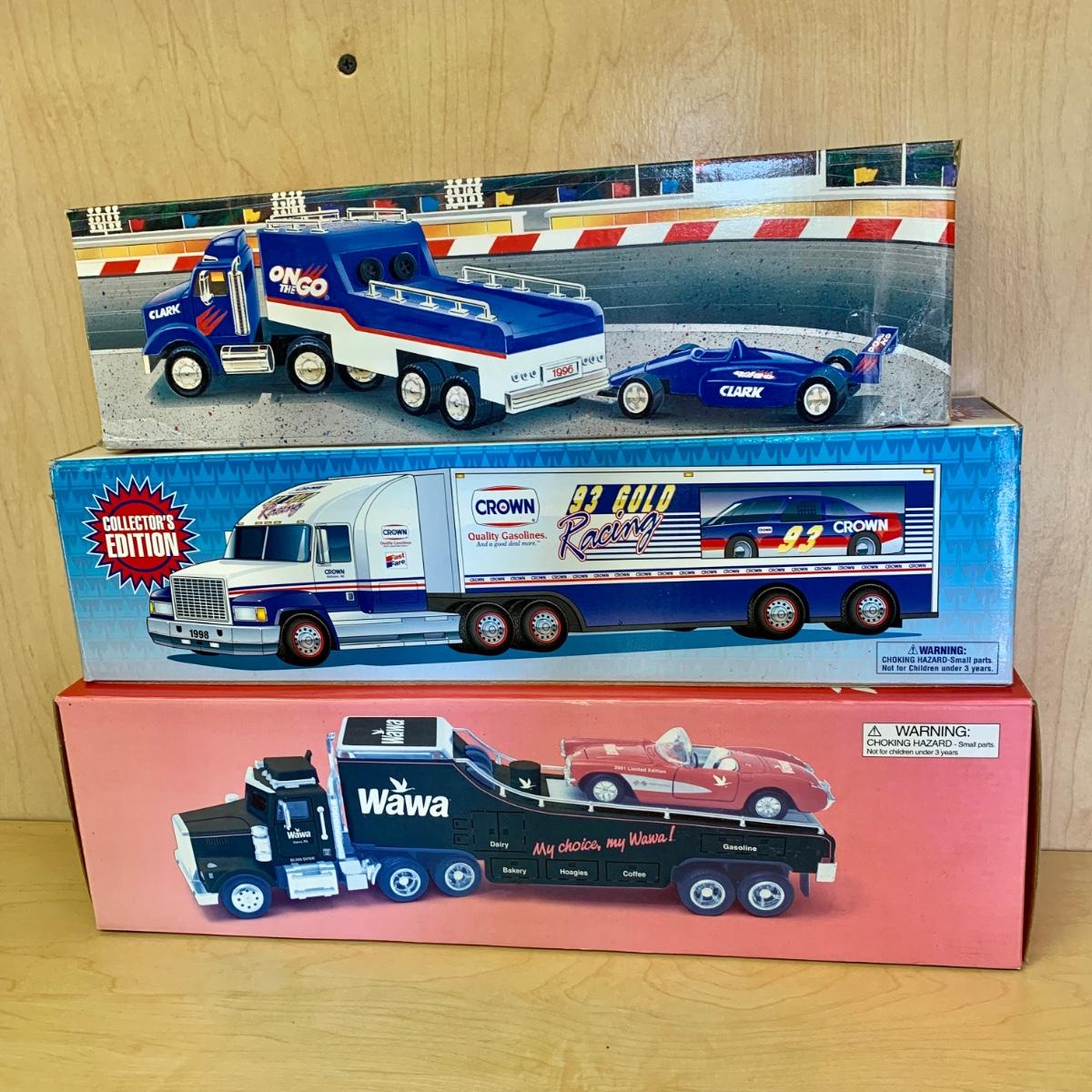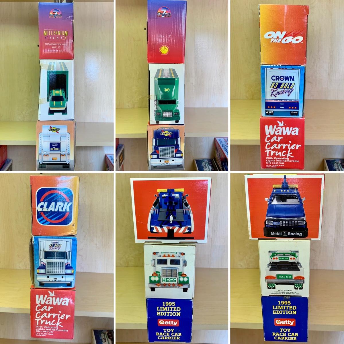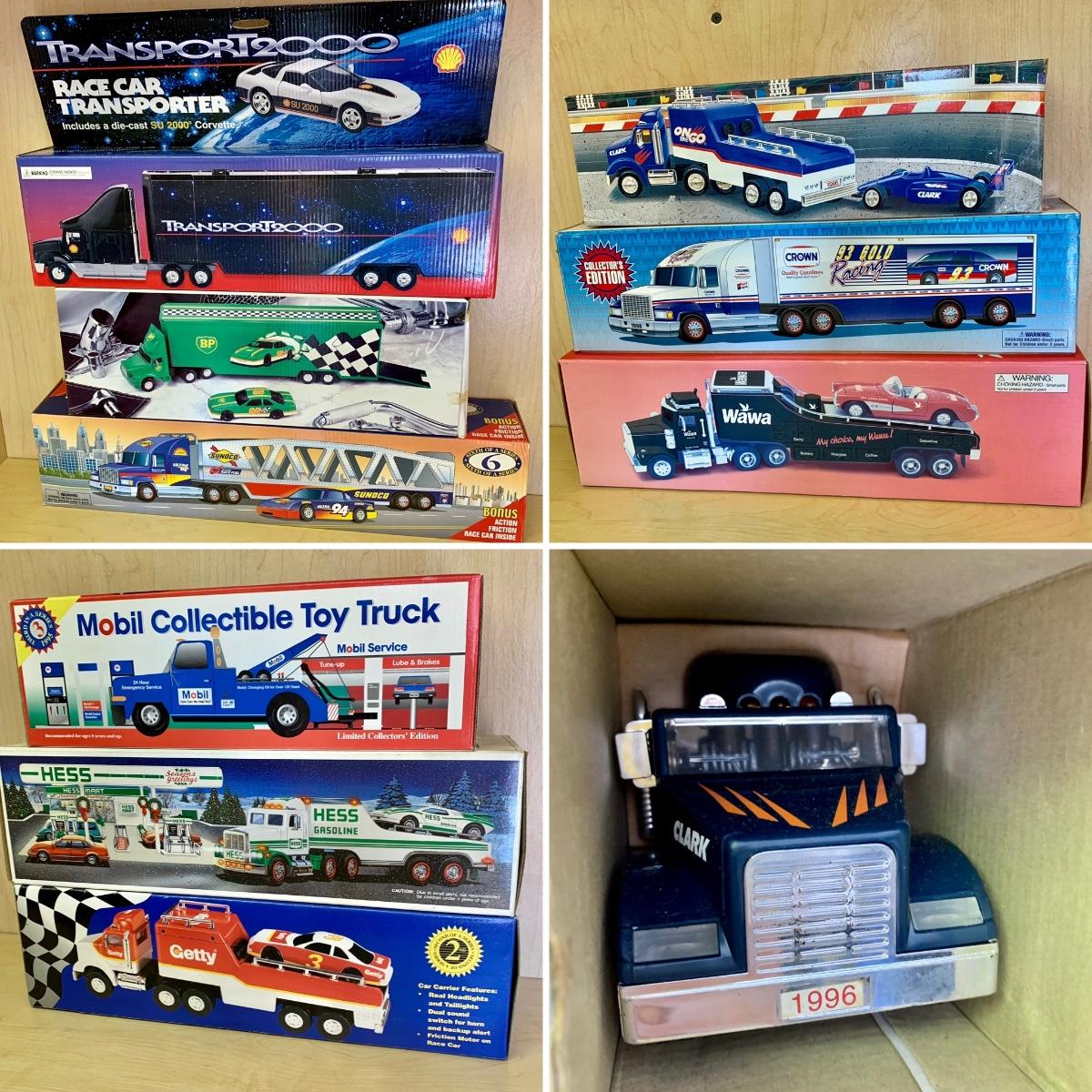 LOT 195: 3rd in Series 1995 Mobil Collectible Toy Truck, 2nd in Series 2001 Wawa Car Carrier Truck w/ Die-Cast Car, Shell, BP, Sunoco, Clark, Crown, Hess, Getty, & More