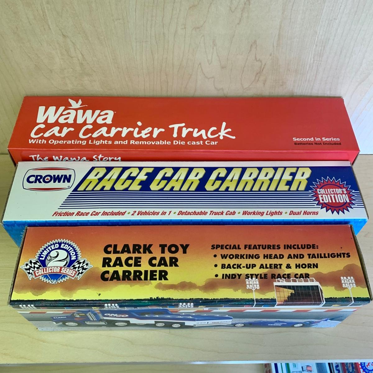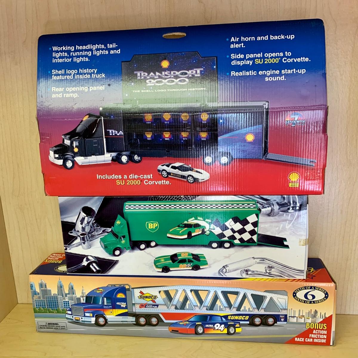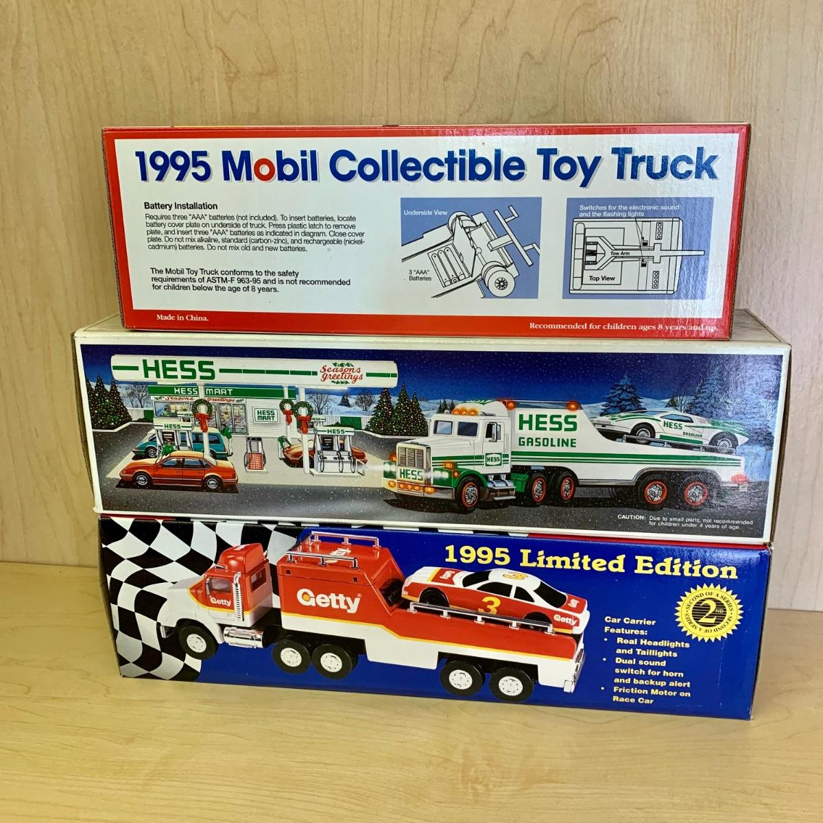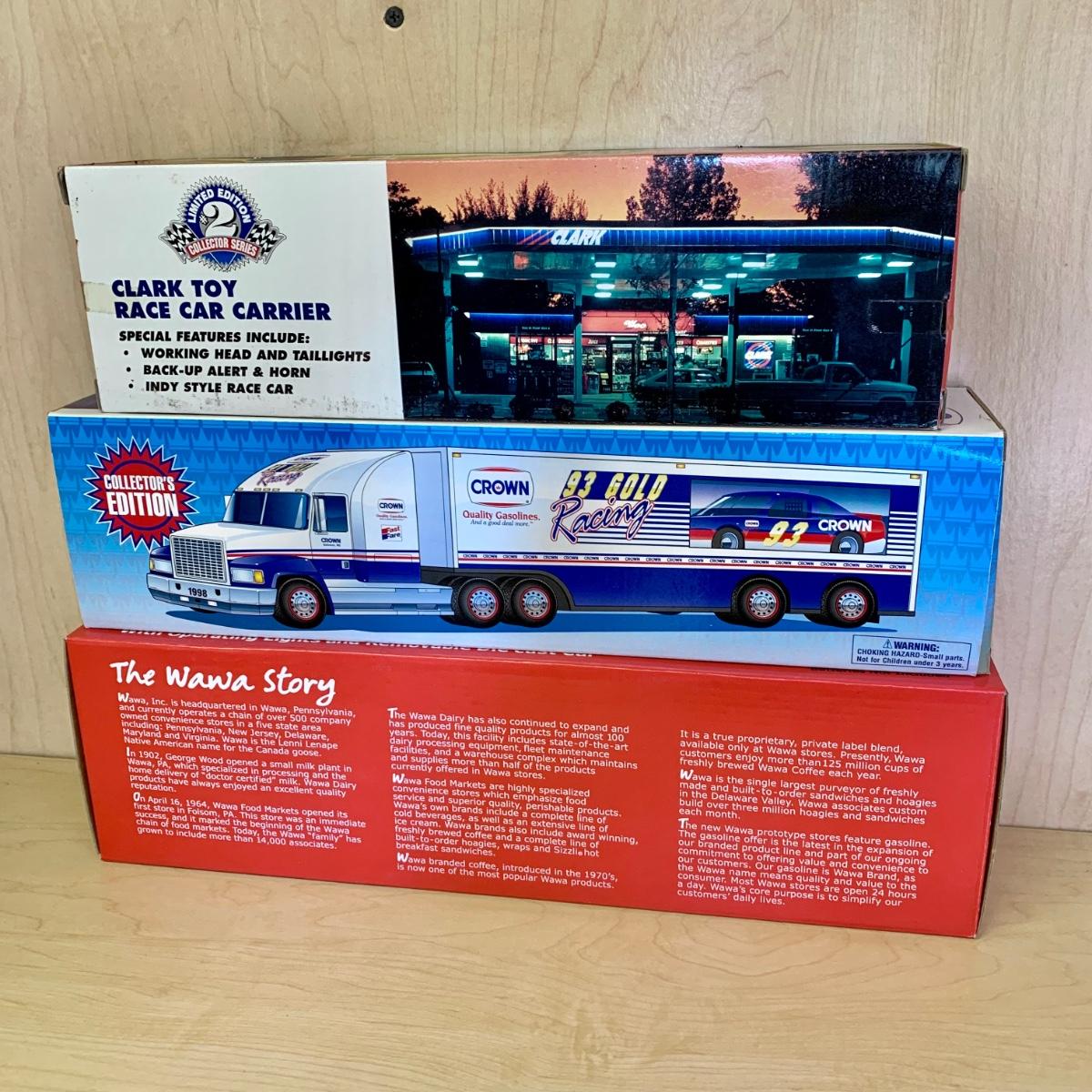 LOT 195: 3rd in Series 1995 Mobil Collectible Toy Truck, 2nd in Series 2001 Wawa Car Carrier Truck w/ Die-Cast Car, Shell, BP, Sunoco, Clark, Crown, Hess, Getty, & More
