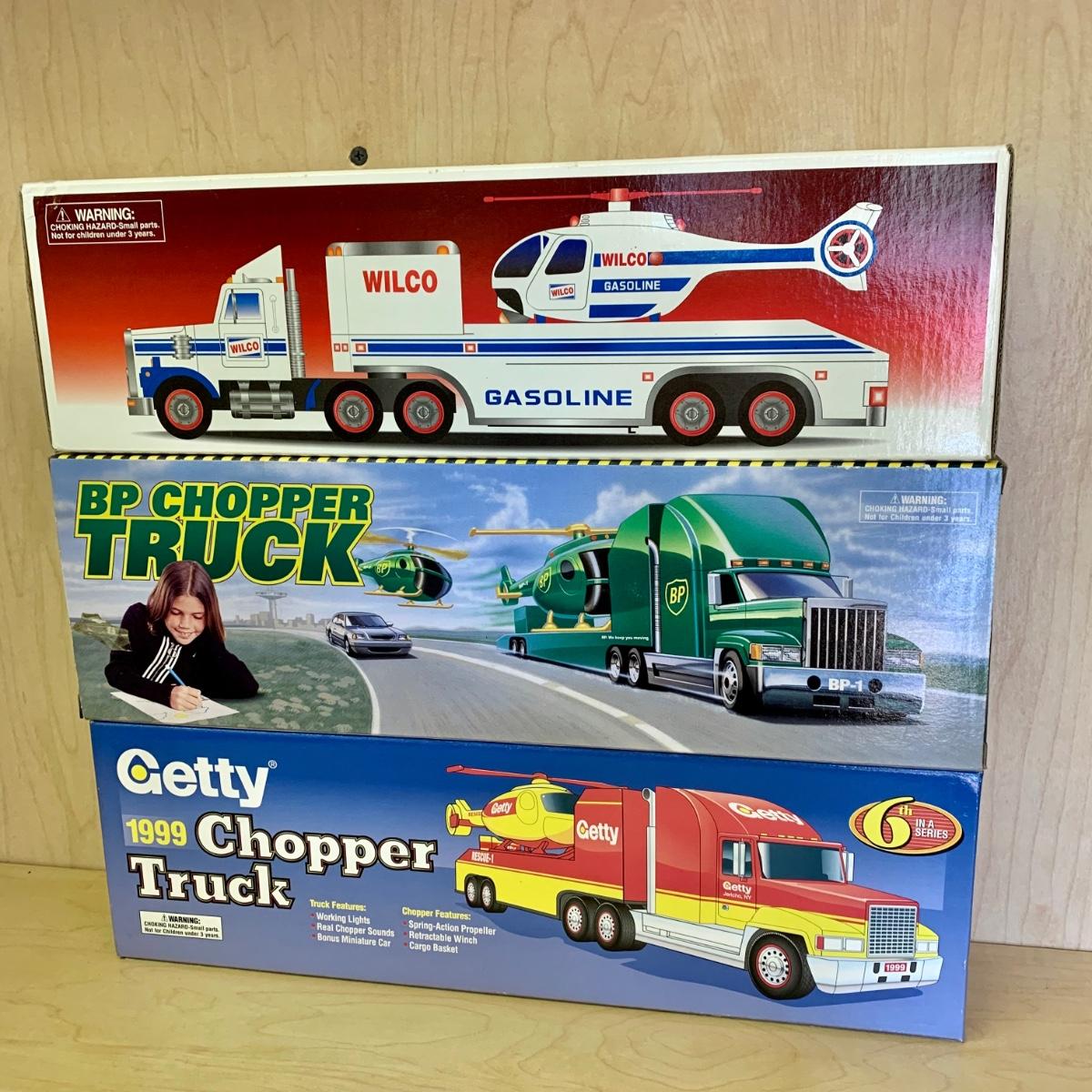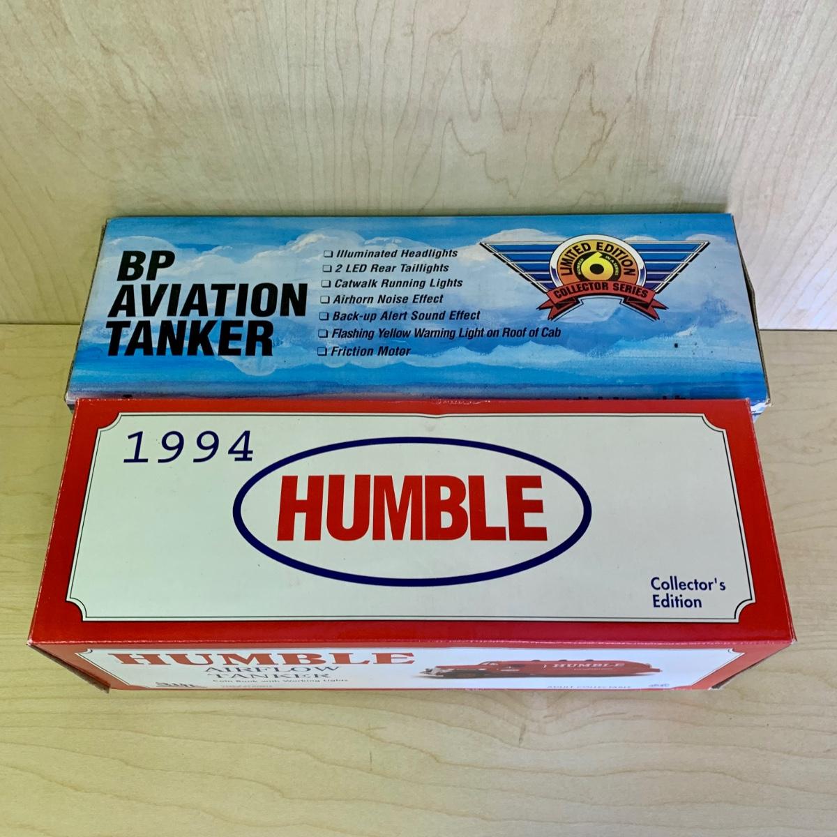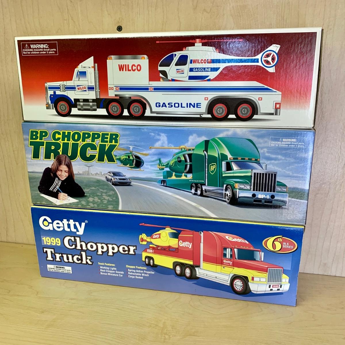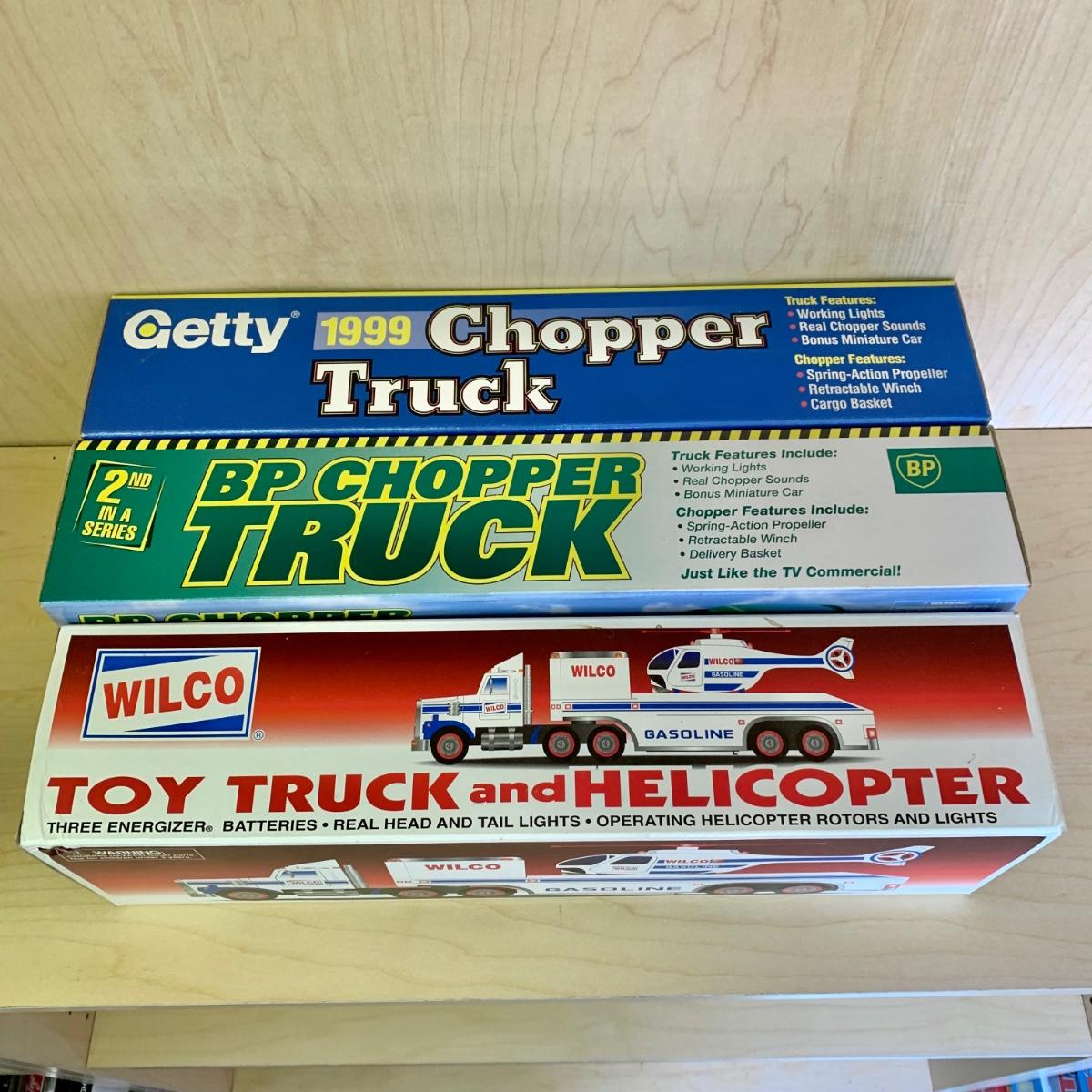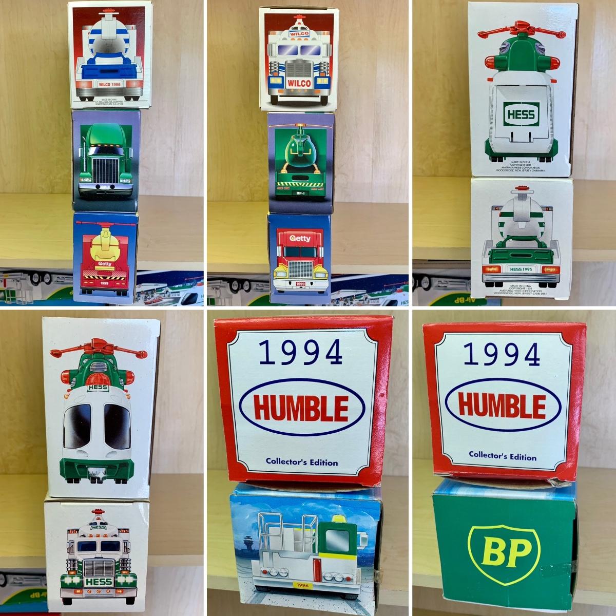 LOT 198: 6 in Series Air BP Aviation Tanker, 2001 Hess Helicopter With Motorcycle And Cruiser, Wilco, Getty, Humble, & More