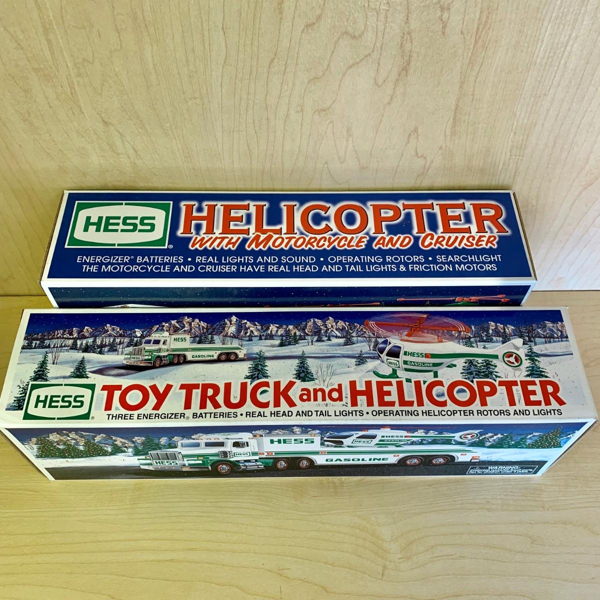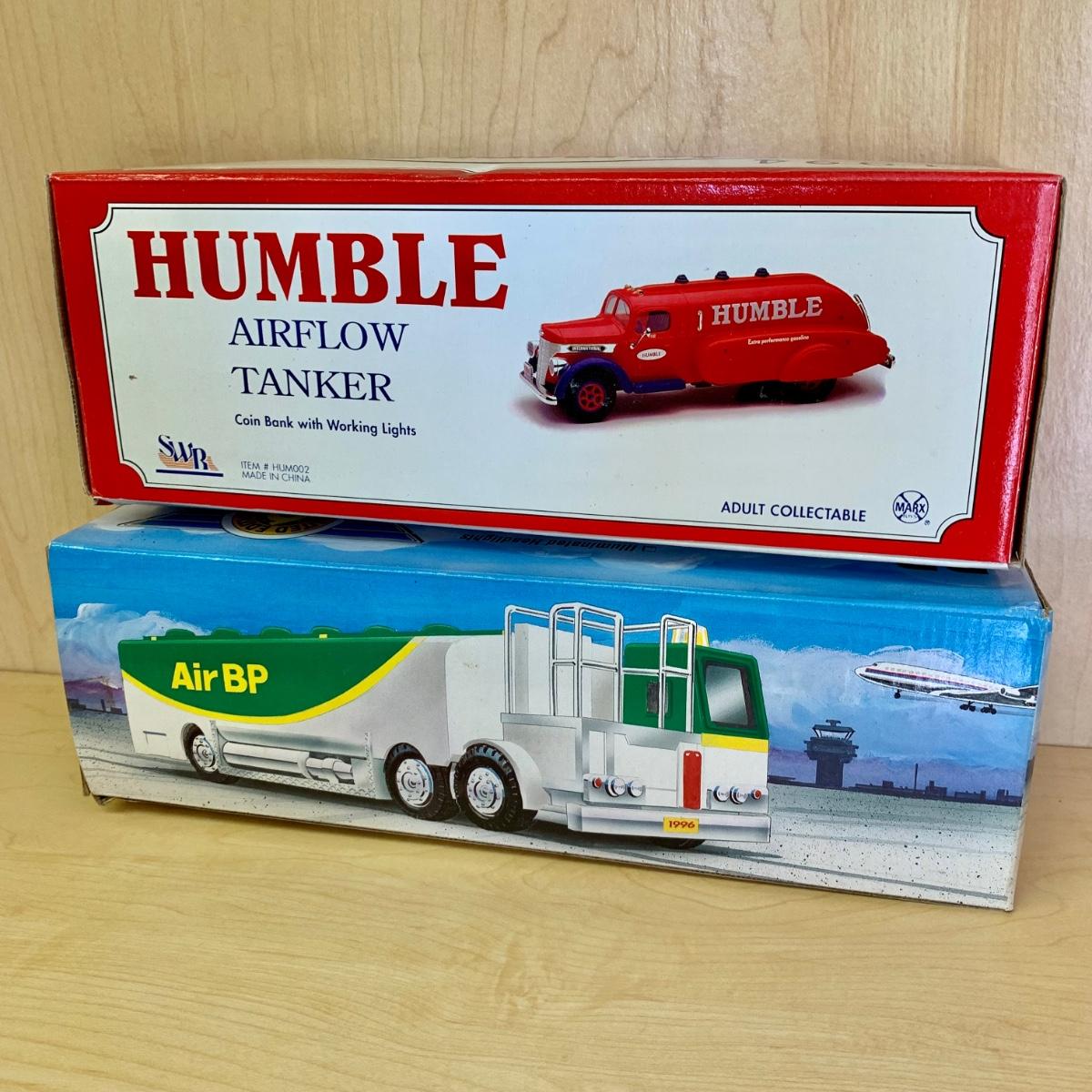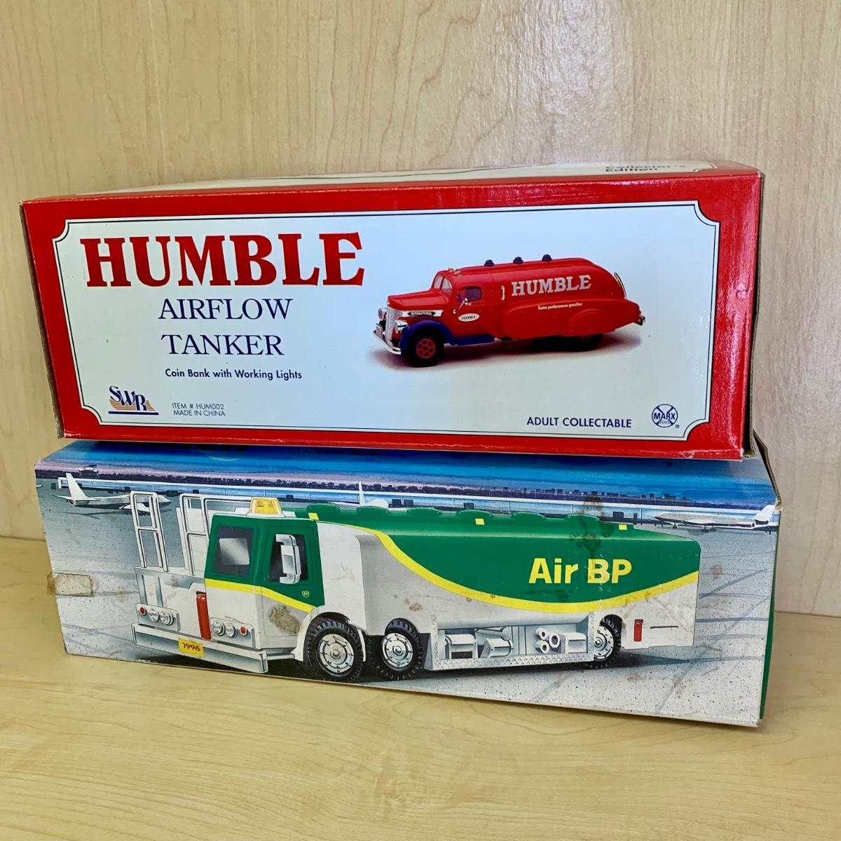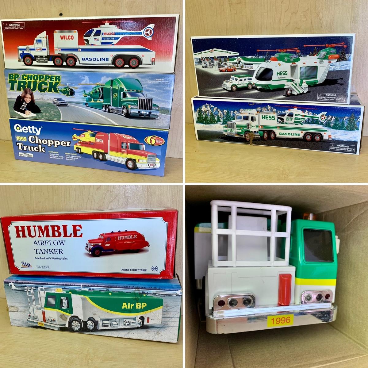 LOT 198: 6 in Series Air BP Aviation Tanker, 2001 Hess Helicopter With Motorcycle And Cruiser, Wilco, Getty, Humble, & More