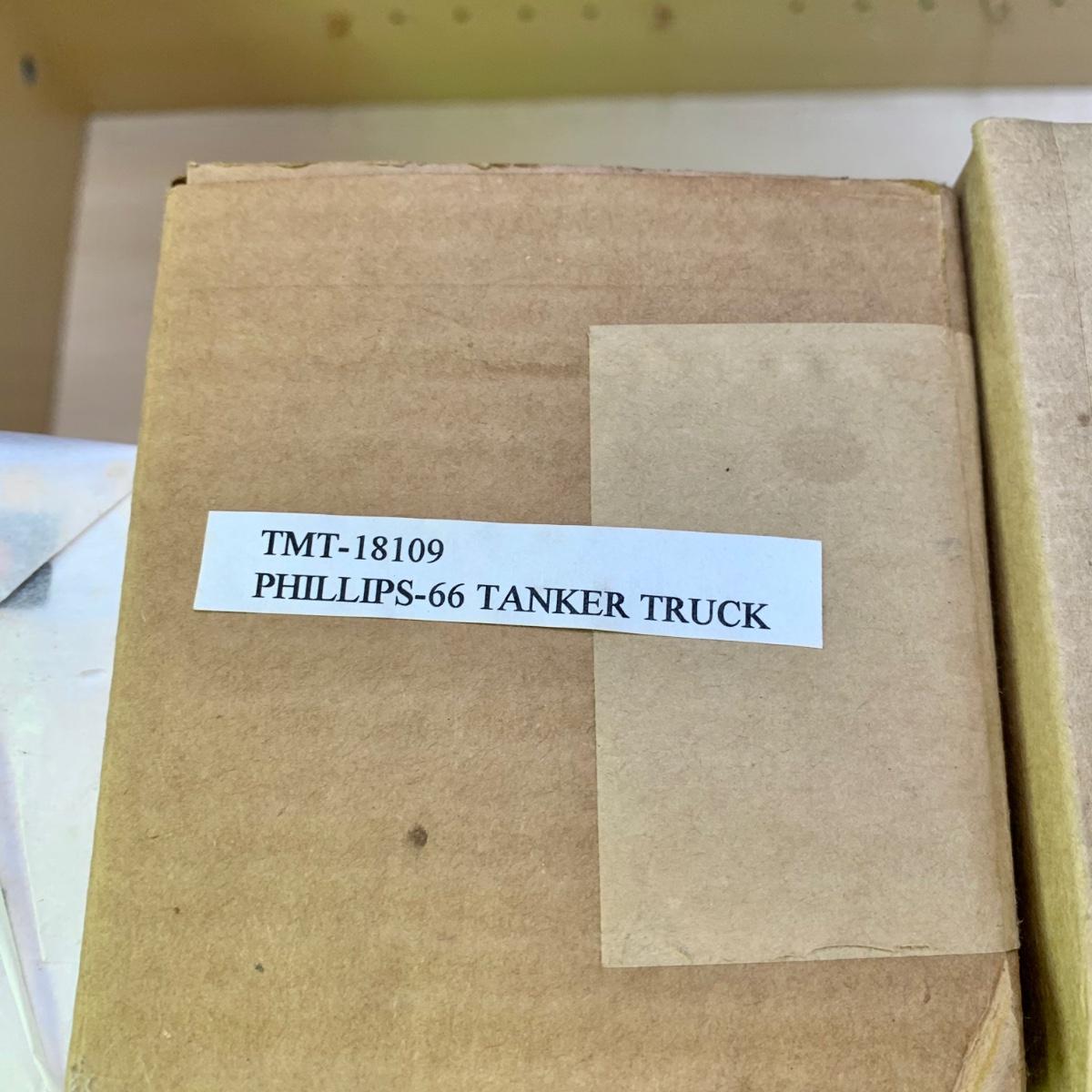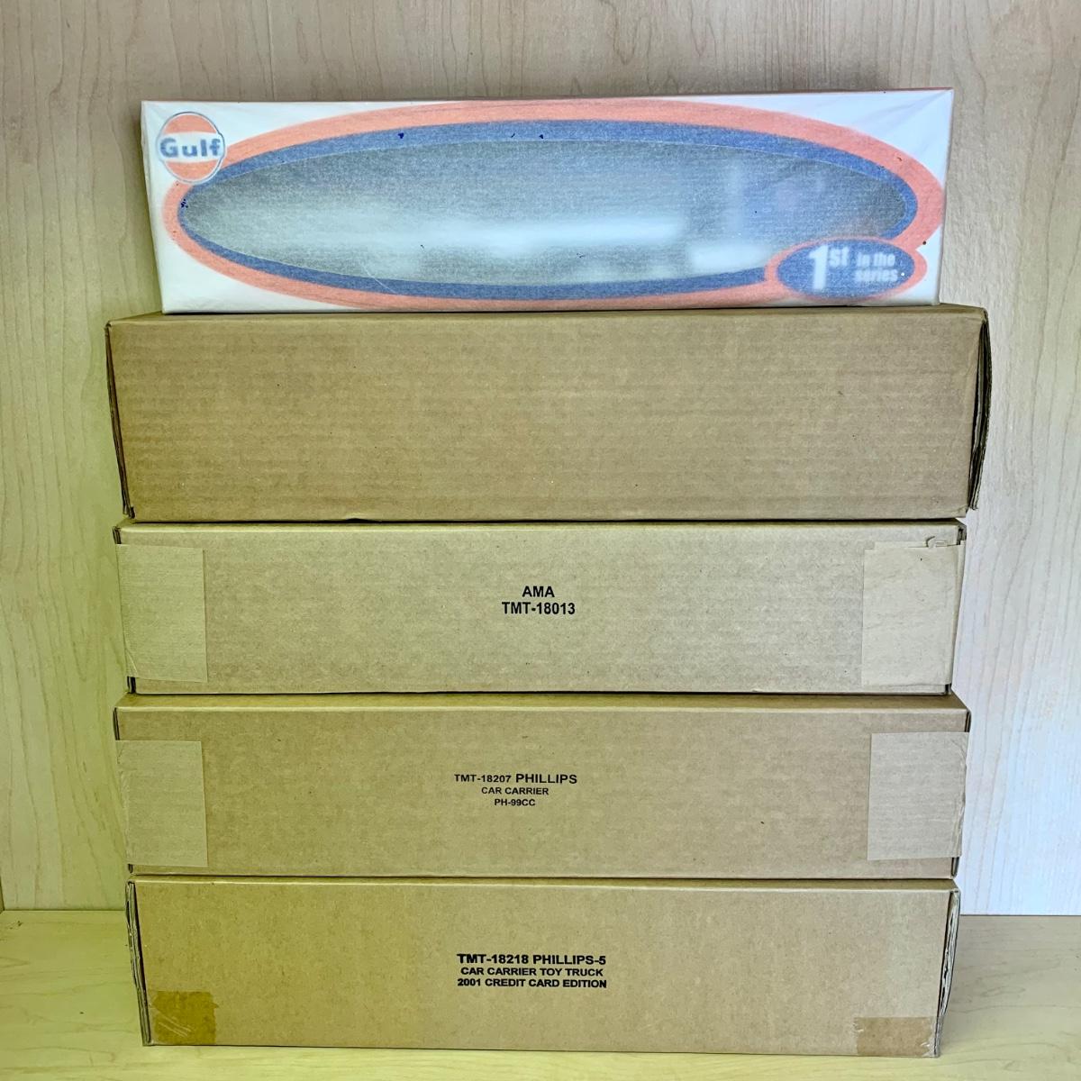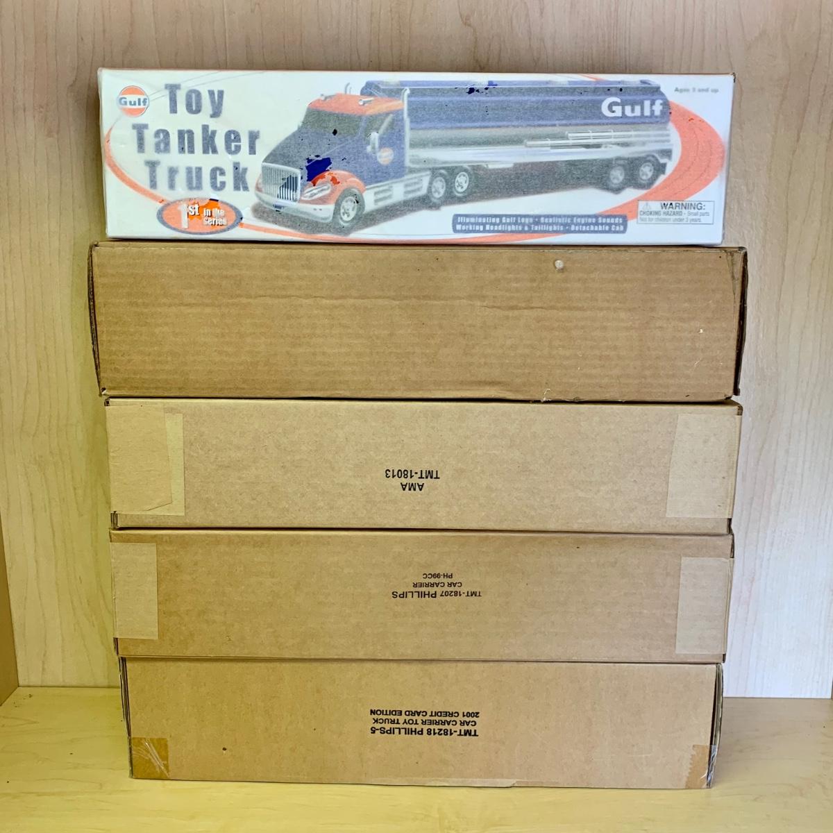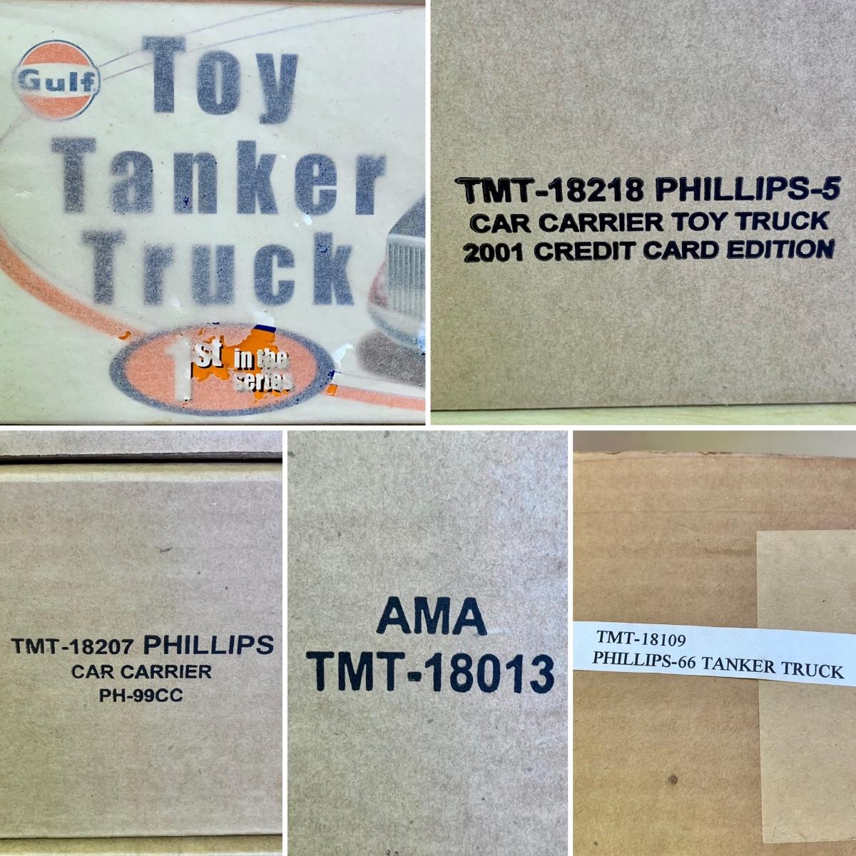 LOT 205: NIP 1st in Series 2004 Gulf Toy Tanker Truck, Taylor Made Trucks AMA 75th Motorcycle Heritage Express Truck, 1999 Phillips '66' Car Carrier Truck & Pickup Truck