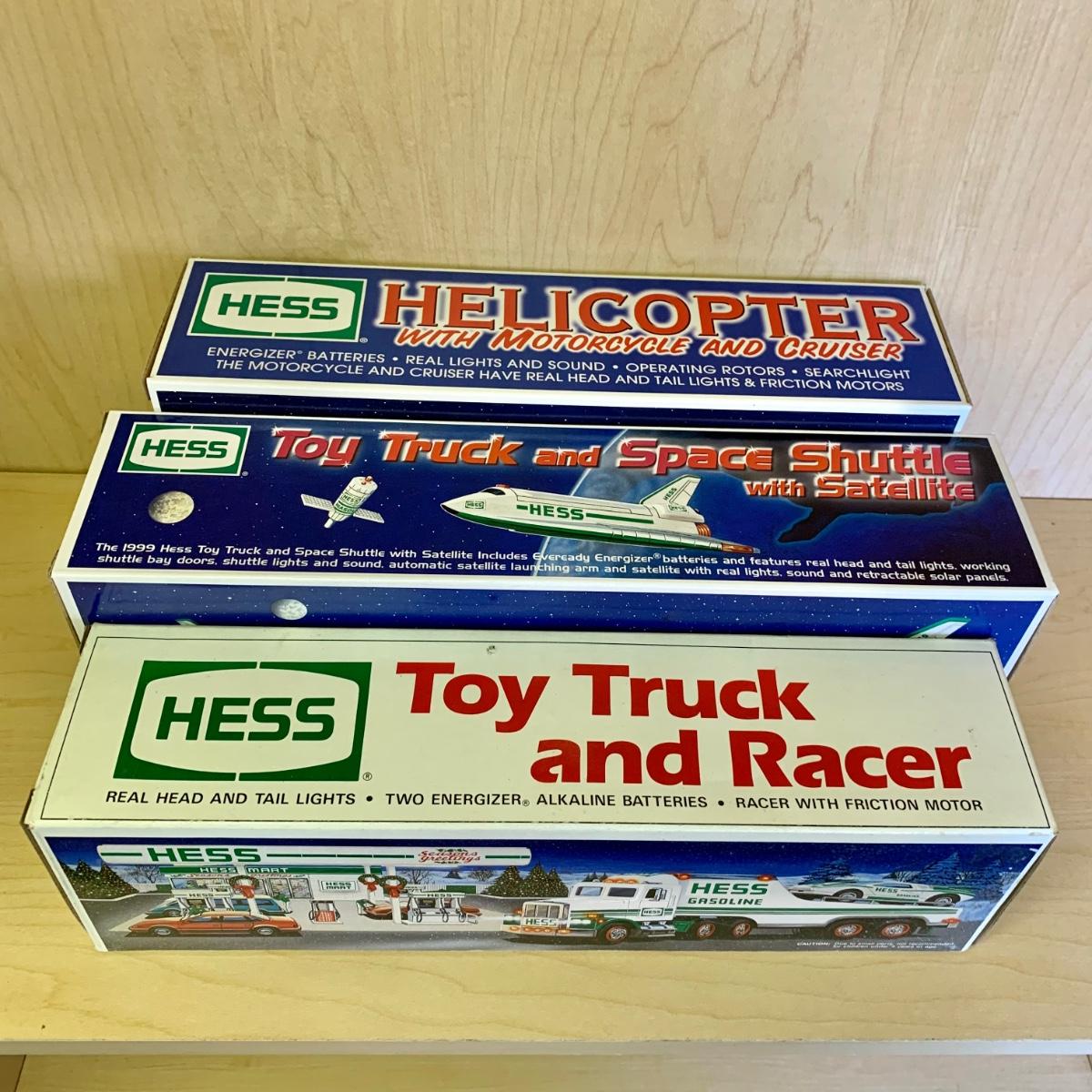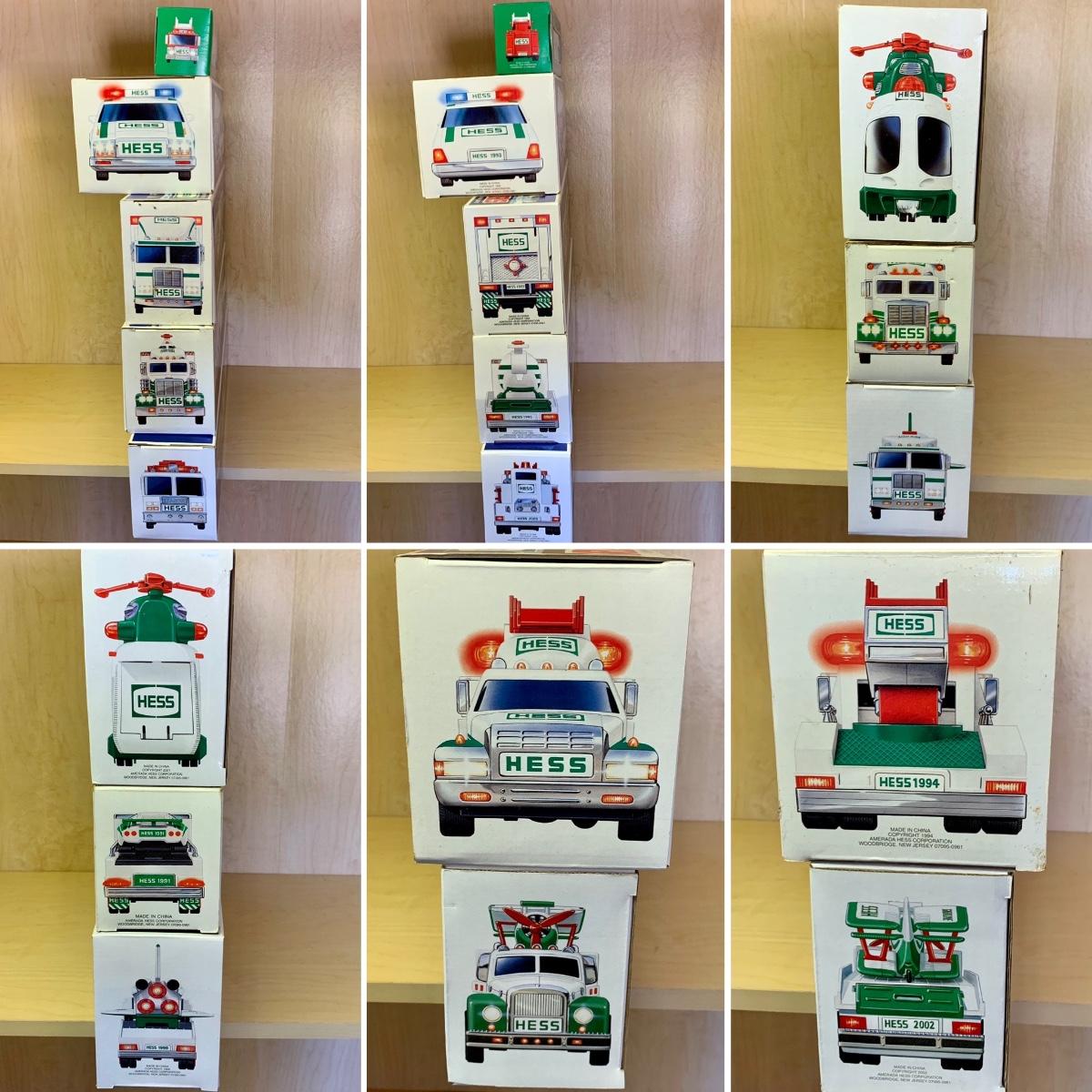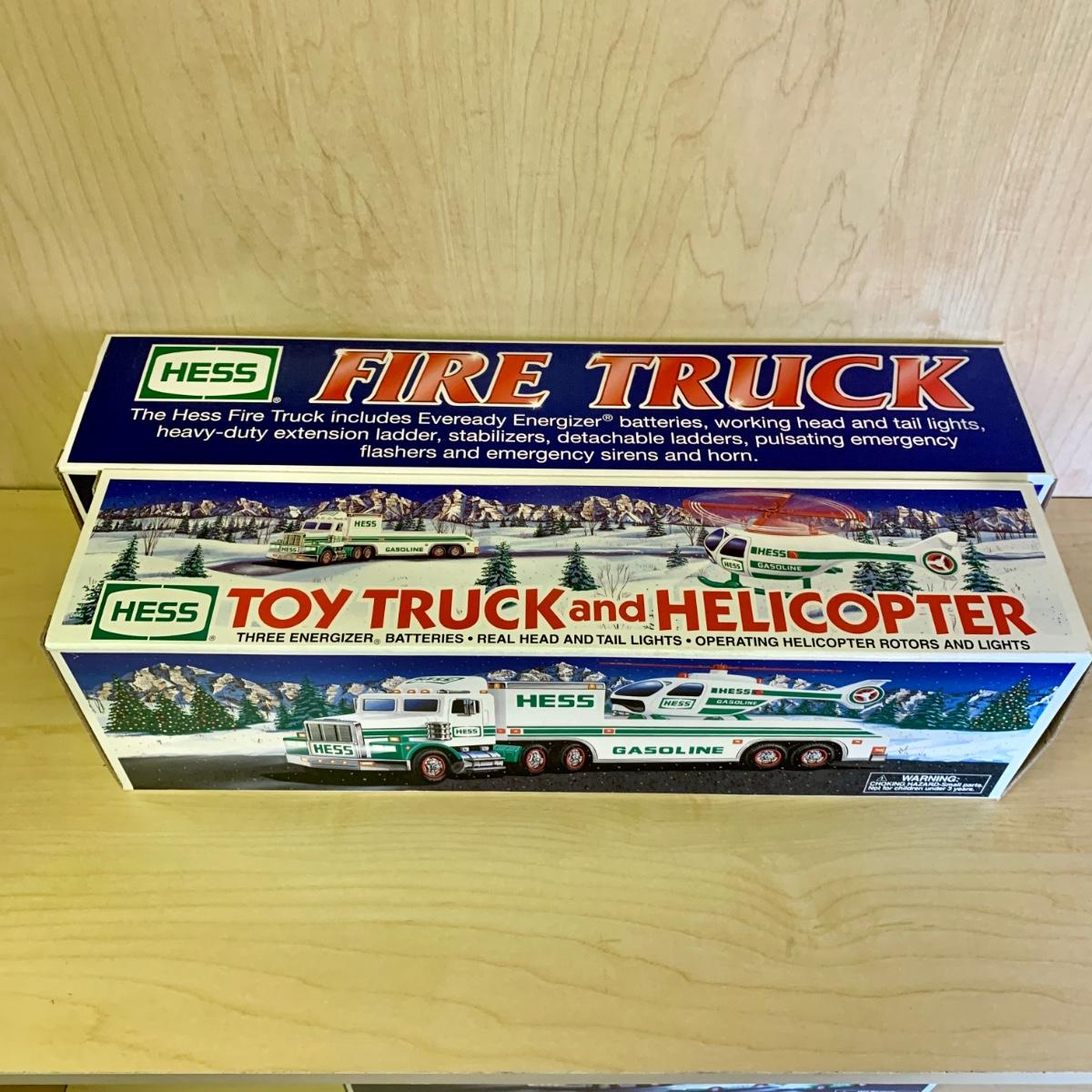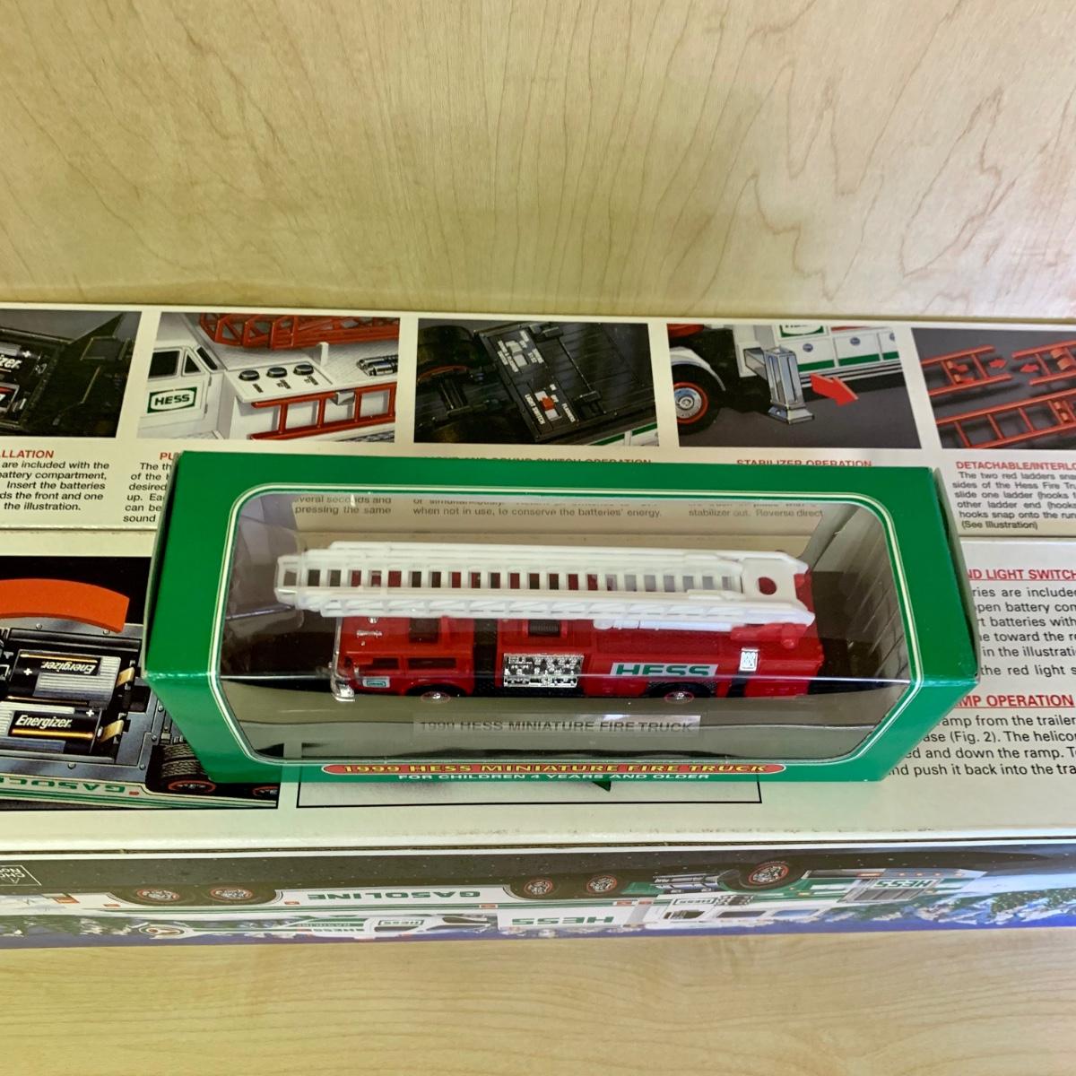 LOT 210: Hess Toy Truck Collection: 1999 Mini Fire Truck, Toy Truck And Helicopter, Toy Truck And Racers, Patrol Car, & More
