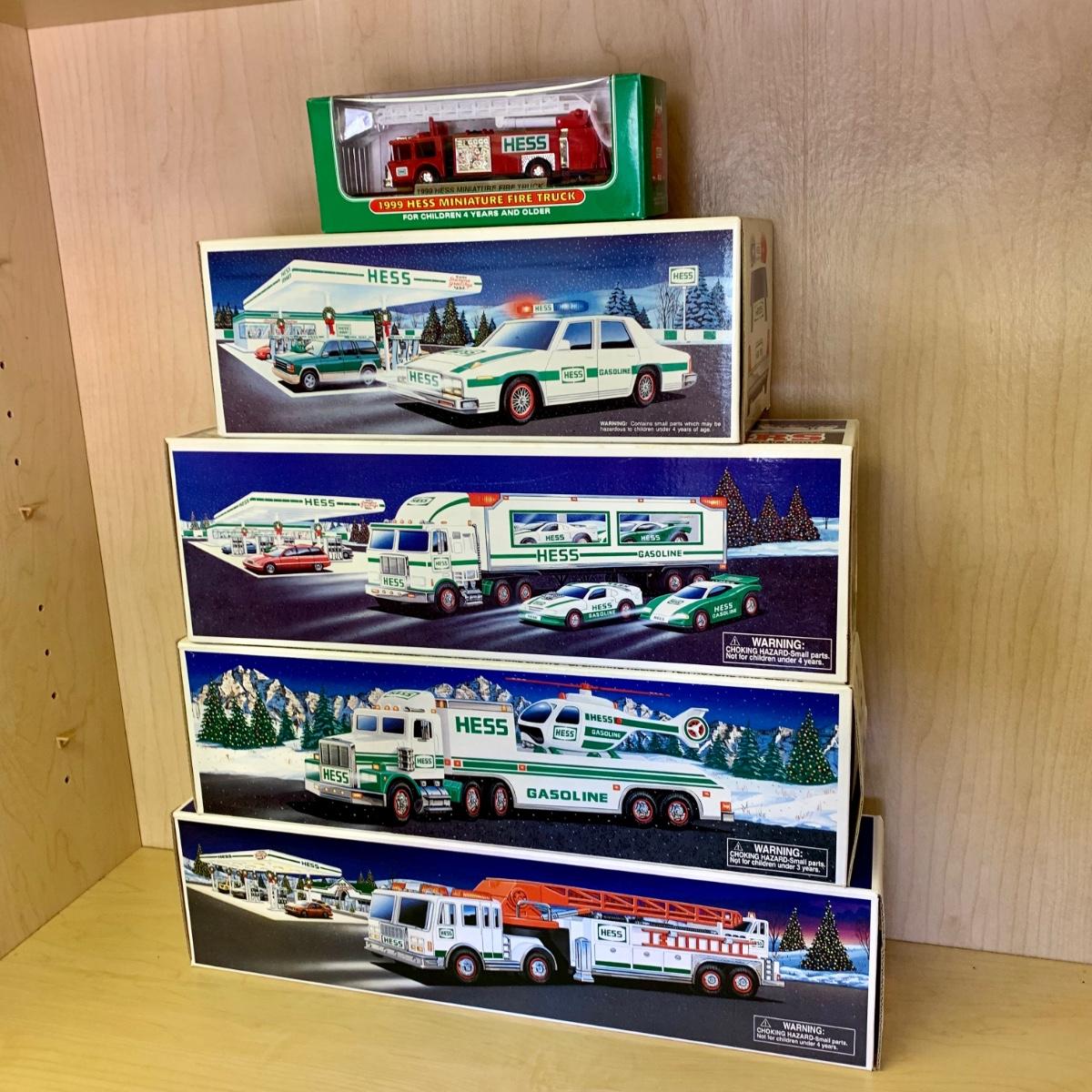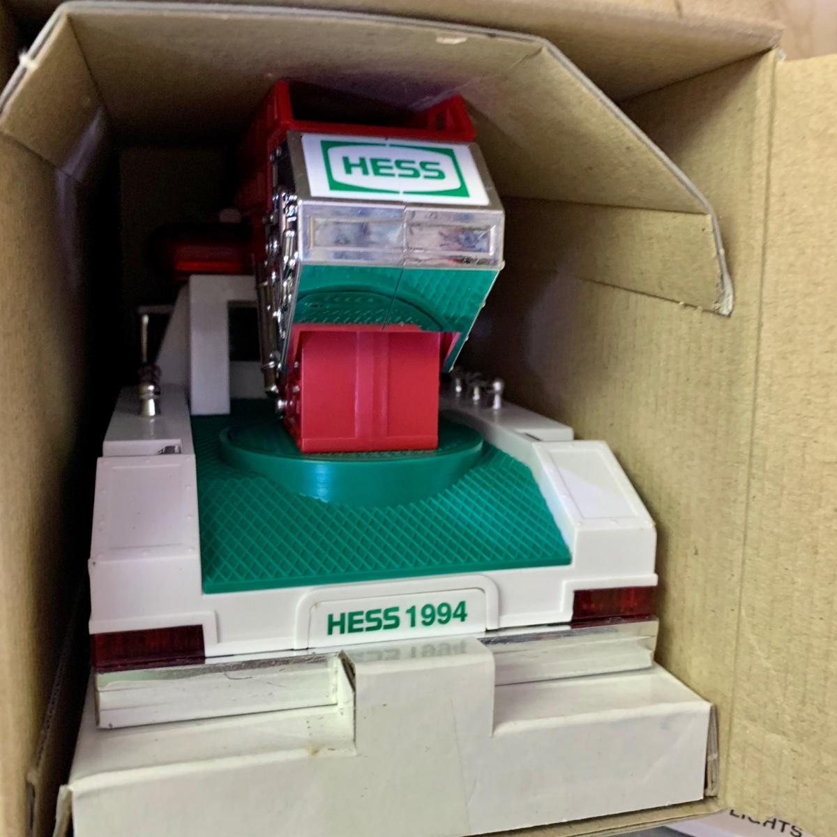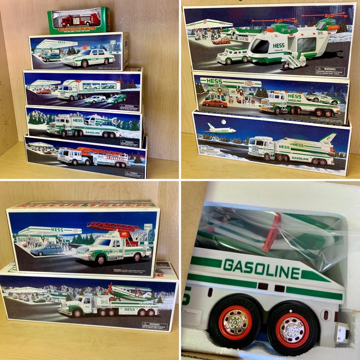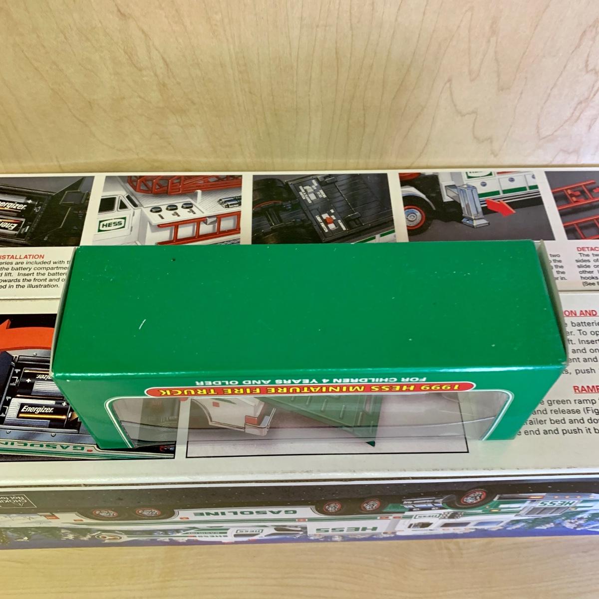 LOT 210: Hess Toy Truck Collection: 1999 Mini Fire Truck, Toy Truck And Helicopter, Toy Truck And Racers, Patrol Car, & More