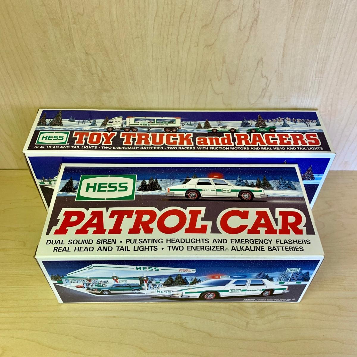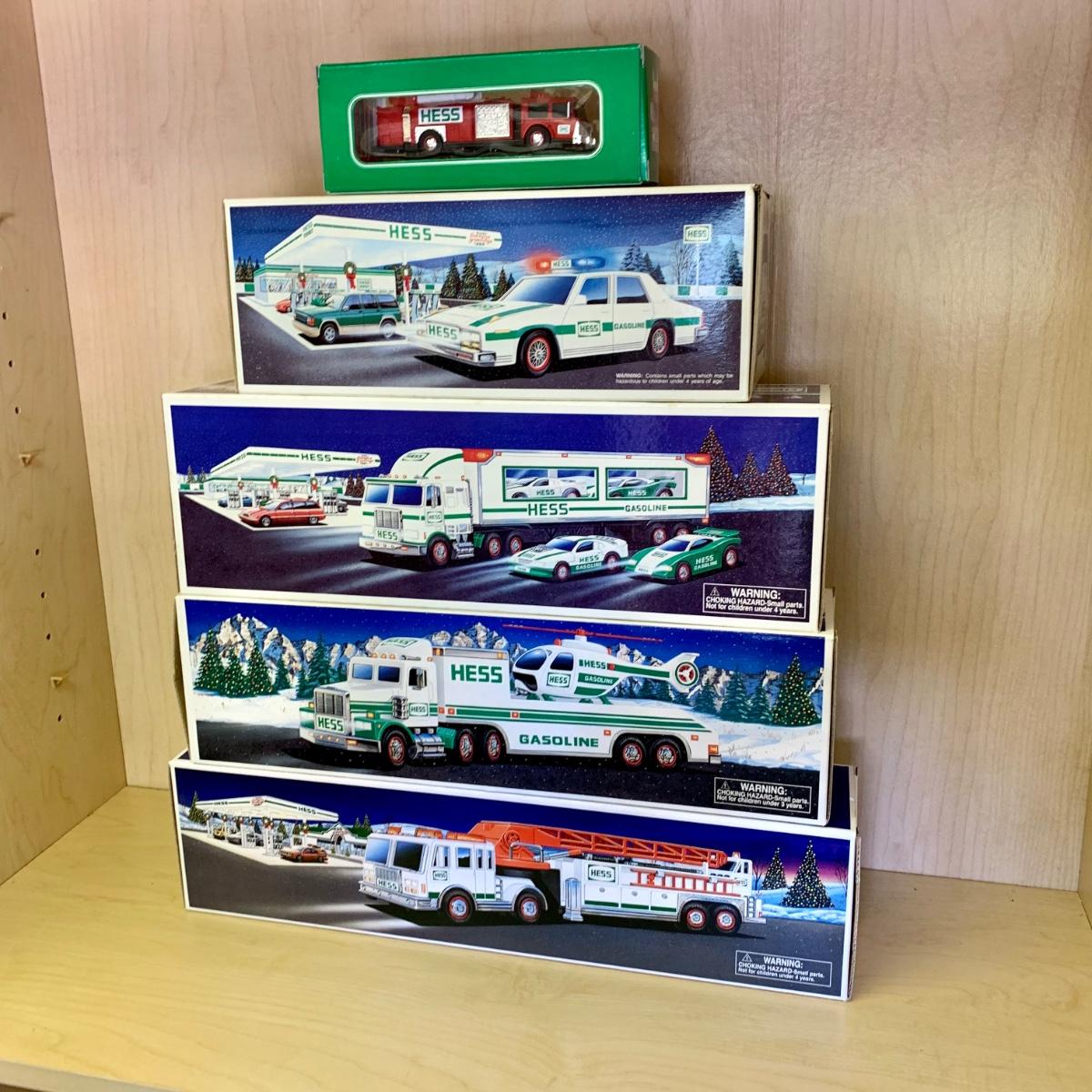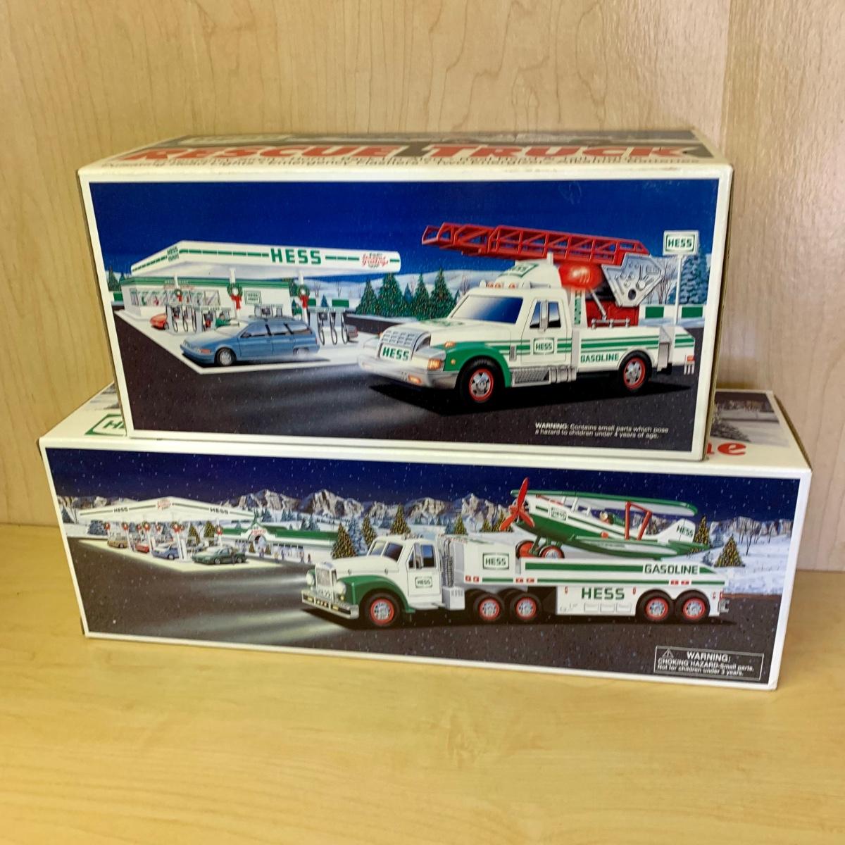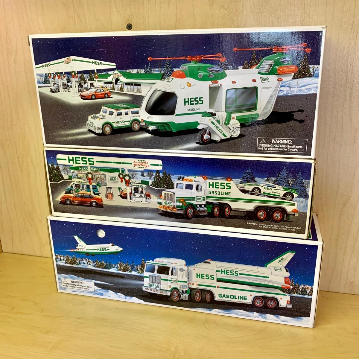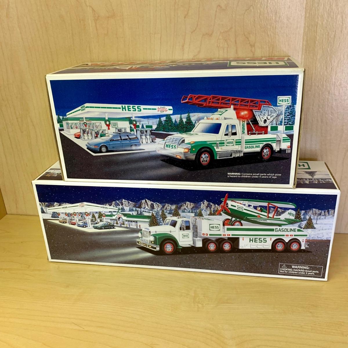LOT 210: Hess Toy Truck Collection: 1999 Mini Fire Truck, Toy Truck And Helicopter, Toy Truck And Racers, Patrol Car, & More