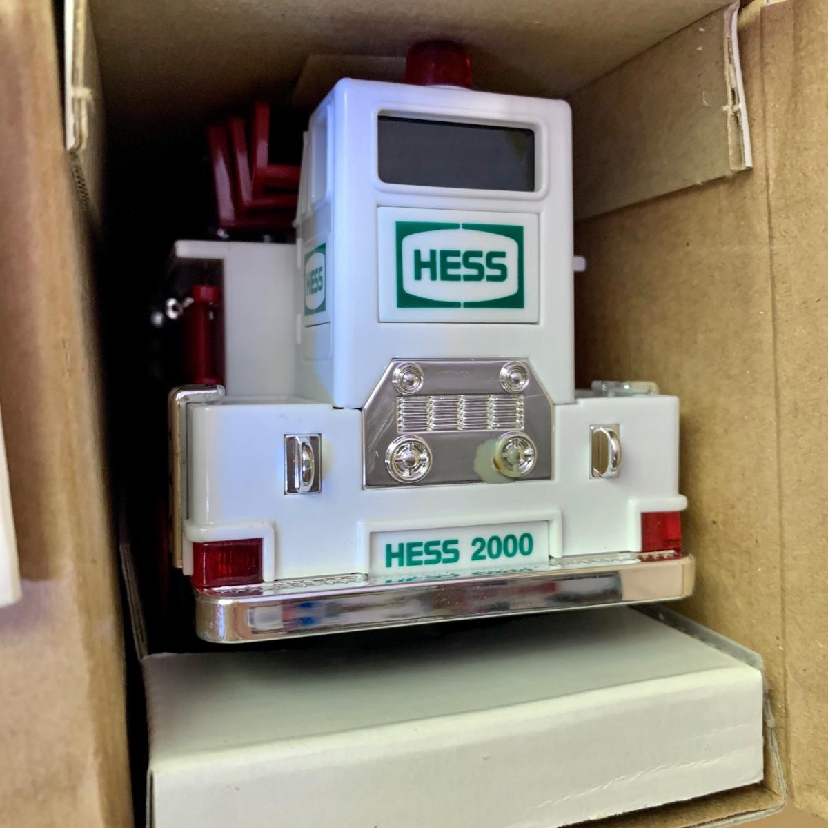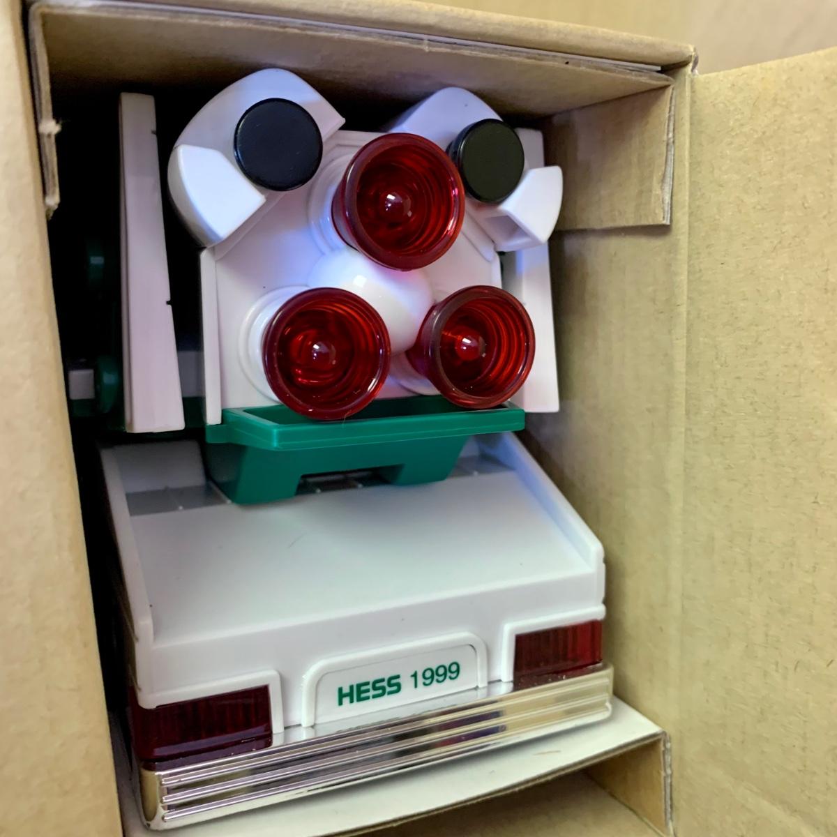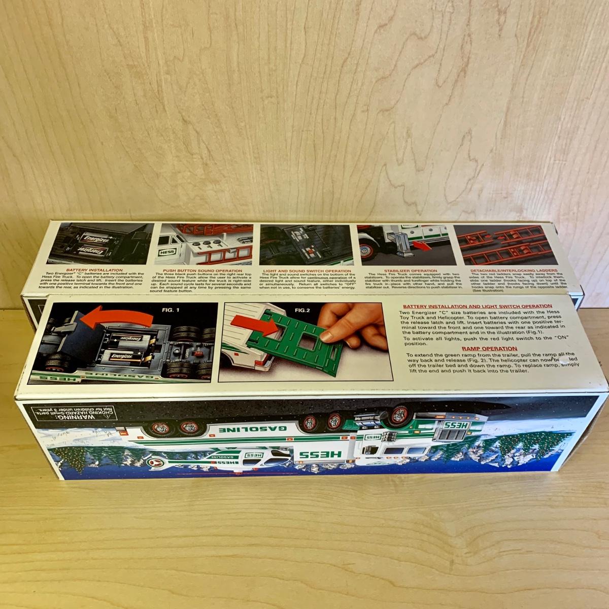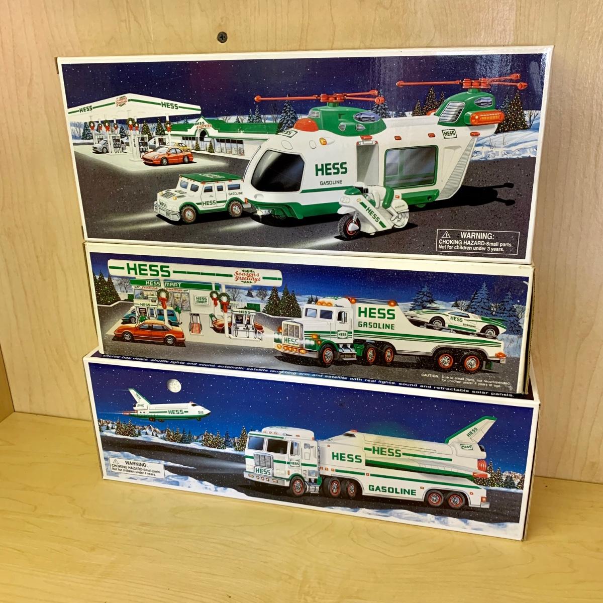 LOT 210: Hess Toy Truck Collection: 1999 Mini Fire Truck, Toy Truck And Helicopter, Toy Truck And Racers, Patrol Car, & More