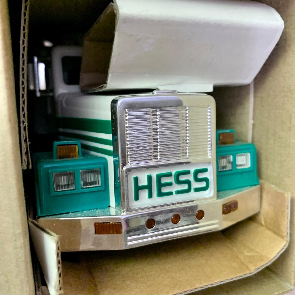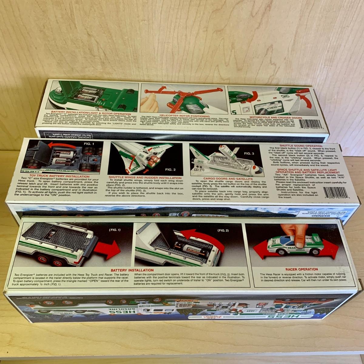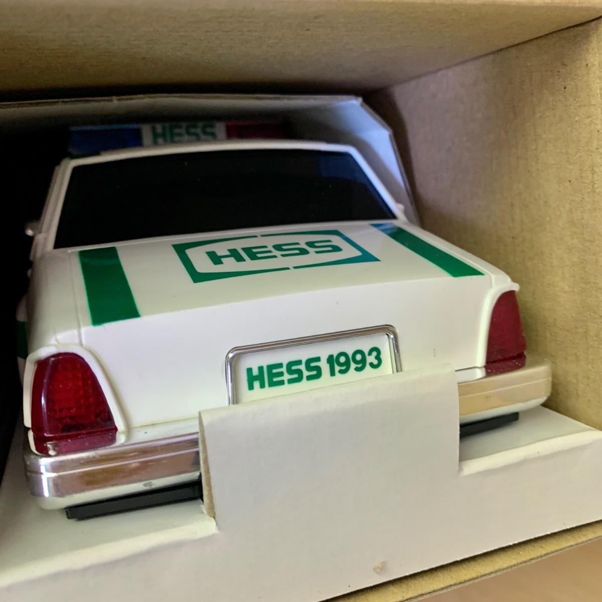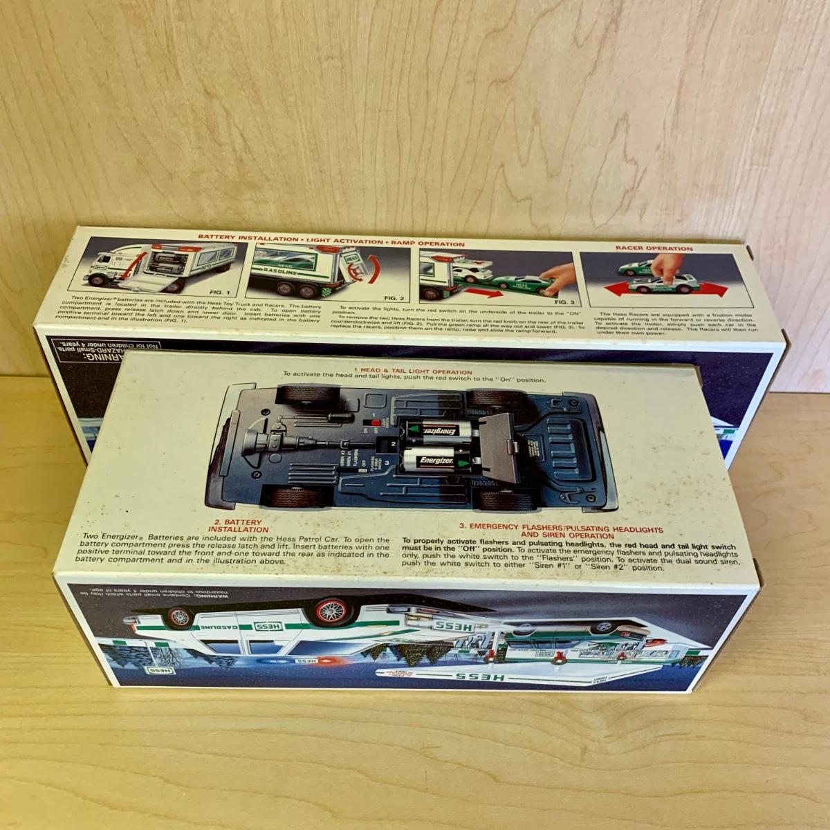 LOT 210: Hess Toy Truck Collection: 1999 Mini Fire Truck, Toy Truck And Helicopter, Toy Truck And Racers, Patrol Car, & More