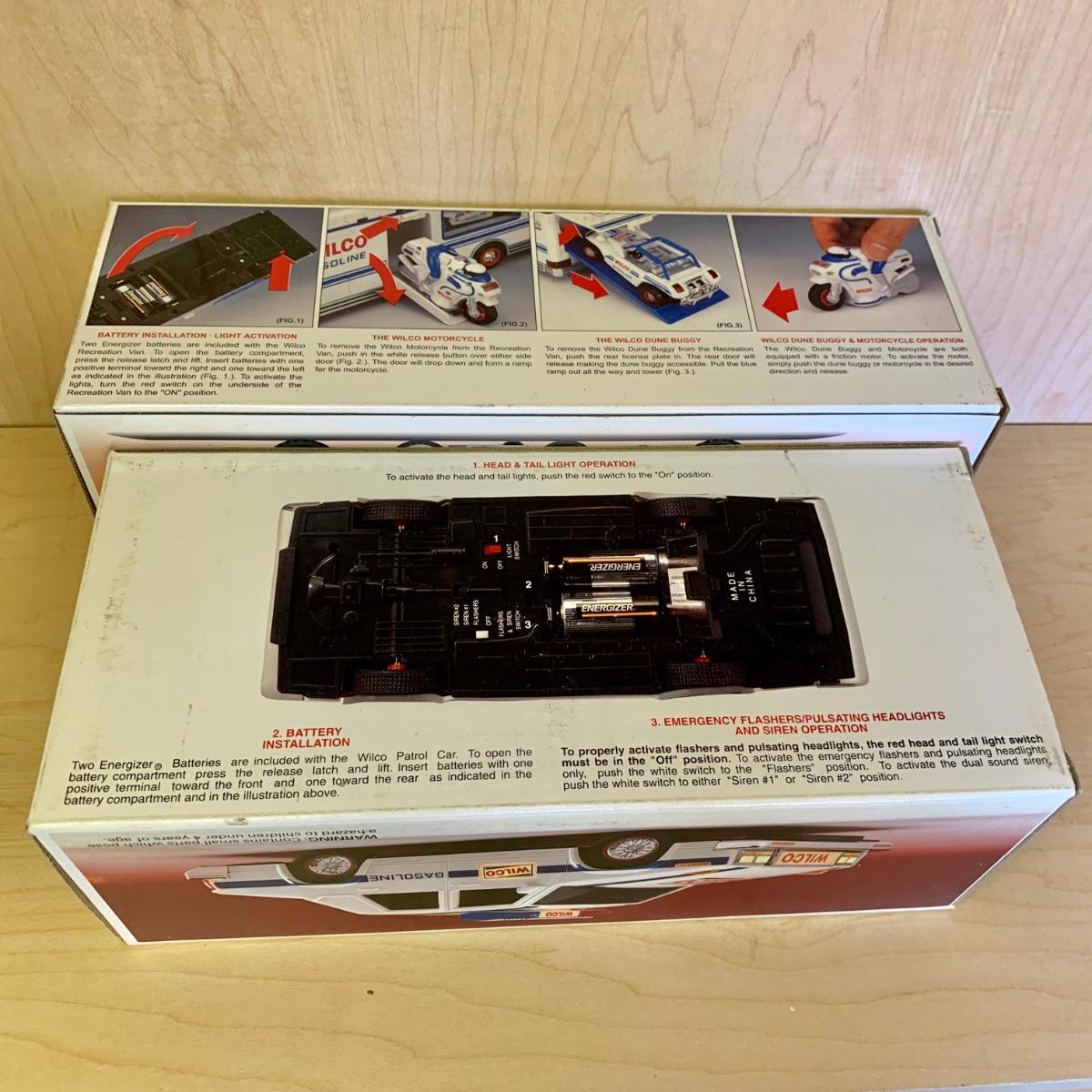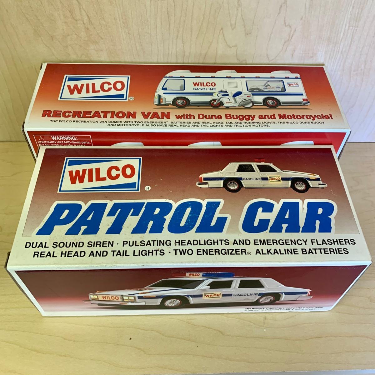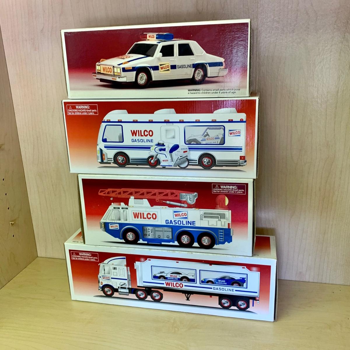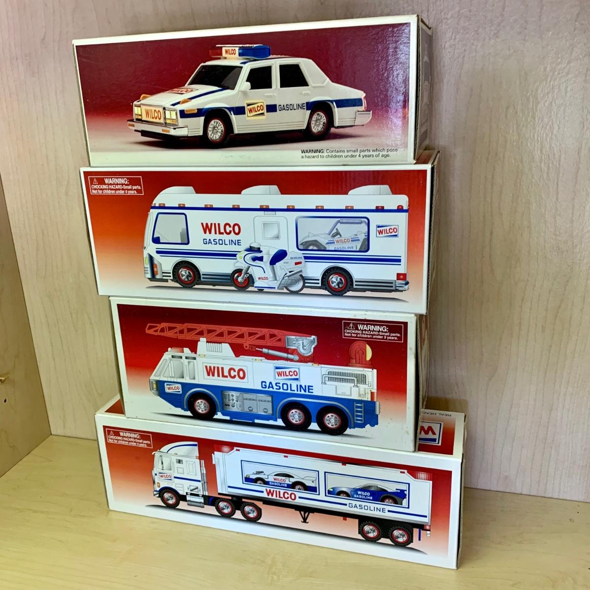 LOT 211: Wilco Toy Truck Collection: Patrol Car, Recreation Van With Dune Buggy And Motorcycle, Emergency Truck, & More