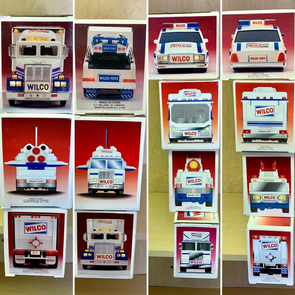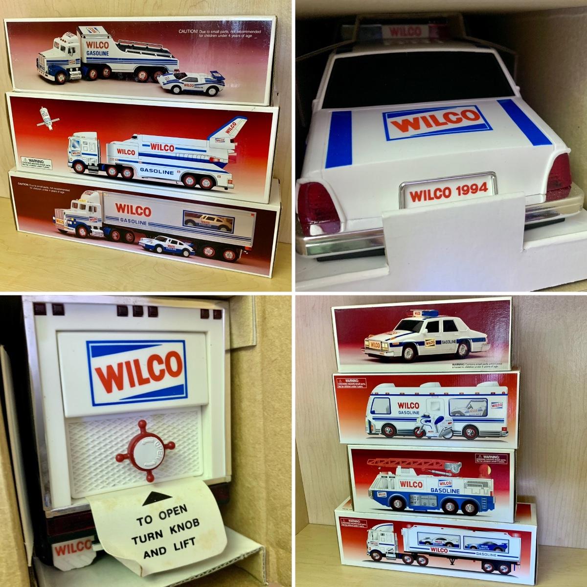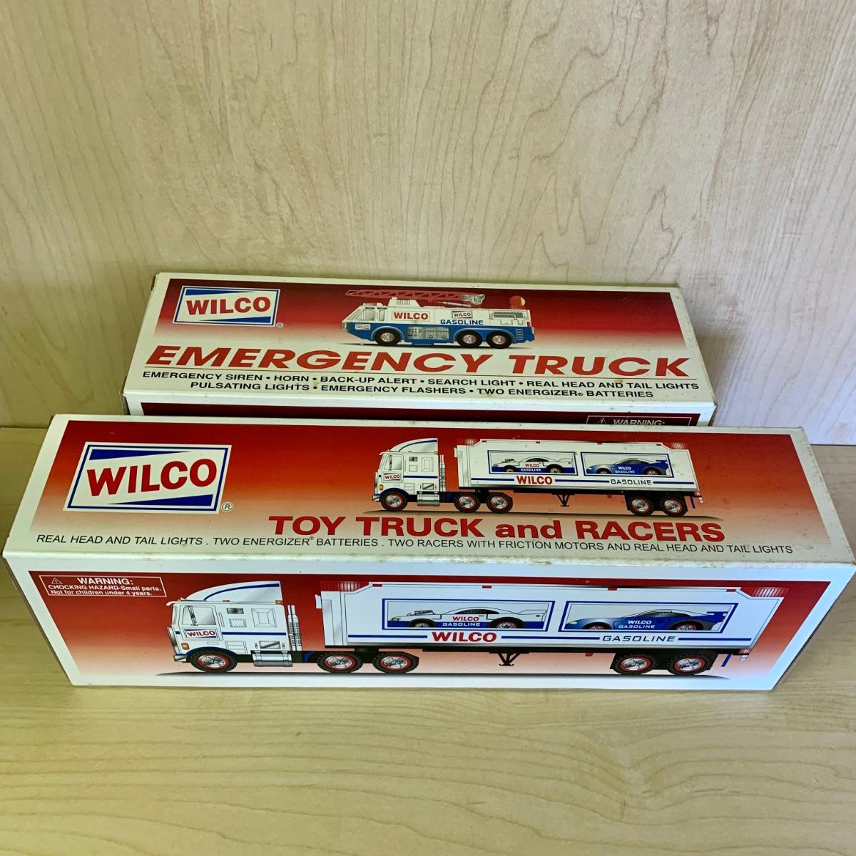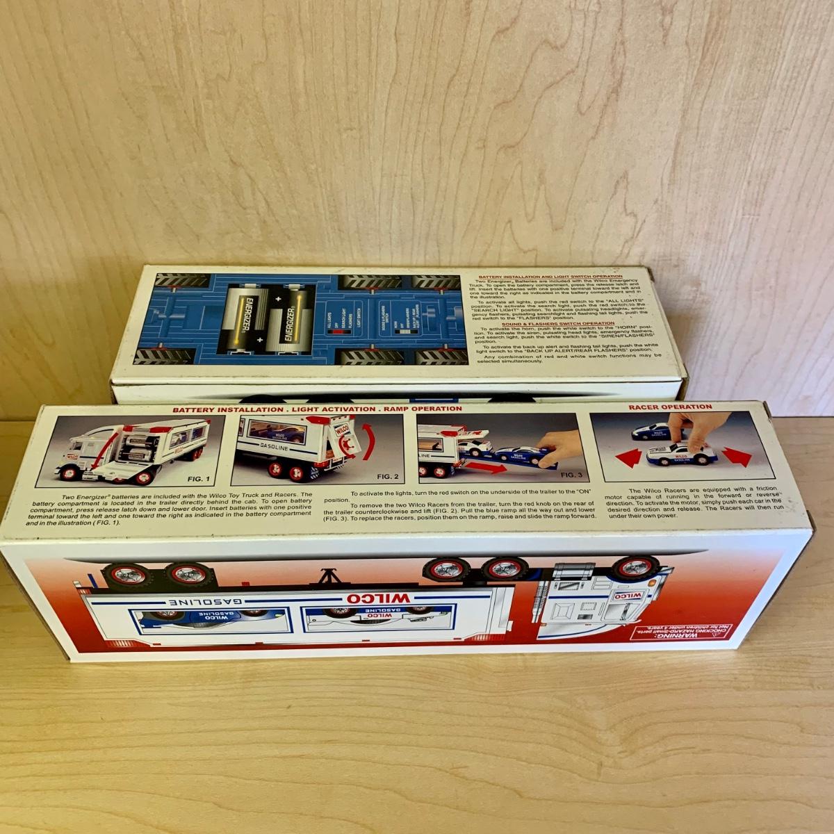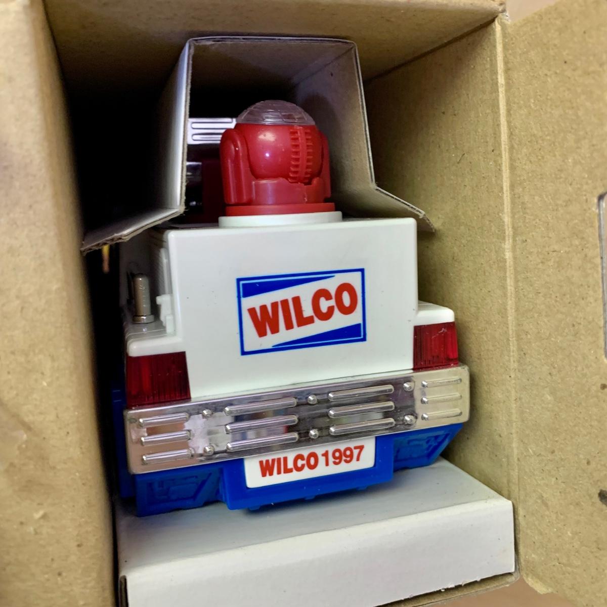 LOT 211: Wilco Toy Truck Collection: Patrol Car, Recreation Van With Dune Buggy And Motorcycle, Emergency Truck, & More